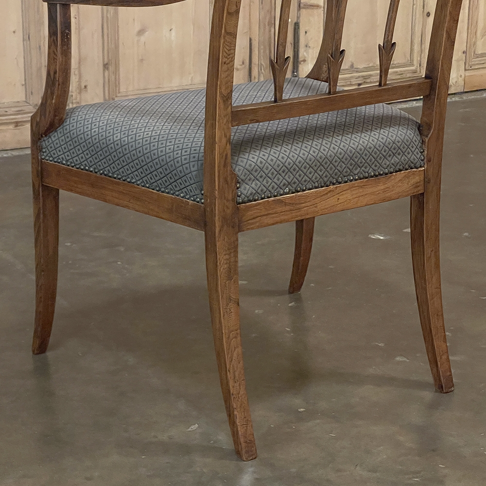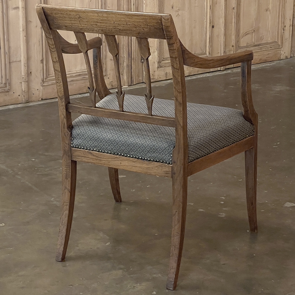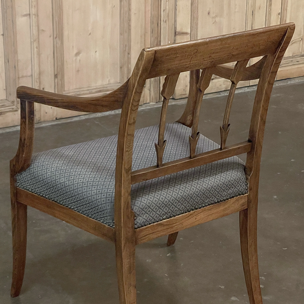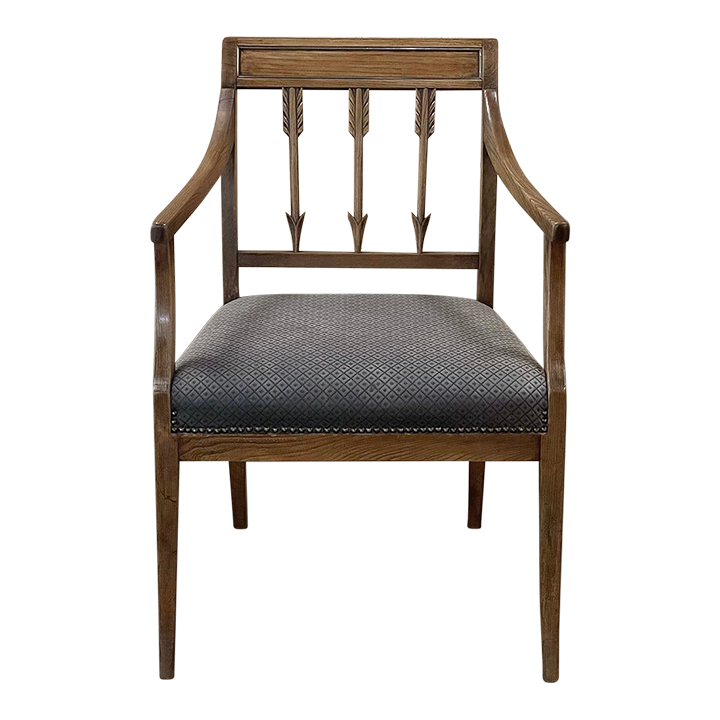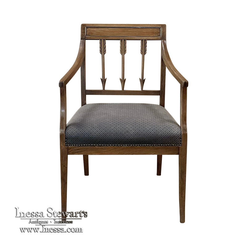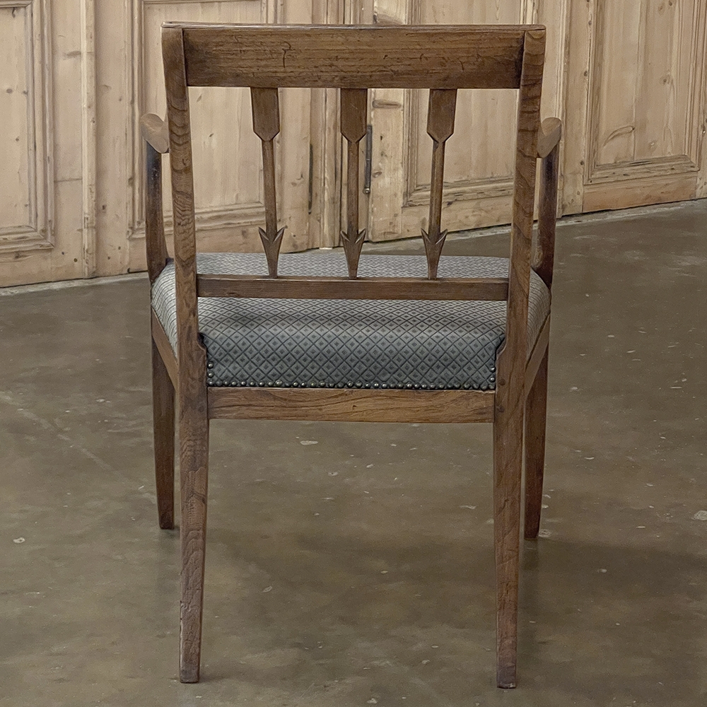 18th Century French Directoire Armchair is a relatively rare find, especially with this level of quality and preservation!  The diamond pattern mohair is of the best quality but showing its age, so probably best replaced in the near future.  The frames are solid sycamore, and feature double-pegged mortise & tenon joinery with swooping, elegant lines in the front legs, the armrests and the back uprights that transition into the back legs in one long crescent shape.  The seatback is the most visually striking aspect, with a panel across the top outlined in gold molding, and three arrows serving as the back splats.  The color and patina of the luxurious old-growth hardwood have remained intact and only add to the allure.