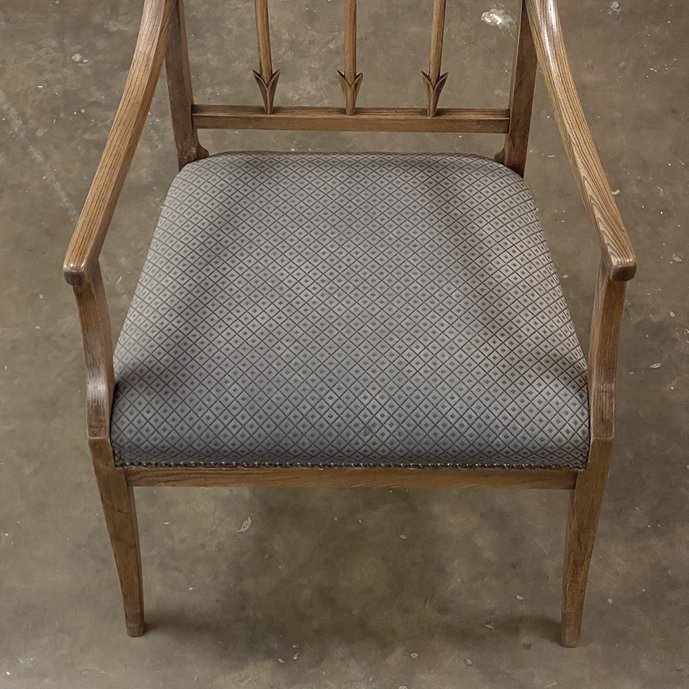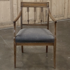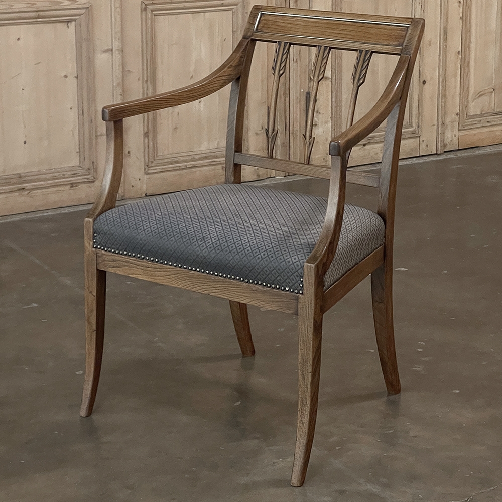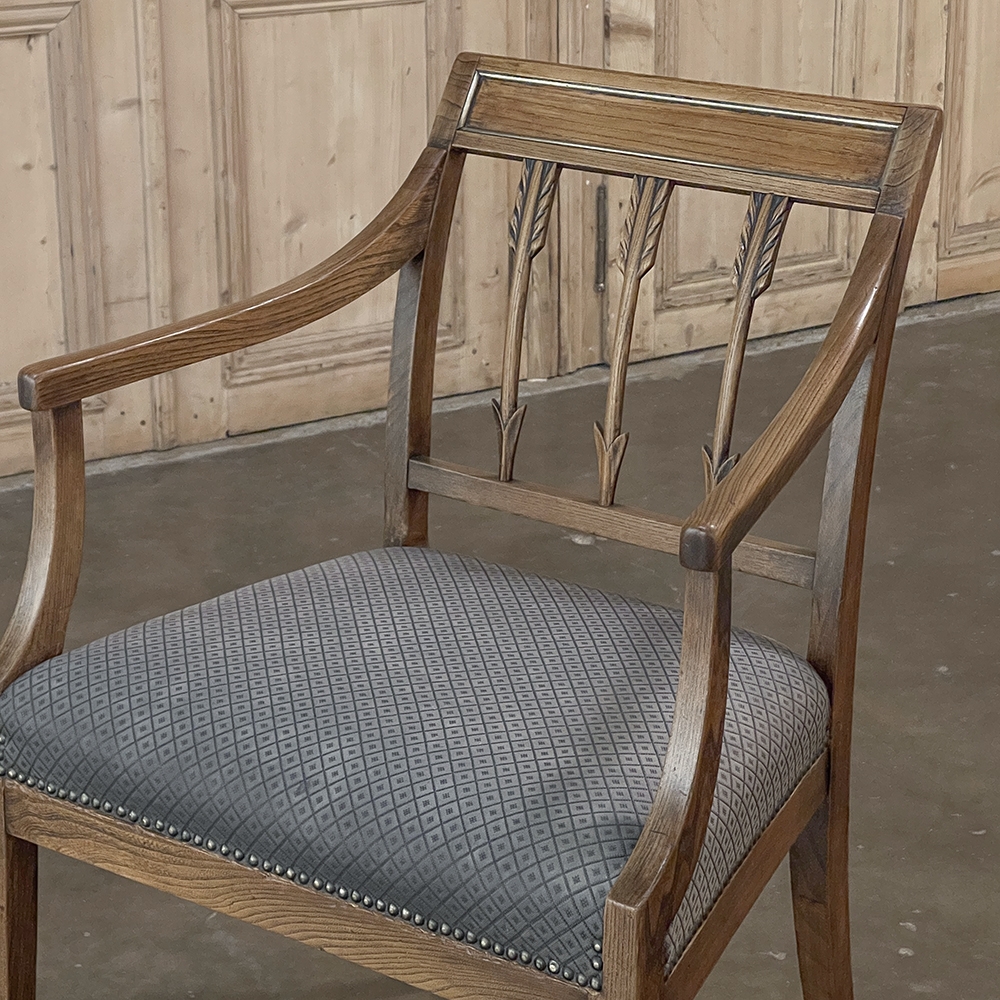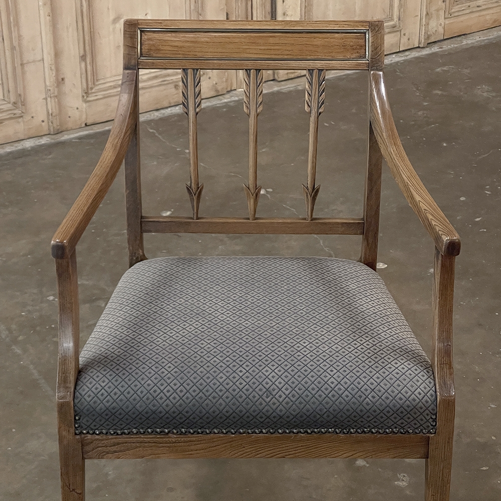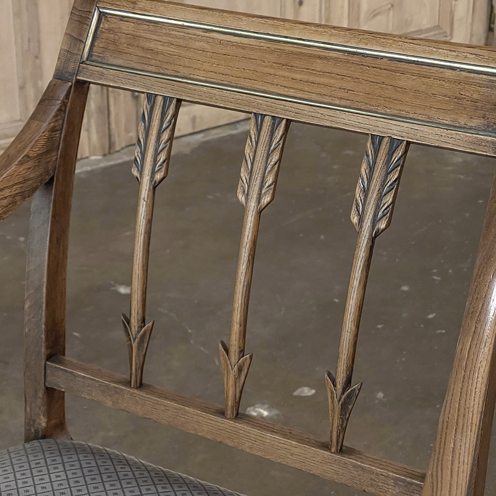 18th Century French Directoire Armchair is a relatively rare find, especially with this level of quality and preservation!  The diamond pattern mohair is of the best quality but showing its age, so probably best replaced in the near future.  The frames are solid sycamore, and feature double-pegged mortise & tenon joinery with swooping, elegant lines in the front legs, the armrests and the back uprights that transition into the back legs in one long crescent shape.  The seatback is the most visually striking aspect, with a panel across the top outlined in gold molding, and three arrows serving as the back splats.  The color and patina of the luxurious old-growth hardwood have remained intact and only add to the allure.