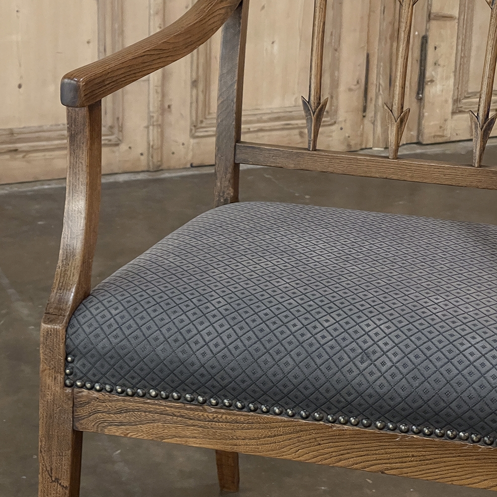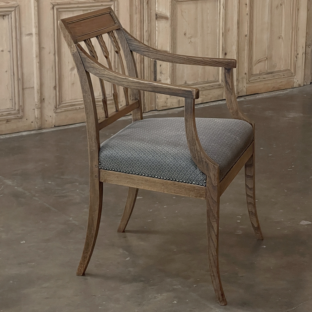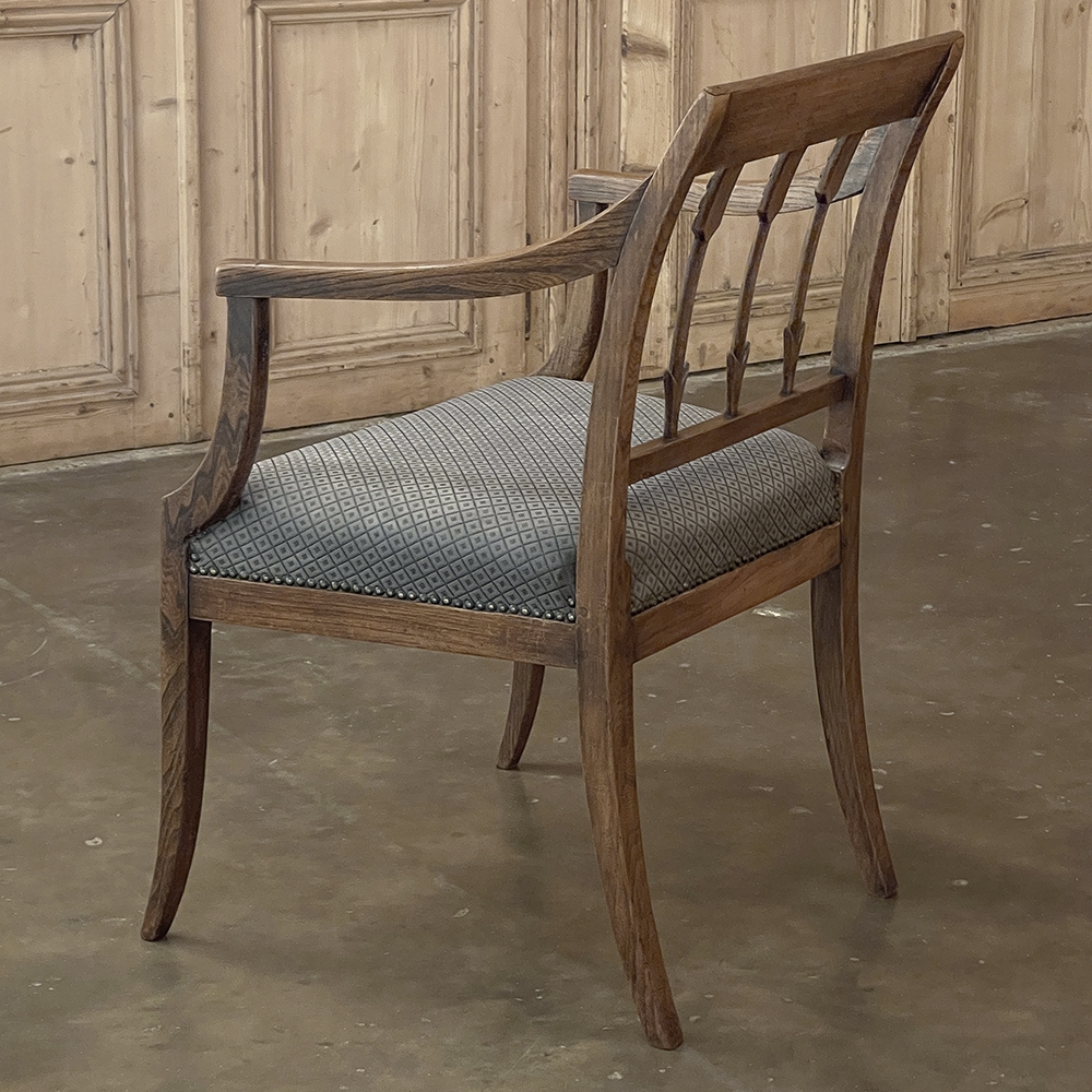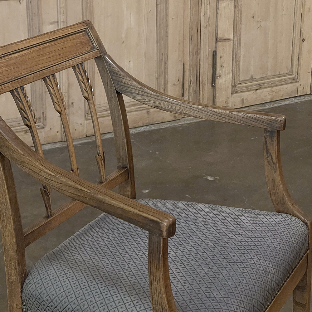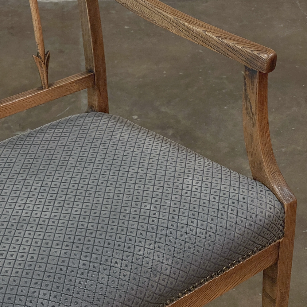 18th Century French Directoire Armchair is a relatively rare find, especially with this level of quality and preservation!  The diamond pattern mohair is of the best quality but showing its age, so probably best replaced in the near future.  The frames are solid sycamore, and feature double-pegged mortise & tenon joinery with swooping, elegant lines in the front legs, the armrests and the back uprights that transition into the back legs in one long crescent shape.  The seatback is the most visually striking aspect, with a panel across the top outlined in gold molding, and three arrows serving as the back splats.  The color and patina of the luxurious old-growth hardwood have remained intact and only add to the allure.