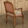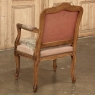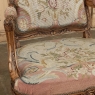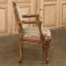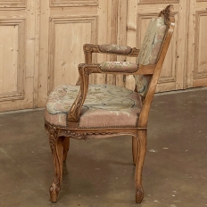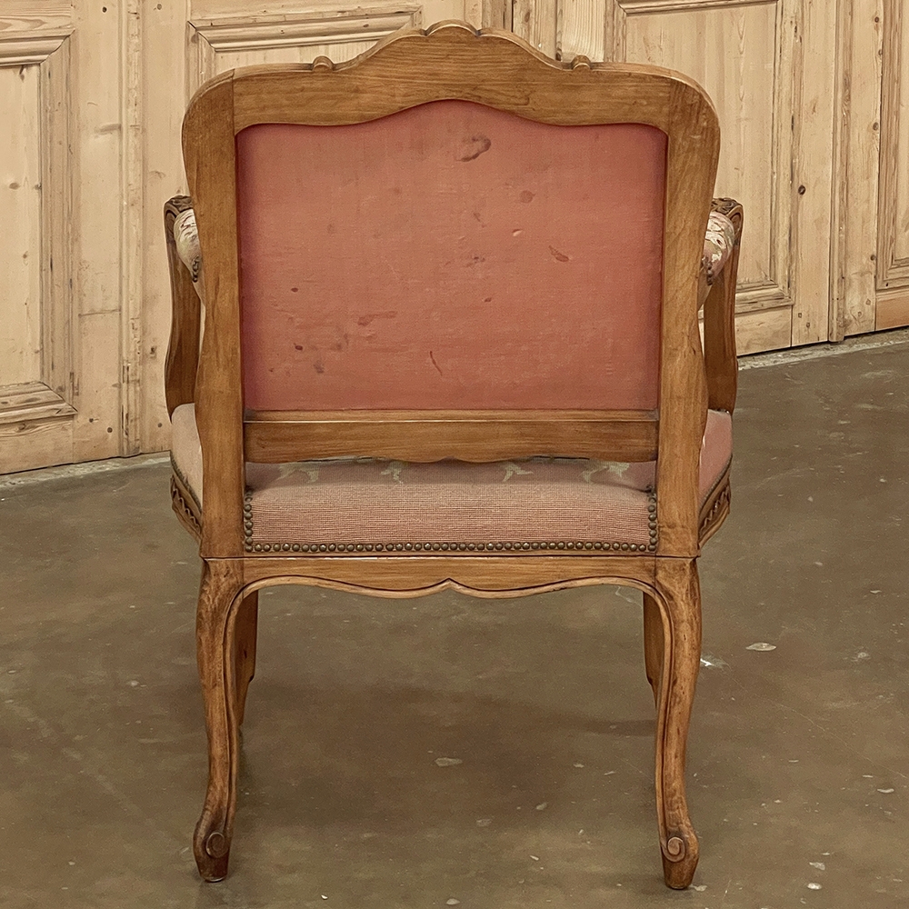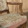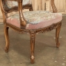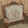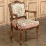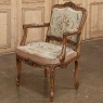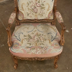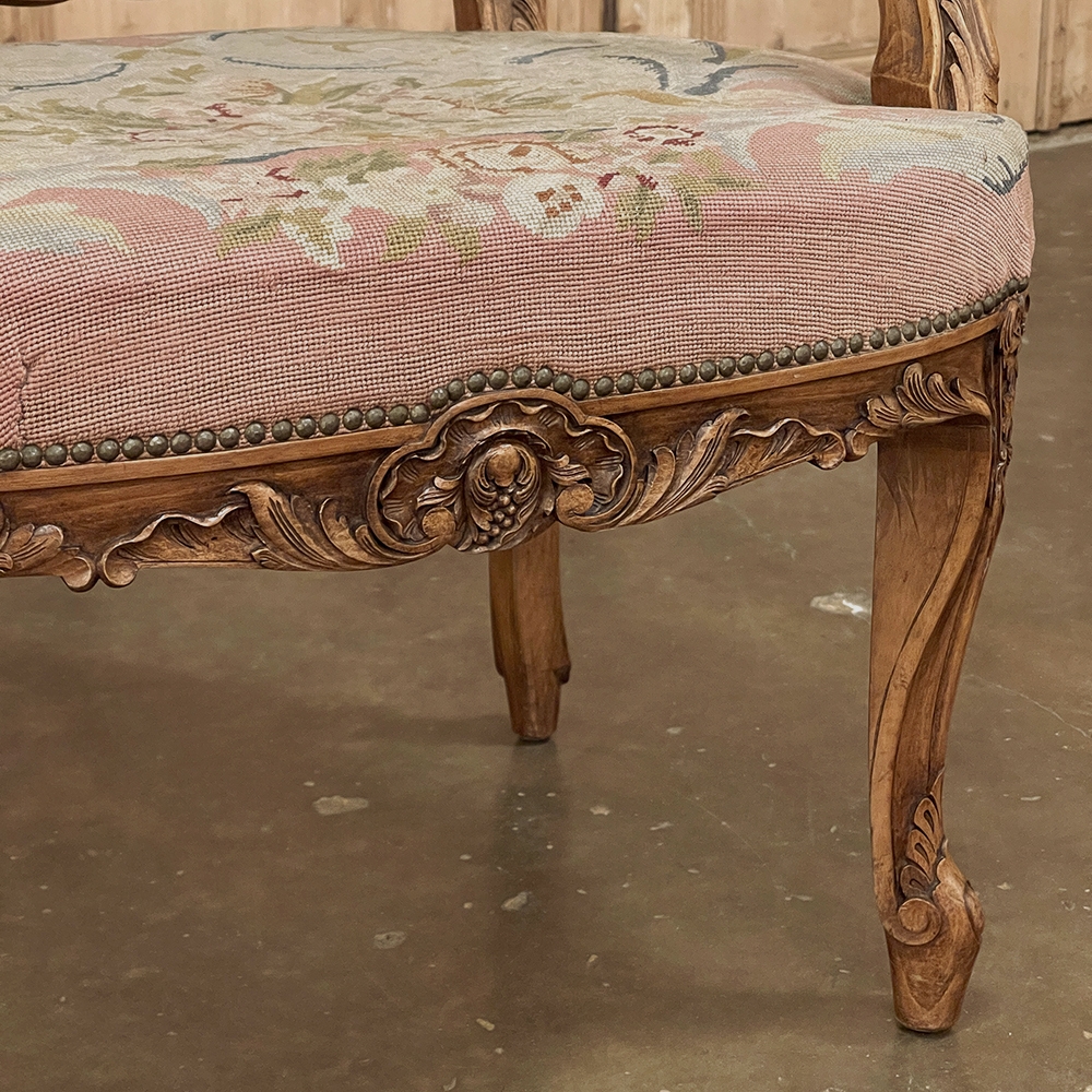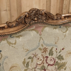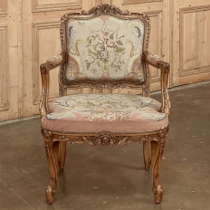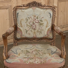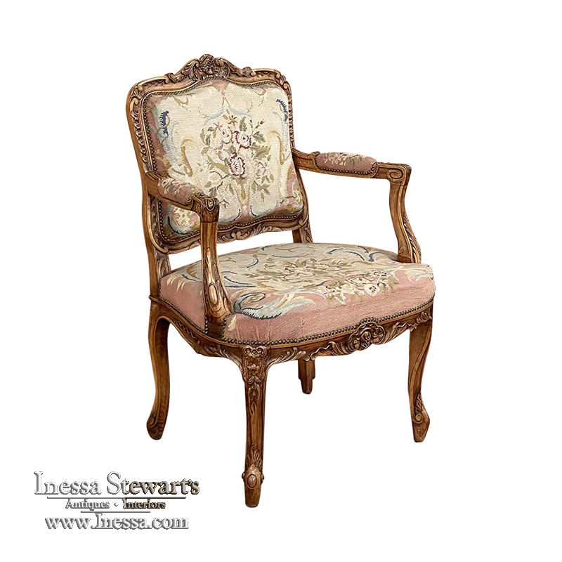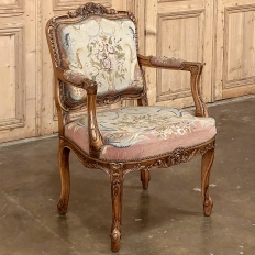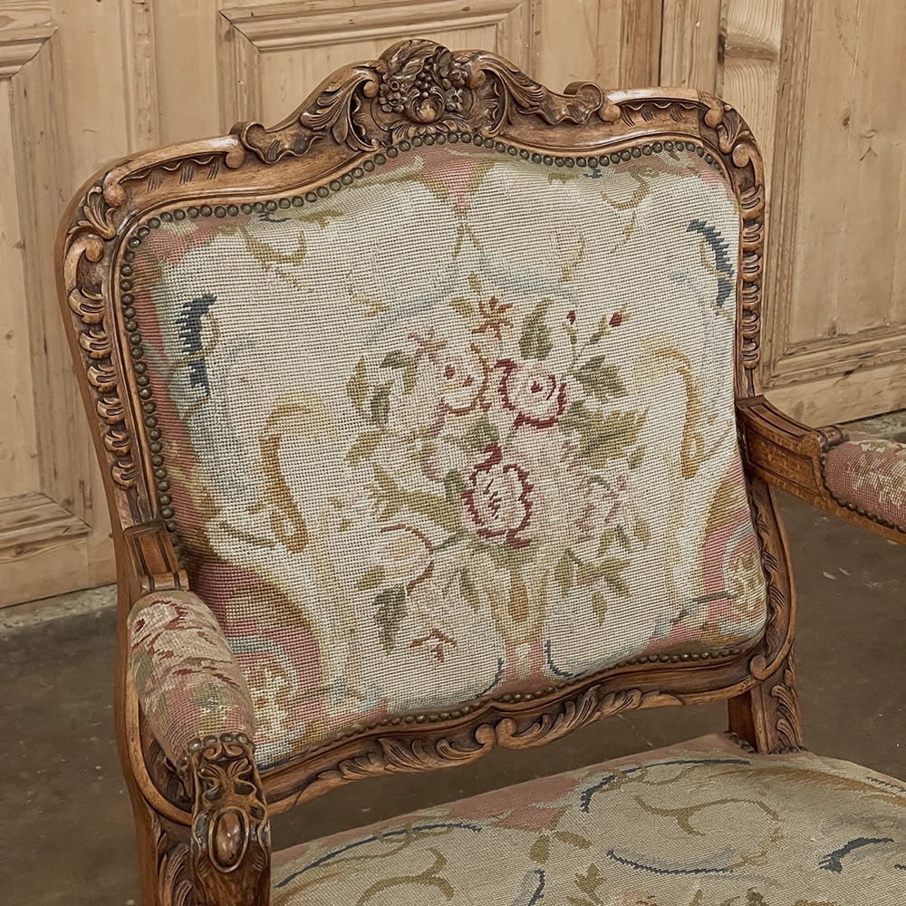 Sale19th Century French Louis XIV Walnut Armchair with Needlepoint Tapestry is a remarkable example of sculpture that also happens to be a comfortable chair! Hand-carved from select French blonde walnut, it features the boldly artistic stylings that are a hallmark of the Louis XIV genre, from the elegantly arched seatback carved with grapes, acanthus plumes and shells, with carvings extending around the entire perimeter of the seatback and even on the uprights joining it to the seat frame below. The gracefully formed armrests are padded, an also carved with classic embellishment. The apron is a work of art unto itself with more of the same theme on all three sides including the legs in front. All four legs are subtly scrolled and tipped with escargots. The upholstery is a distinctly separate work of art unto itself with the seat back, seat and armrest pads all exhibiting an incredibly skilled and artistic rendering of floral and foliate designs that perfectly meld with the framework to create a showcase piece that will draw the admiration of all who enter the room!