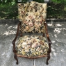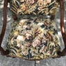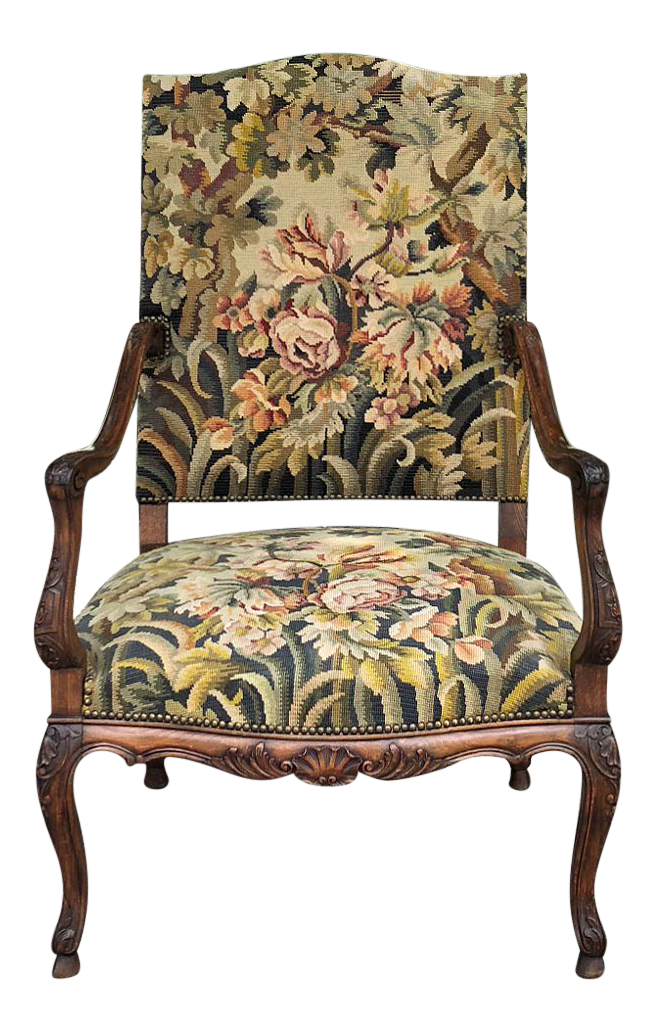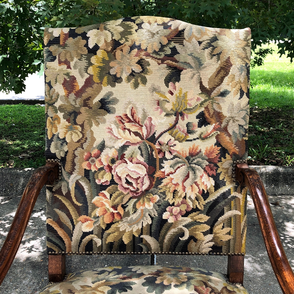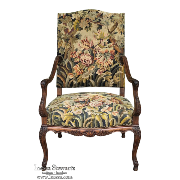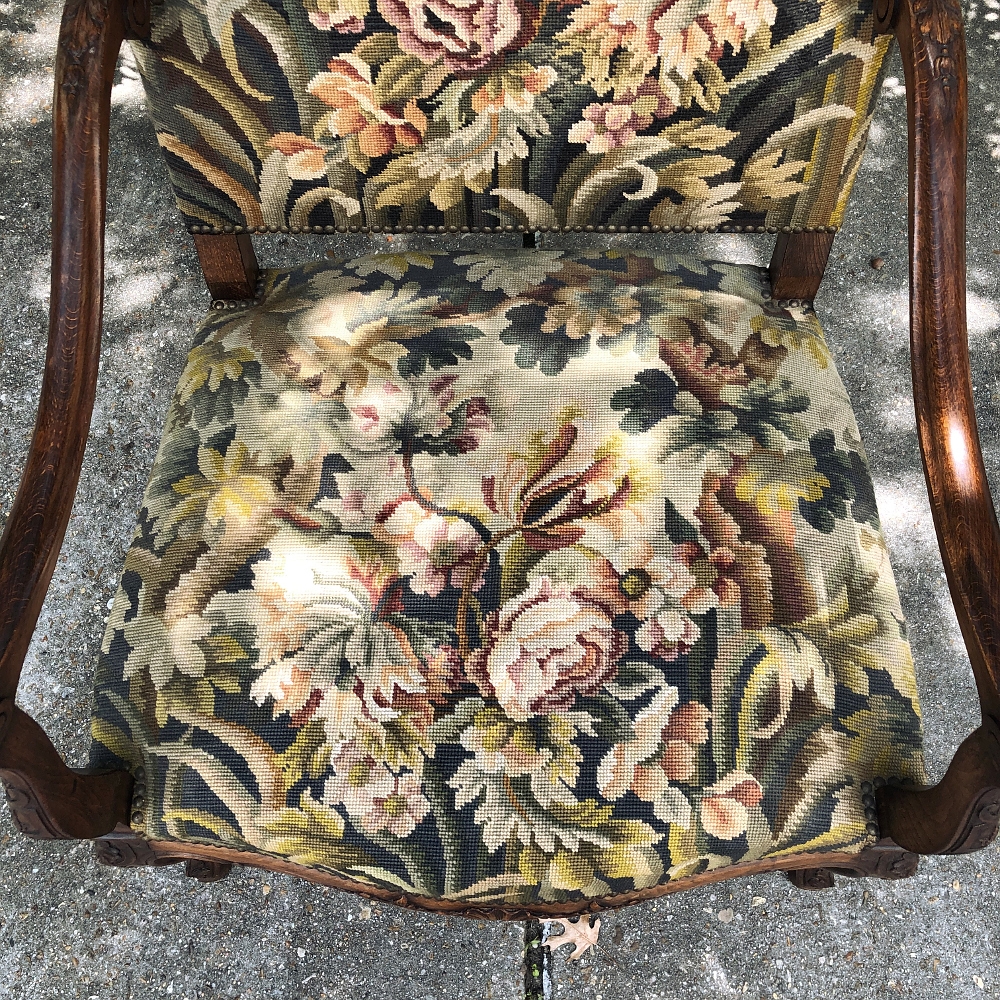 19th Century French Louis XV Fruitwood Armchair ~ Fauteuil with Needlepoint Tapestry is a remarkable example of expert craftsmanship melded with extraordinary artistry! Utilizing selected fruitwood, the craftsmen sculpted naturalistic and sinuous curvatures into what we call today "French scrolls" for the armrests, armrest supports, apron and even the cabriole legs. Then, the sculptor lavished the entire framework with stylized shell, and foliate motifs, including a prominent scallop centered on the front apron. Acanthus flourishes emanate upwards from the feet. The seatback and seat are both generously sized for comfort, then upholstered in lavishly fabricated needlepoint tapestry in a rich, lush floral and foliate pattern that remains as colorful today as it did when made, indicating an extraordinary degree of care taken with this beautiful armchair over the last century!