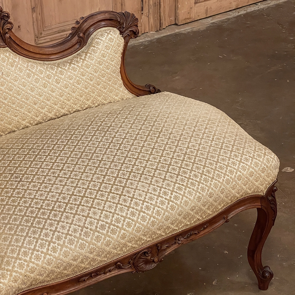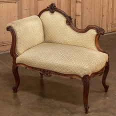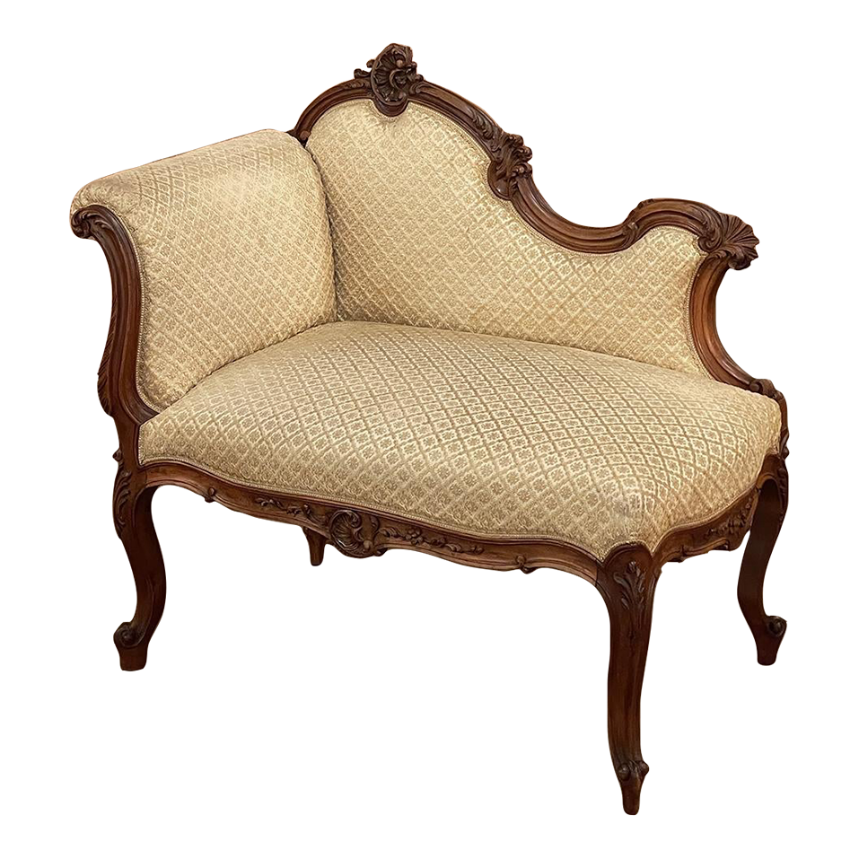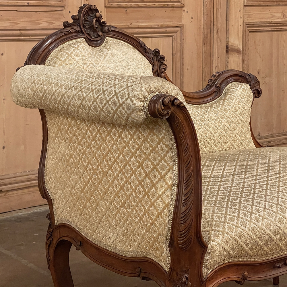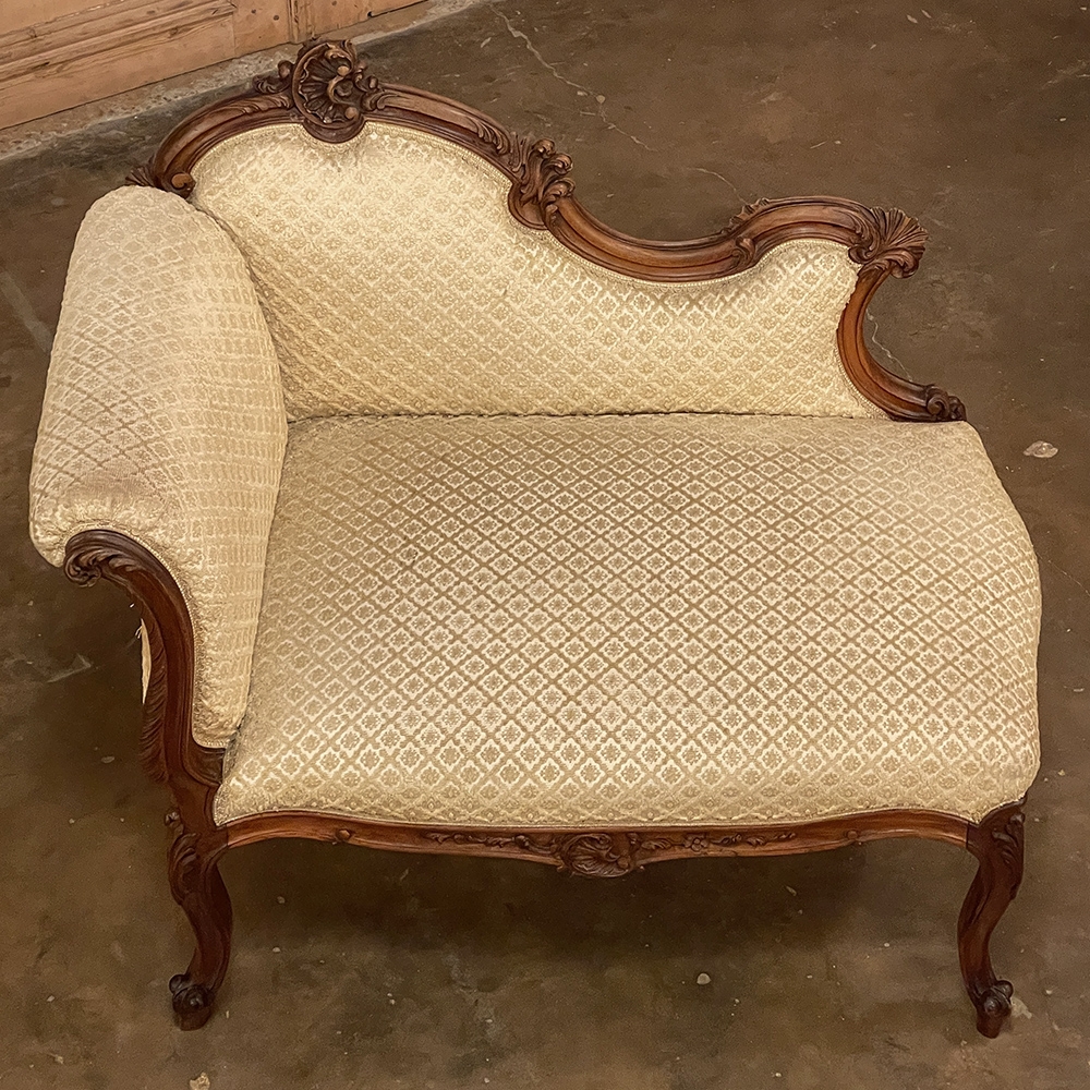 19th Century French Louis XV Walnut Petite Chaise Lounge is the perfect choice for adding incredible French flair in a diminutive, cozy spot! Sculpted from sumptuous French walnut, the framework exhibits the naturalistic, asymmetrical scrollwork characteristic of the genre, with carved shell and foliates providing visual allure from the crown to the escargots on the feet. Acanthus plumes, wildflowers and foliate sprays dominate the carved relief work, all made more exquisite from being sculpted out of the beautiful wood. Upholstery is a fine, tightly knit damascene, and is in very good condition, with a neutral color that makes this a good candidate for placement anywhere in the home to enjoy for the rest of your life!