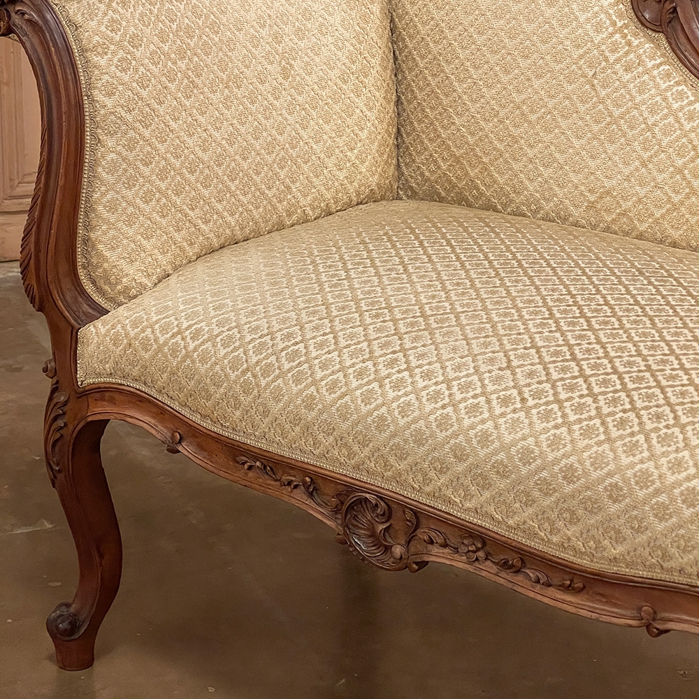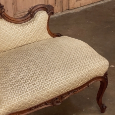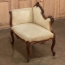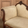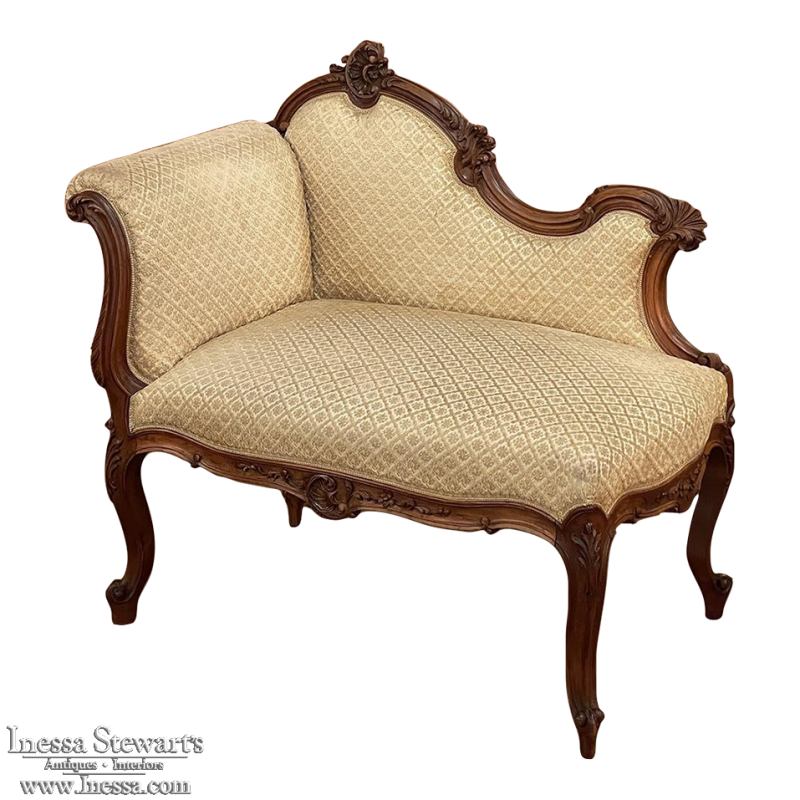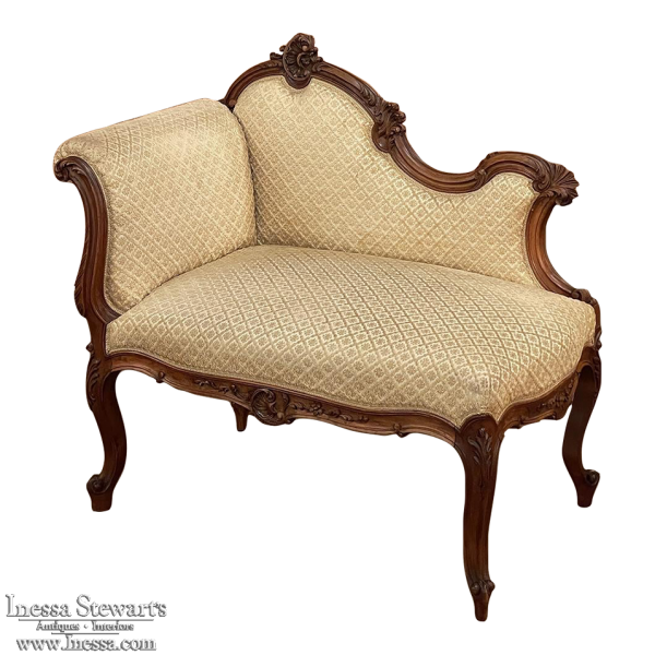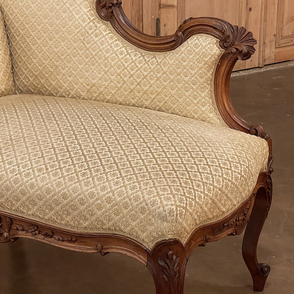 19th Century French Louis XV Walnut Petite Chaise Lounge is the perfect choice for adding incredible French flair in a diminutive, cozy spot! Sculpted from sumptuous French walnut, the framework exhibits the naturalistic, asymmetrical scrollwork characteristic of the genre, with carved shell and foliates providing visual allure from the crown to the escargots on the feet. Acanthus plumes, wildflowers and foliate sprays dominate the carved relief work, all made more exquisite from being sculpted out of the beautiful wood. Upholstery is a fine, tightly knit damascene, and is in very good condition, with a neutral color that makes this a good candidate for placement anywhere in the home to enjoy for the rest of your life!