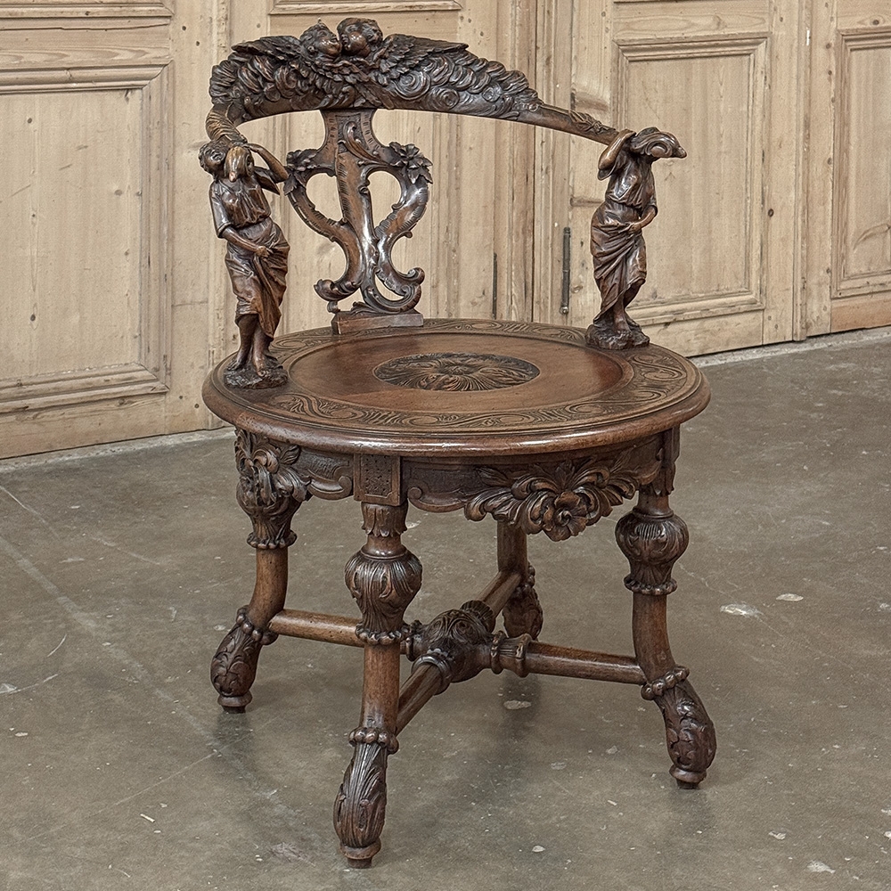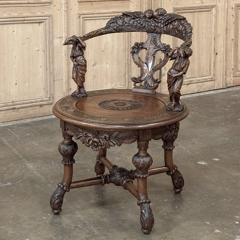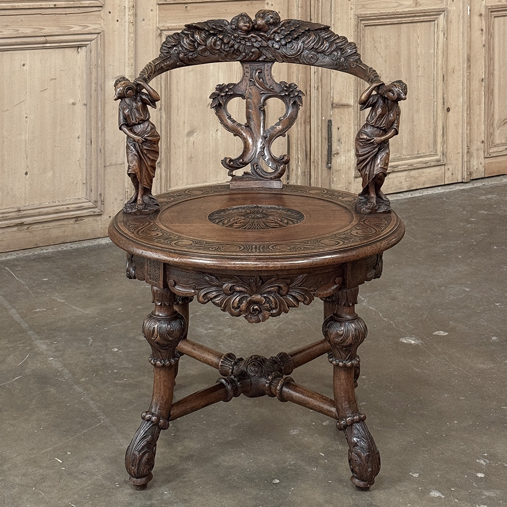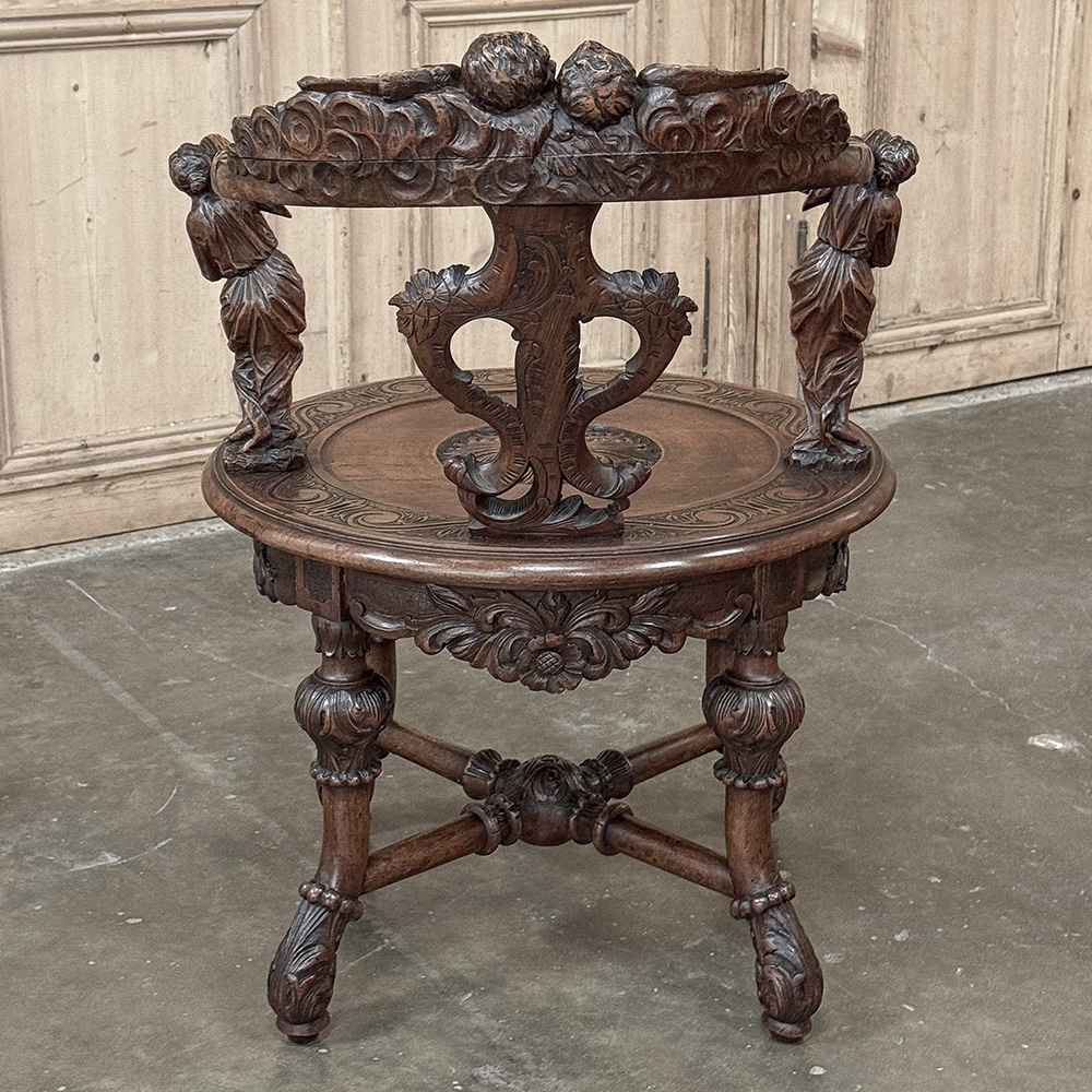 19th Century Italian Renaissance Revival Walnut Swiveling Desk Chair is more artistic sculpture than mere furniture! Hand-carved from solid walnut, it features a circular seat that swivels 360 degrees without raising or lowering. The seat is also carved with bas relief rosette and foliate bordering. The seatback and armrests, however, are immediately captivating, with smiling maidens providing support to the armrests that wrap around in an ox yoke form culminating in a pair of winged cherubs at the crest floating in billowing clouds. The center stanchion is heart-shaped and carved in a naturalistic form. A boldly scrolled apron is carved all around, and supported by four sturdy hand-carved legs connected by turned stretchers, ending in scrolled feet carved with acanthus plumes. The combination of form and function is truly incredible to behold!