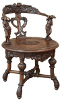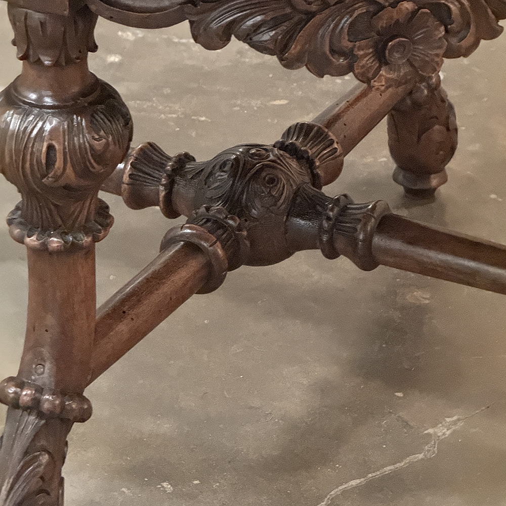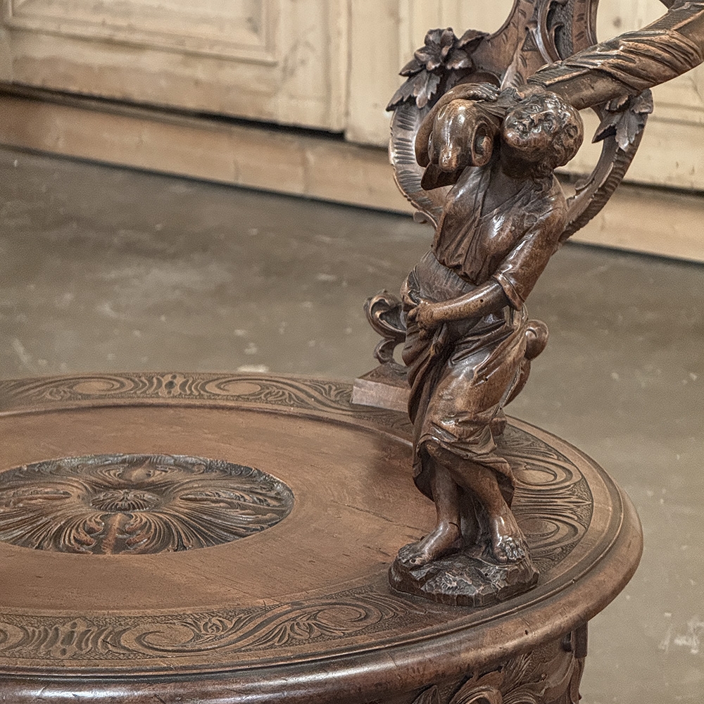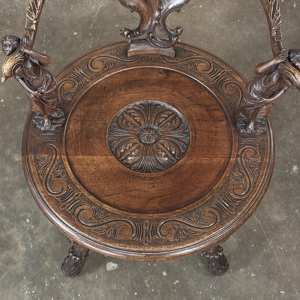 19th Century Italian Renaissance Revival Walnut Swiveling Desk Chair is more artistic sculpture than mere furniture! Hand-carved from solid walnut, it features a circular seat that swivels 360 degrees without raising or lowering. The seat is also carved with bas relief rosette and foliate bordering. The seatback and armrests, however, are immediately captivating, with smiling maidens providing support to the armrests that wrap around in an ox yoke form culminating in a pair of winged cherubs at the crest floating in billowing clouds. The center stanchion is heart-shaped and carved in a naturalistic form. A boldly scrolled apron is carved all around, and supported by four sturdy hand-carved legs connected by turned stretchers, ending in scrolled feet carved with acanthus plumes. The combination of form and function is truly incredible to behold!