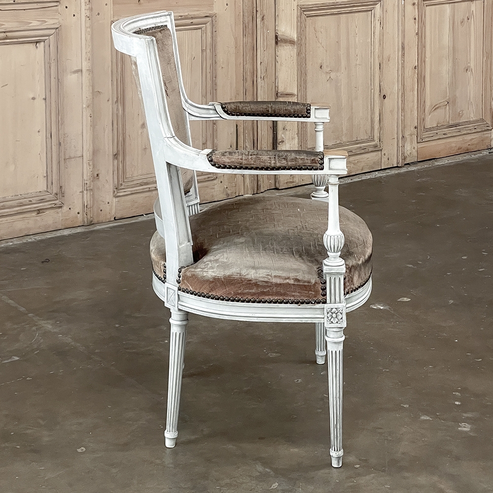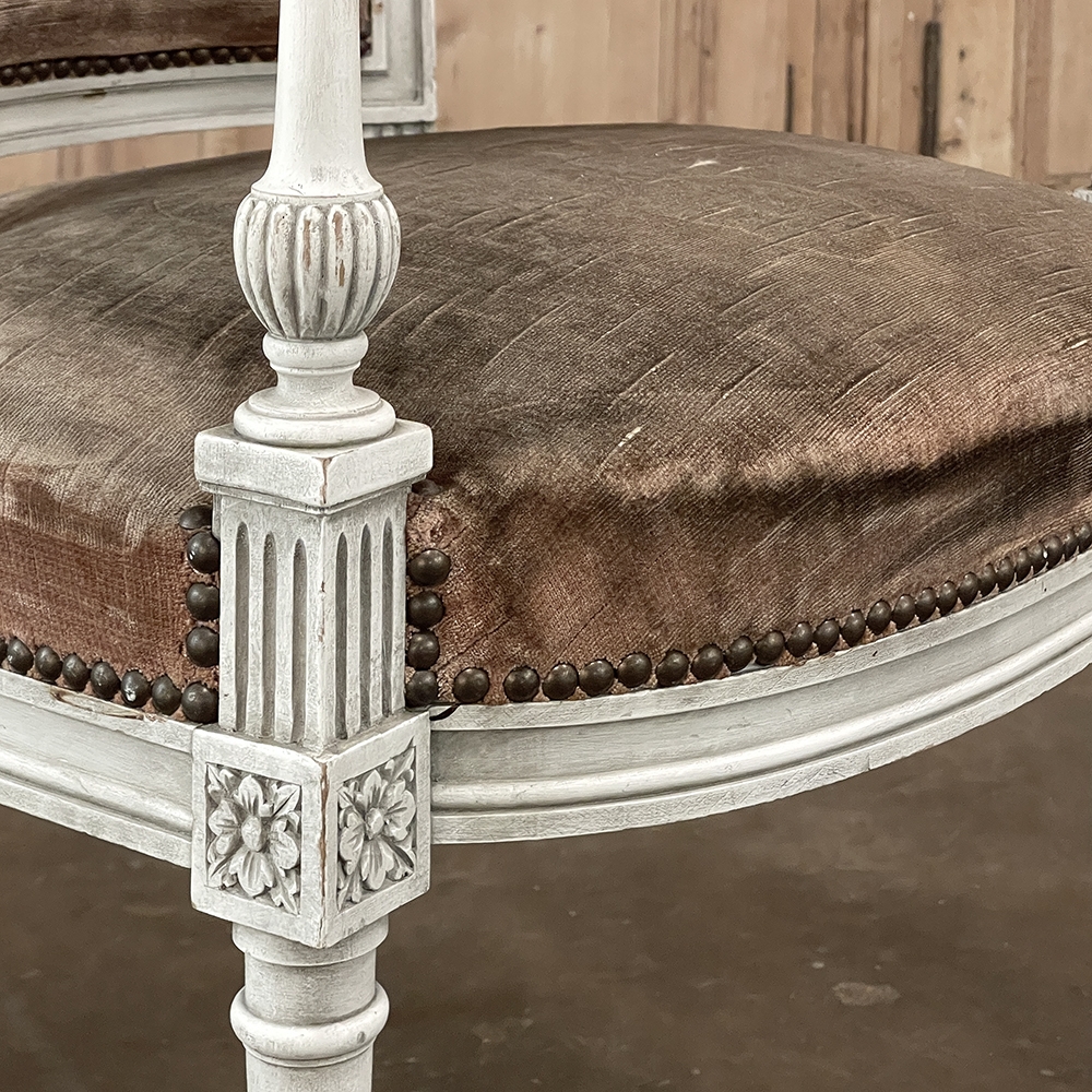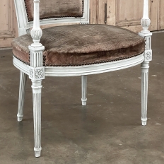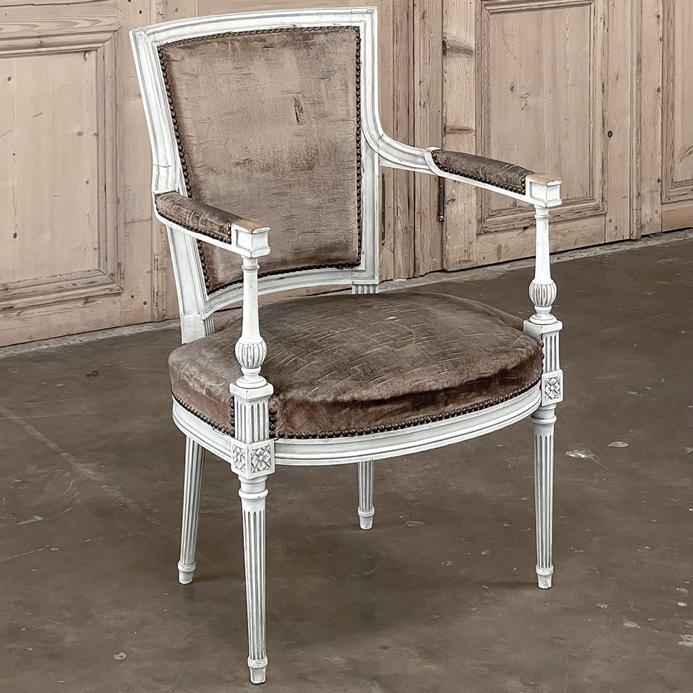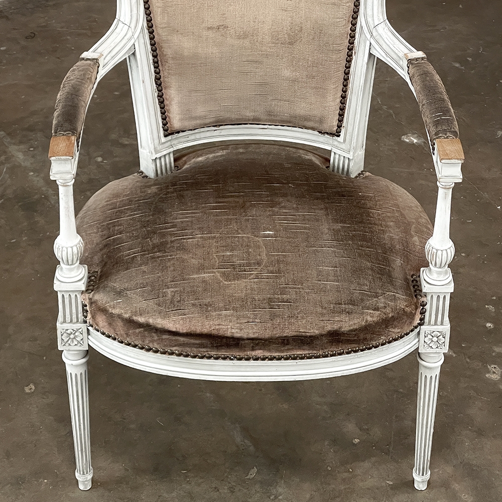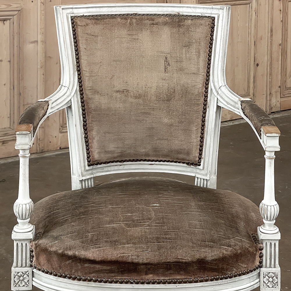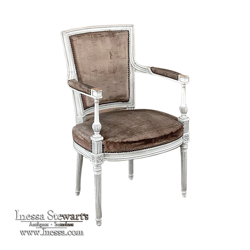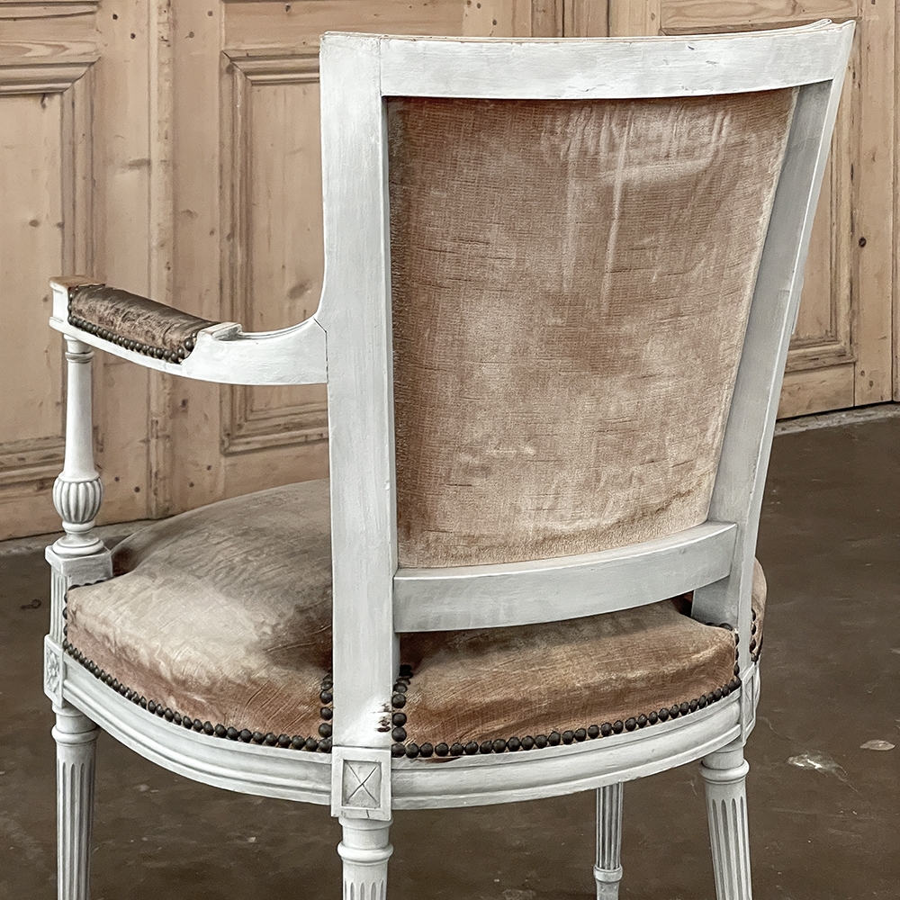 SaleAntique French Louis XVI Painted Armchair represents a style transition into the Directoire look, where a more tailored design created a cleaner appearance. The squared off, contoured seat back combines with a generous seat for comfort, especially paired with the padded armrests. The overall framework is embellished with a tailored fluting design, with a vase form appearing on the armrest supports, and rosettes where the armrest supports join with the seat apron. Originally upholstered in a type of mohair, the fabric is serviceable but easily replaced with your coordinating fabric. The elegant lines of the design are enhanced by the patinaed painted finish which lends to a lighter, more airy effect.