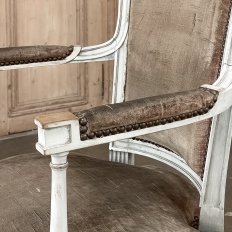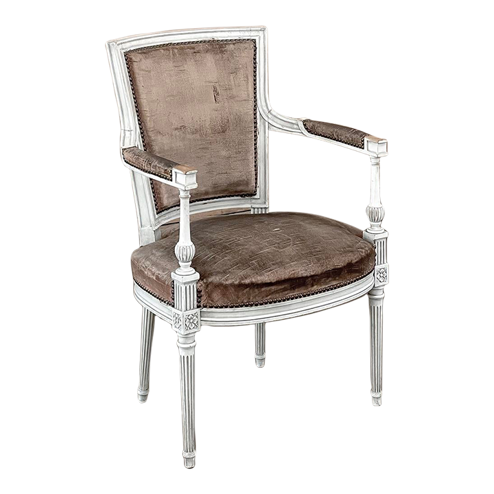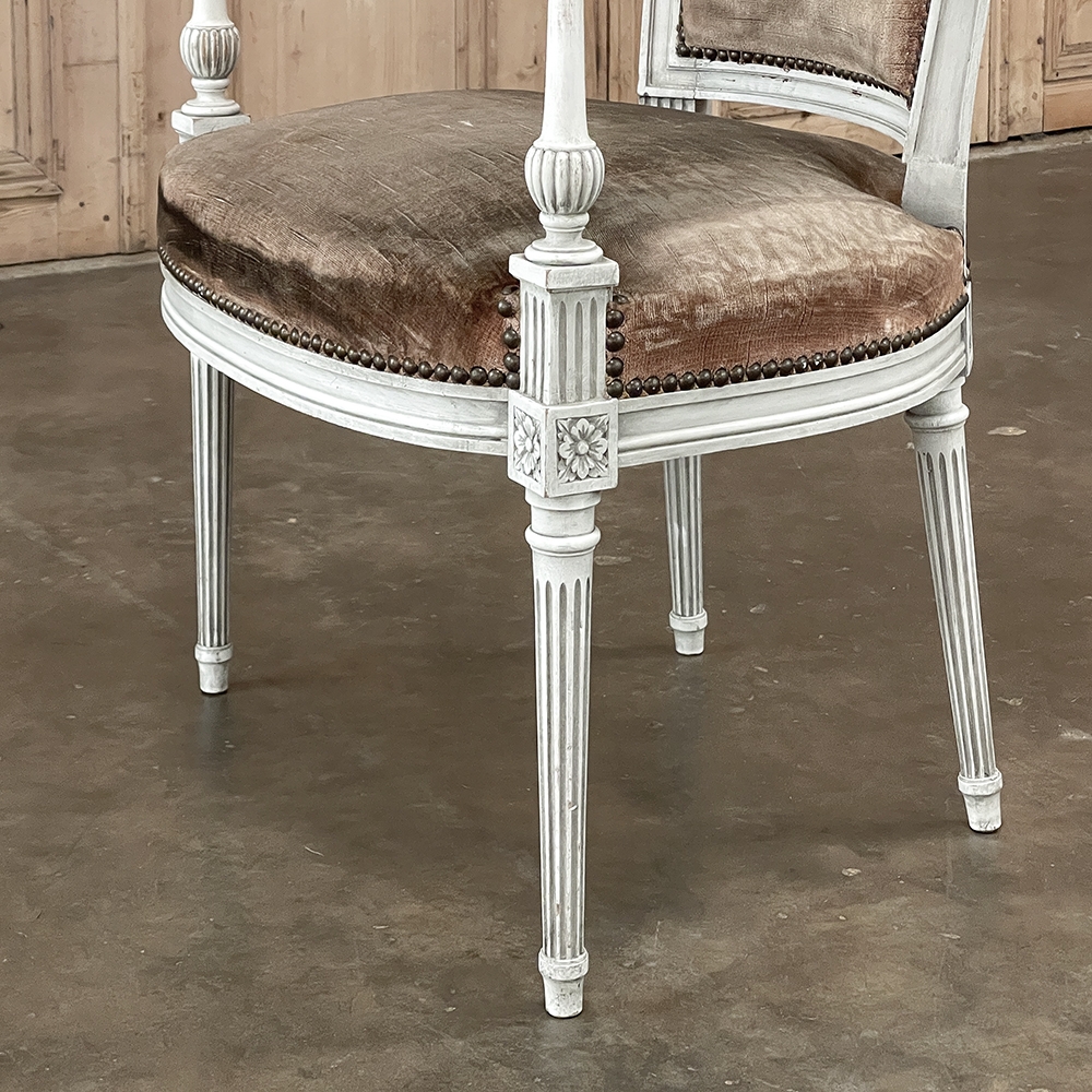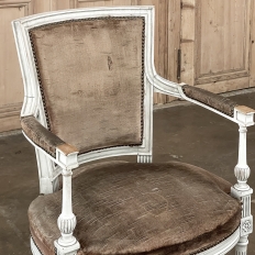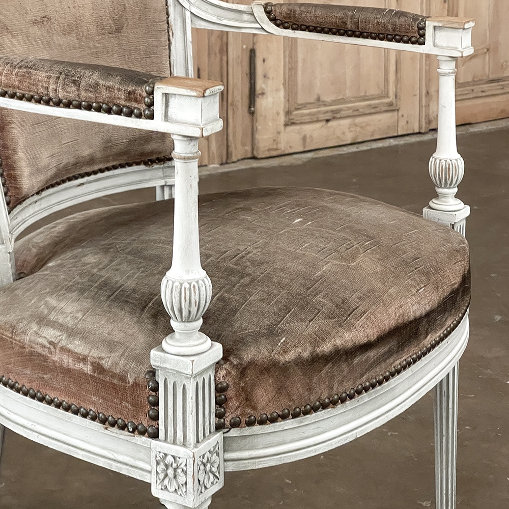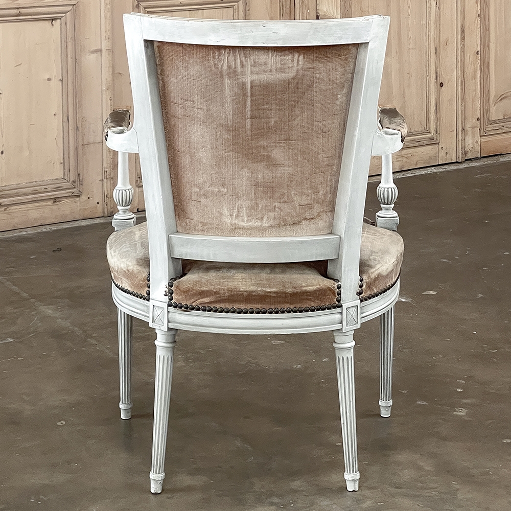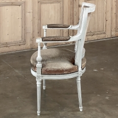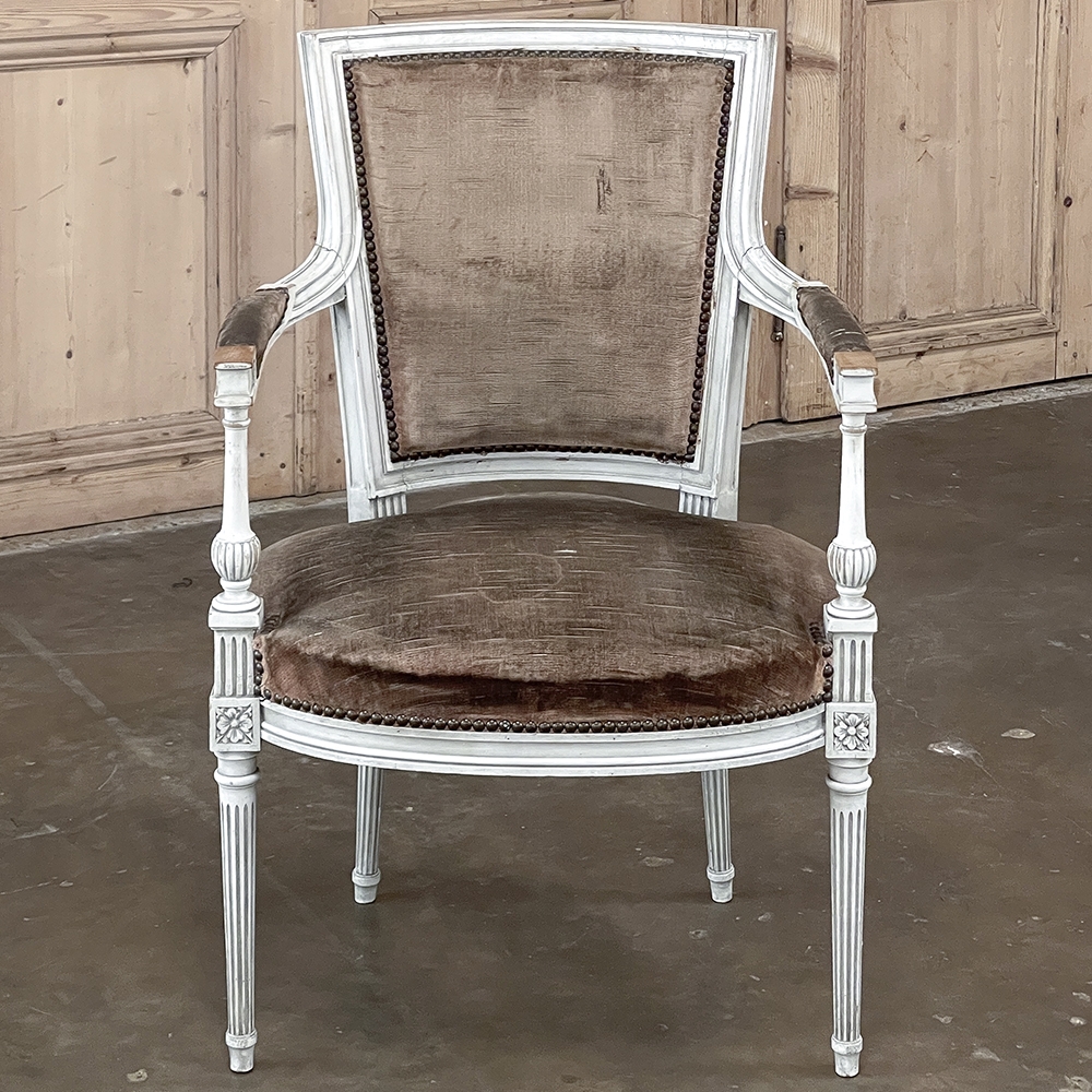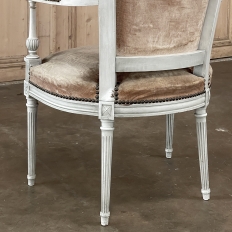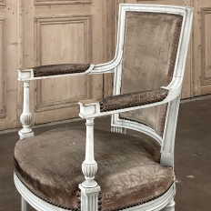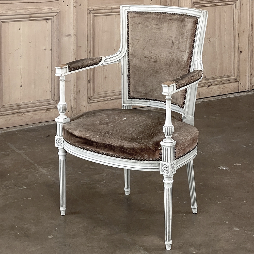 SaleAntique French Louis XVI Painted Armchair represents a style transition into the Directoire look, where a more tailored design created a cleaner appearance. The squared off, contoured seat back combines with a generous seat for comfort, especially paired with the padded armrests. The overall framework is embellished with a tailored fluting design, with a vase form appearing on the armrest supports, and rosettes where the armrest supports join with the seat apron. Originally upholstered in a type of mohair, the fabric is serviceable but easily replaced with your coordinating fabric. The elegant lines of the design are enhanced by the patinaed painted finish which lends to a lighter, more airy effect.