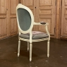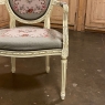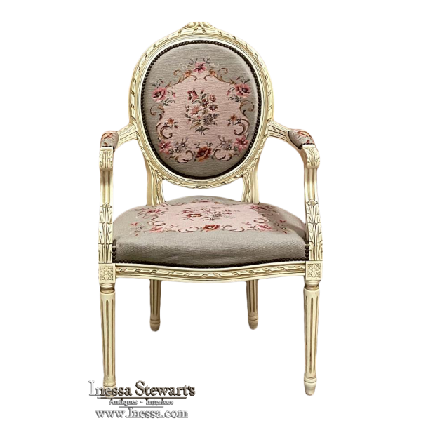 Antique French Louis XVI Painted Armchair with Needlepoint Tapestry is as elegant as they come, yet surprisingly comfortable as well! Oval seatback is contoured to conform to one's back, and the generously sized seat is bracketed by wraparound armrests that are also padded. Spiral ribbon carvings pervade the design, with a couple of flower blossoms on top and acanthus plumes on the armrest tips and supports. Rosettes appear above the tapered & fluted legs. The show stopper, though, is the wonderfully pastel colored needlepoint tapestry finely woven to depict a vivid floral scene on the seatback, seat and even the armrests, adding a durable artistic touch that is beyond compare!