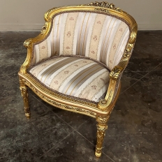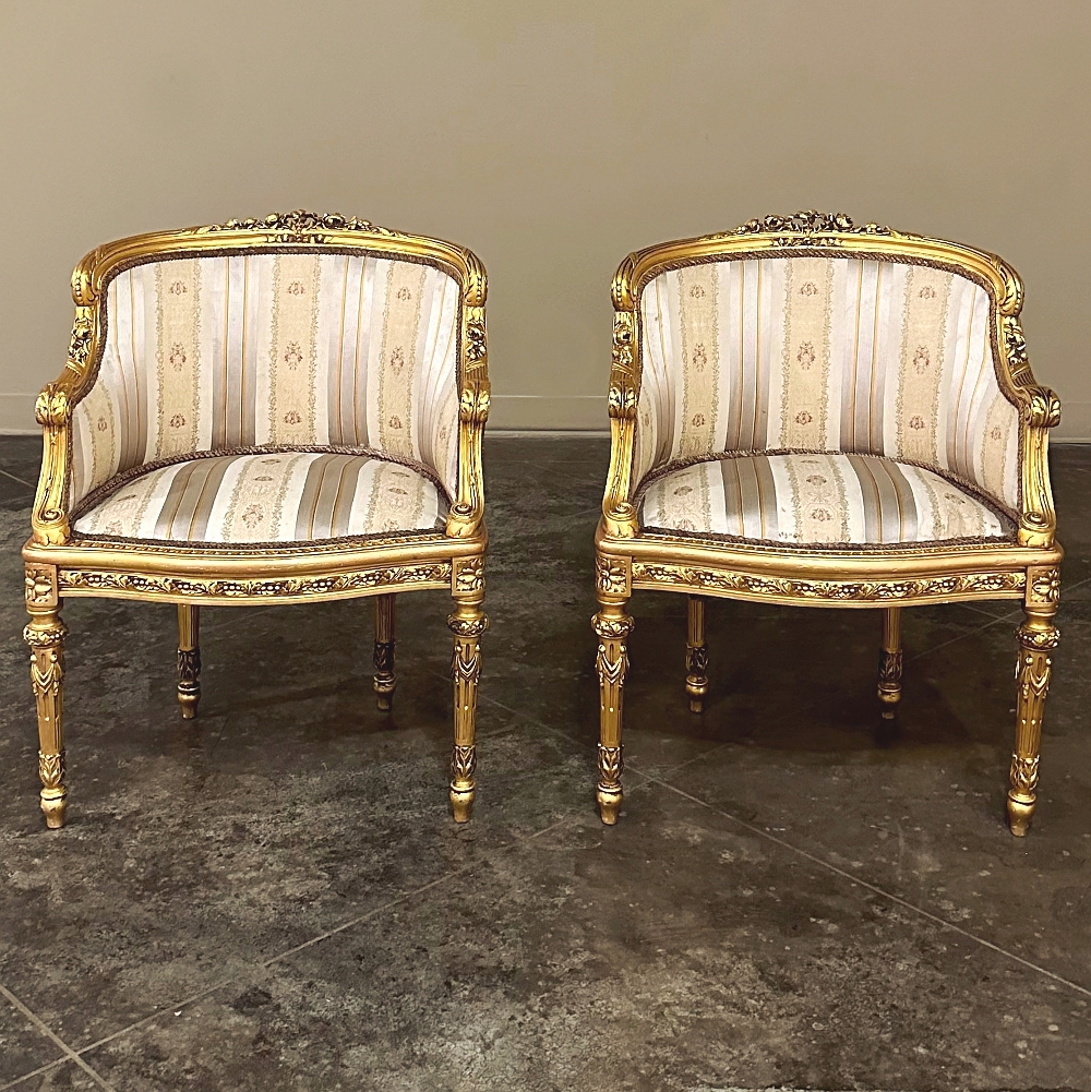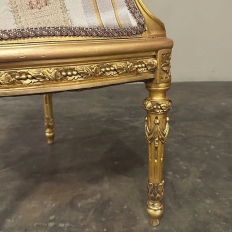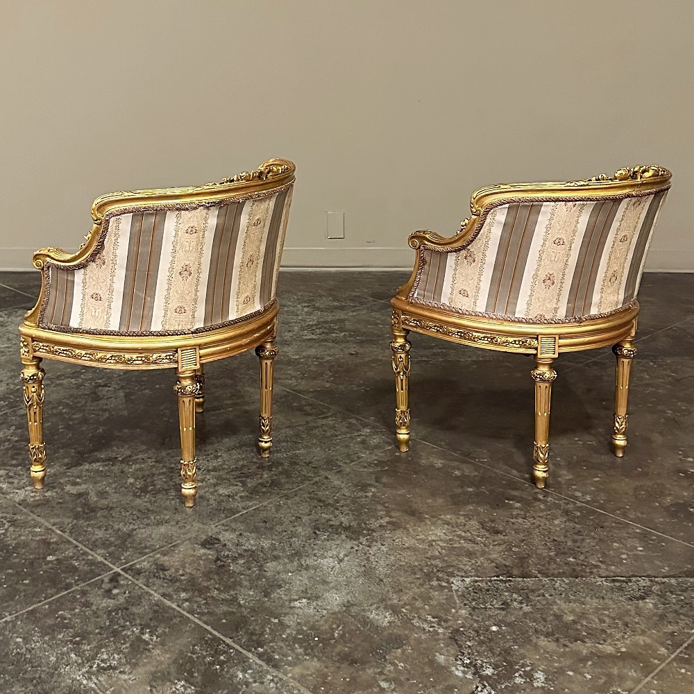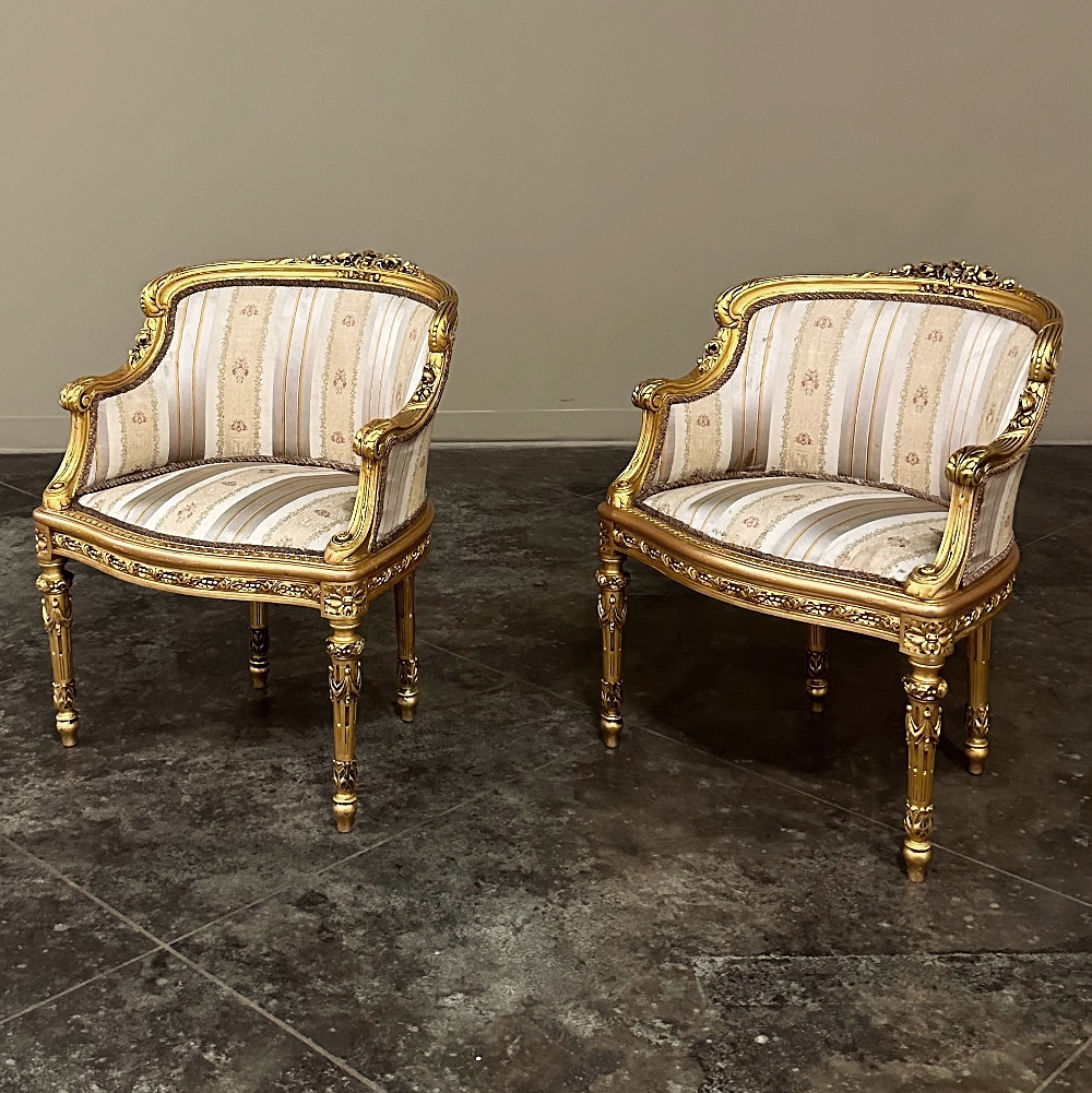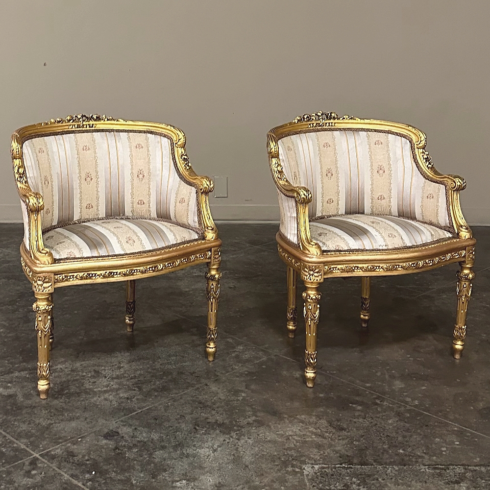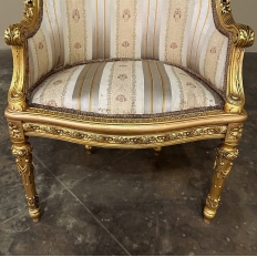 SaleAntique Italian Neoclassical Louis XVI Petite Giltwood Bergeres ~ Armchairs are the perfect choice for cozy seating groups, bedrooms, or anywhere a surprisingly comfortable seat with a lot of visual panache is desired! The seatback provides just enough support for the lower back, and wraps you in comfort, providing armrests as well. Fully upholstered all around, it's great for placement even in the center of the room, and the upholstery is in very serviceable condition. The frameworks, however, steal the show with the combination of artistic sculpture and a gold finish creating a timeless appeal. Motifs carved into the frames include ribbon at the top of the seatback, acanthus plumes and floral sprays, unusual horizontal scrolls, and amazing vine detailing all around the apron. The legs are works of art unto themselves, depicting classical columns with foliates, fluting and garlands. What a marvelous way to decorate, and when you're finished decorating, sit down and relax!