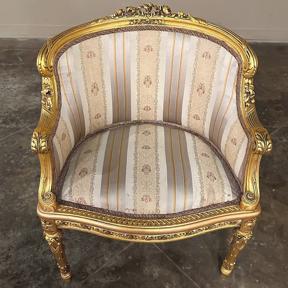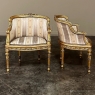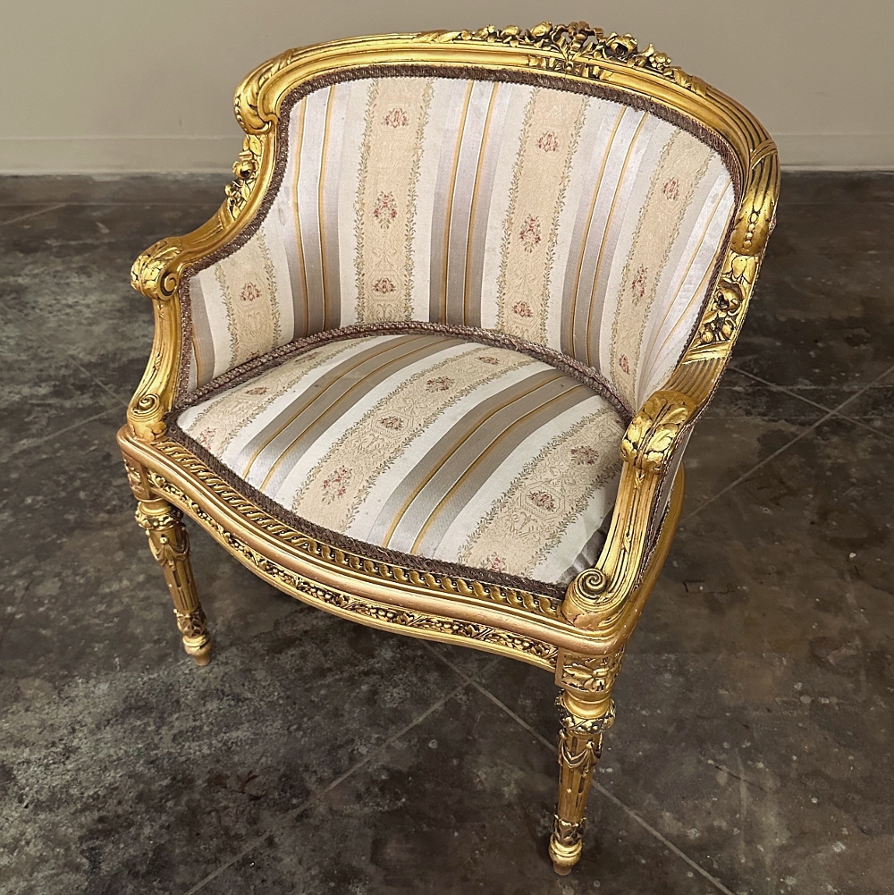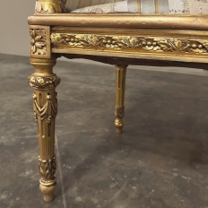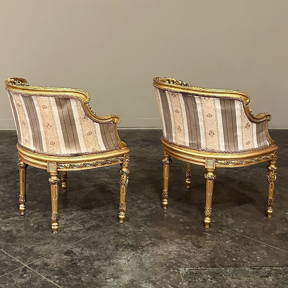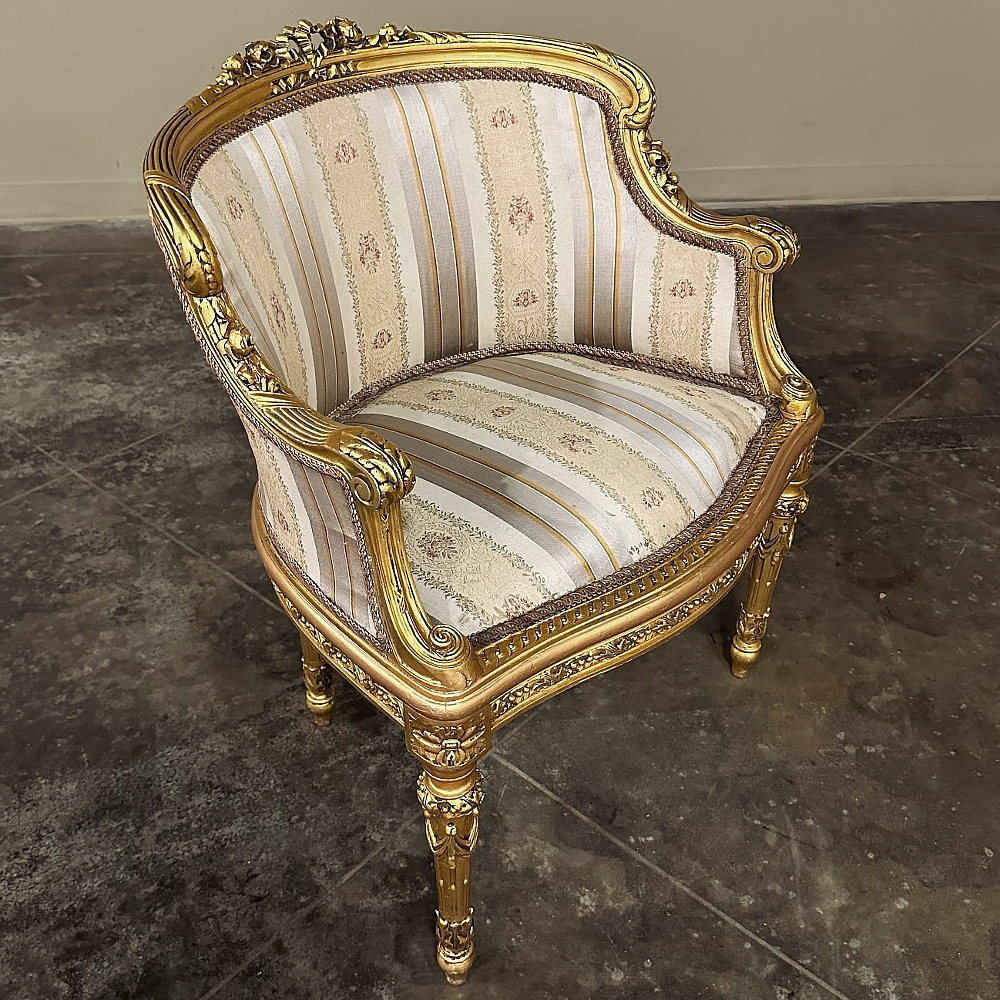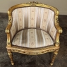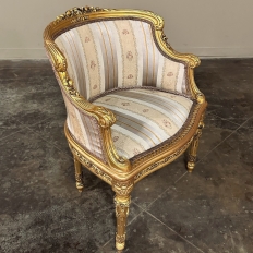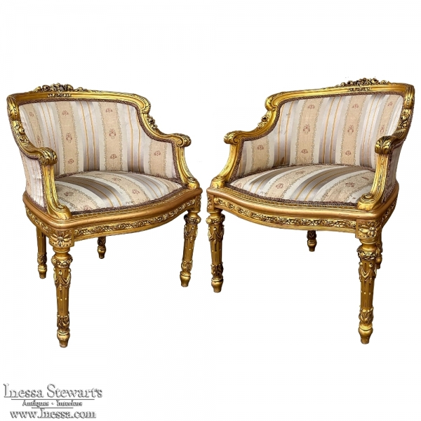 SaleAntique Italian Neoclassical Louis XVI Petite Giltwood Bergeres ~ Armchairs are the perfect choice for cozy seating groups, bedrooms, or anywhere a surprisingly comfortable seat with a lot of visual panache is desired! The seatback provides just enough support for the lower back, and wraps you in comfort, providing armrests as well. Fully upholstered all around, it's great for placement even in the center of the room, and the upholstery is in very serviceable condition. The frameworks, however, steal the show with the combination of artistic sculpture and a gold finish creating a timeless appeal. Motifs carved into the frames include ribbon at the top of the seatback, acanthus plumes and floral sprays, unusual horizontal scrolls, and amazing vine detailing all around the apron. The legs are works of art unto themselves, depicting classical columns with foliates, fluting and garlands. What a marvelous way to decorate, and when you're finished decorating, sit down and relax!
