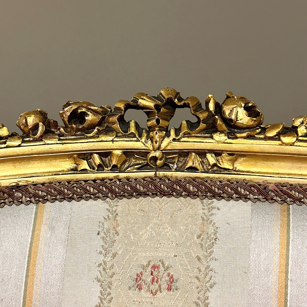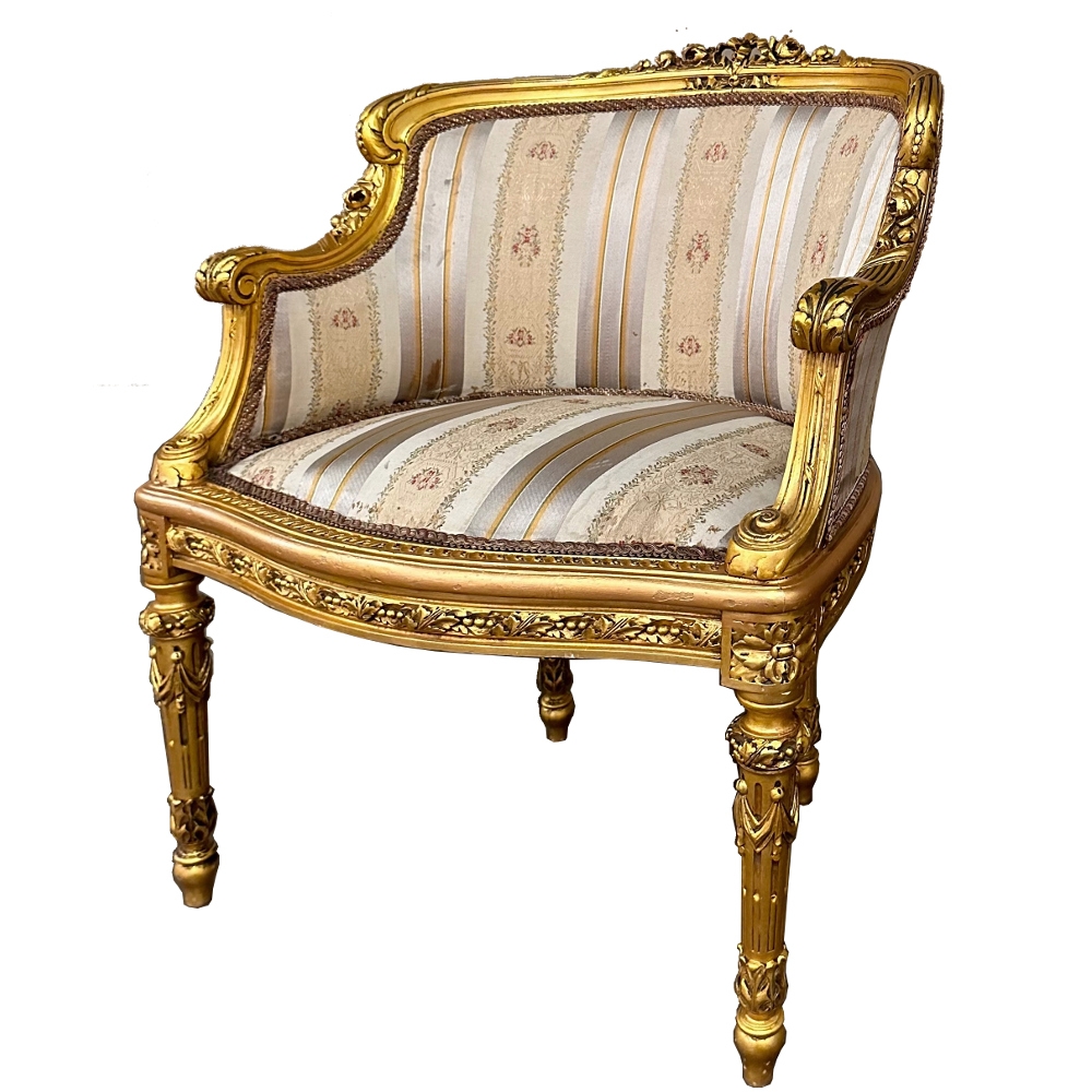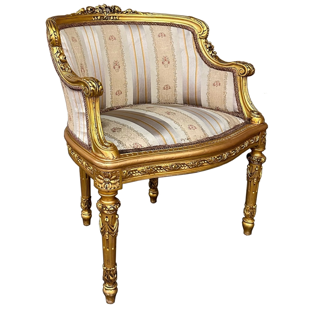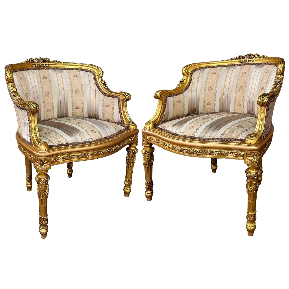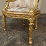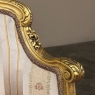 SaleAntique Italian Neoclassical Louis XVI Petite Giltwood Bergeres ~ Armchairs are the perfect choice for cozy seating groups, bedrooms, or anywhere a surprisingly comfortable seat with a lot of visual panache is desired! The seatback provides just enough support for the lower back, and wraps you in comfort, providing armrests as well. Fully upholstered all around, it's great for placement even in the center of the room, and the upholstery is in very serviceable condition. The frameworks, however, steal the show with the combination of artistic sculpture and a gold finish creating a timeless appeal. Motifs carved into the frames include ribbon at the top of the seatback, acanthus plumes and floral sprays, unusual horizontal scrolls, and amazing vine detailing all around the apron. The legs are works of art unto themselves, depicting classical columns with foliates, fluting and garlands. What a marvelous way to decorate, and when you're finished decorating, sit down and relax!