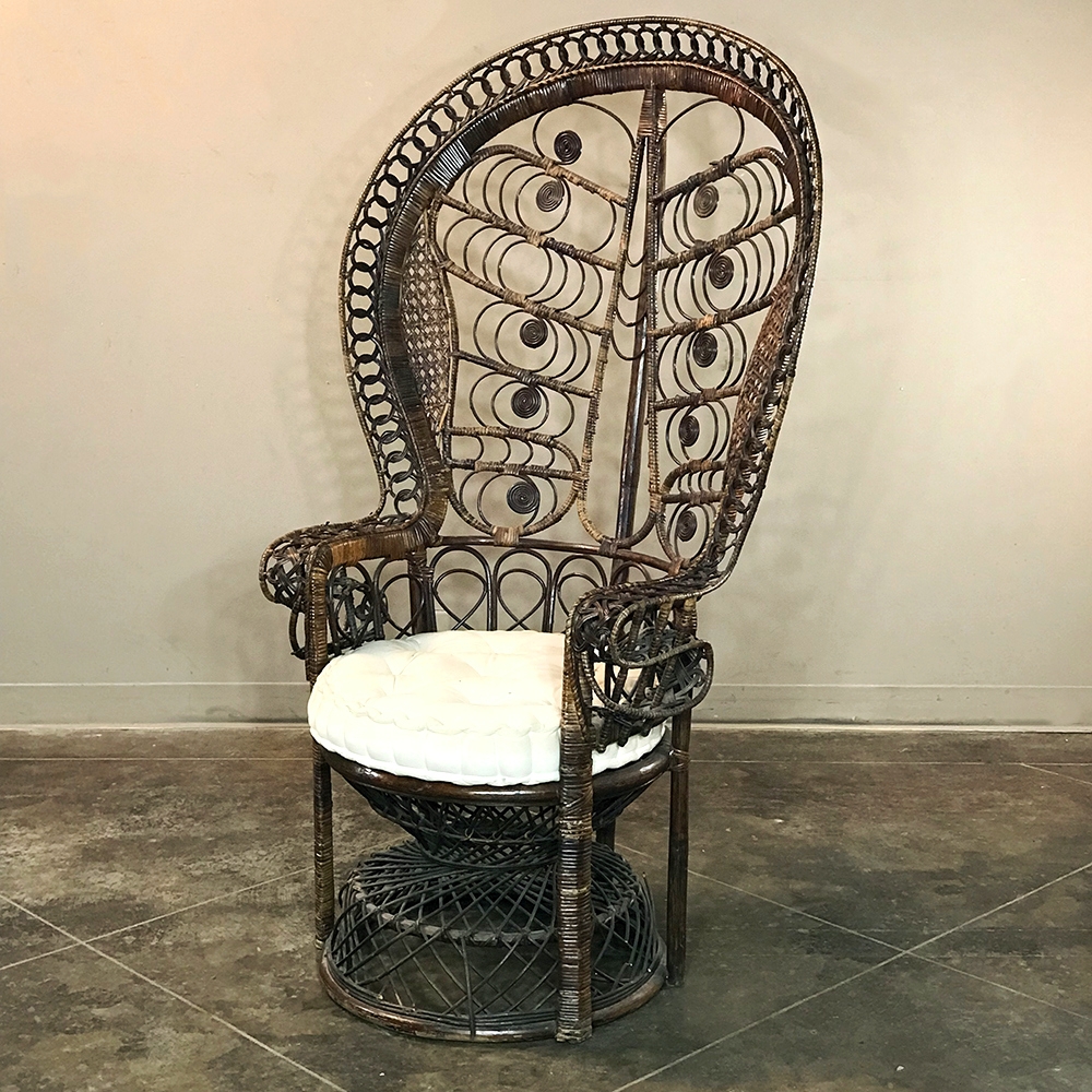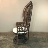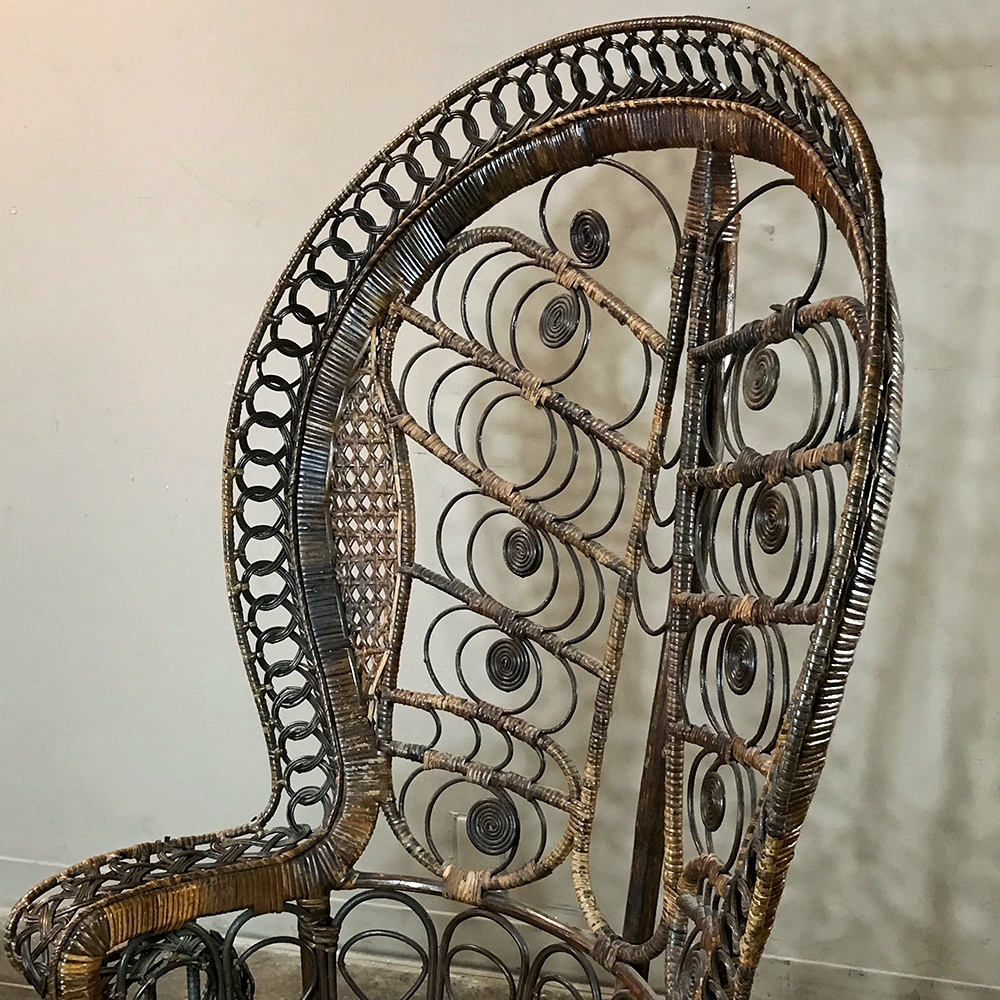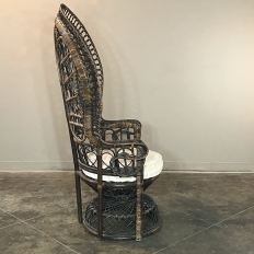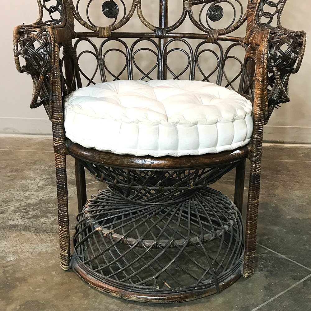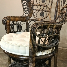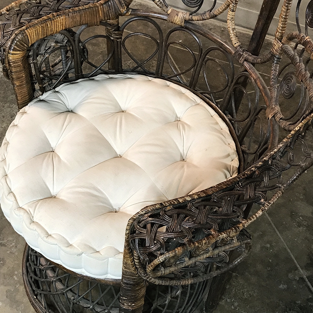 Antique Wicker Chair is a delightful example of South Pacific craftsmanship that became popular in Europe during the 19th century, and has remained popular to this day. Derived from the palm, wicker is strong yet flexible enough to "weave" into the elaborate shapes that are demonstrated with this example. The oversized seat back and wraparound design built around a circular seat is a trademark look for this type, as is the looping embellishment that pervades the design. The tufted round cushion is in remarkably good condition and adds great comfort to the piece, with an intriguing hourglass seat support surrounded by four cornerposts in a display of ingenious engineering.