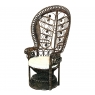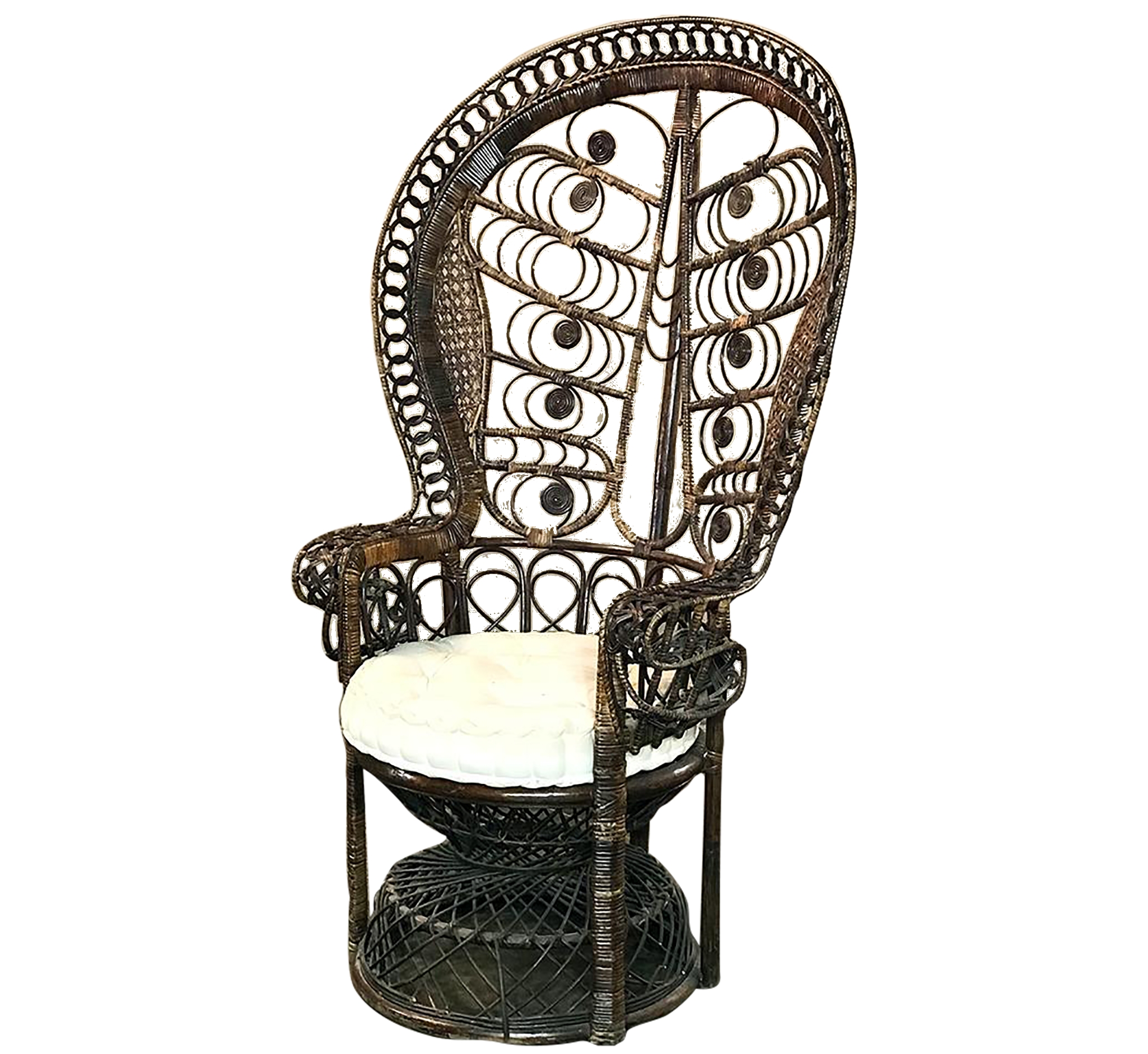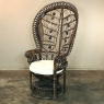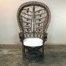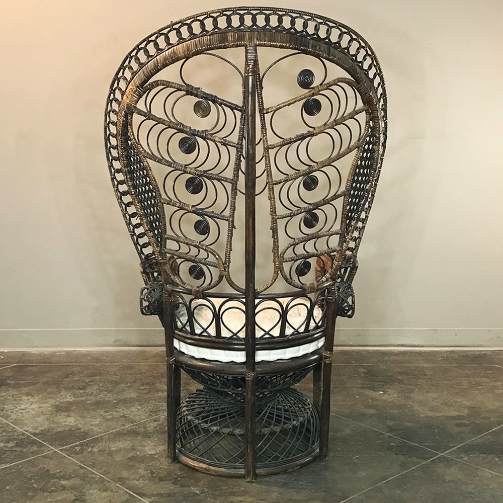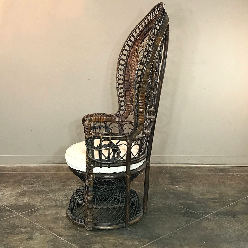 Antique Wicker Chair is a delightful example of South Pacific craftsmanship that became popular in Europe during the 19th century, and has remained popular to this day. Derived from the palm, wicker is strong yet flexible enough to "weave" into the elaborate shapes that are demonstrated with this example. The oversized seat back and wraparound design built around a circular seat is a trademark look for this type, as is the looping embellishment that pervades the design. The tufted round cushion is in remarkably good condition and adds great comfort to the piece, with an intriguing hourglass seat support surrounded by four cornerposts in a display of ingenious engineering.