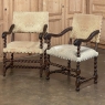 SalePair 17th Century Louis XIII Barley Twist Armchairs are perfect for adding an Old World touch to any decor. Hand-crafted from solid old-growth French walnut, each features a framework of clockwise and counter-clockwise barley twist columns and supports, interconnected with extraordinarily precise craftsmanship to remain strong for centuries. The elegantly scrolled armrests are adorned with sculpted acanthus leaves, with the tips ending in a scrolled form. The generously sized seats and seatbacks are still appropriate for 21st century physiques. Each having been reupholstered many times over the centuries, they are sold with the expectation that the upholstery will be replaced by their new owners.