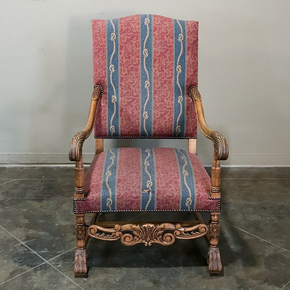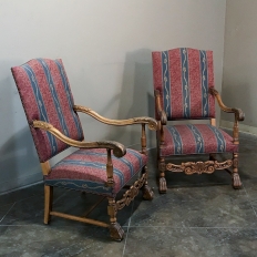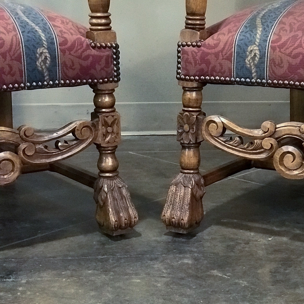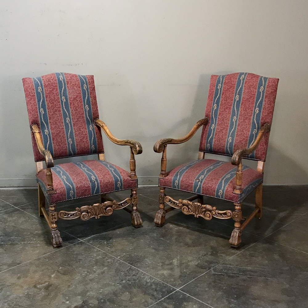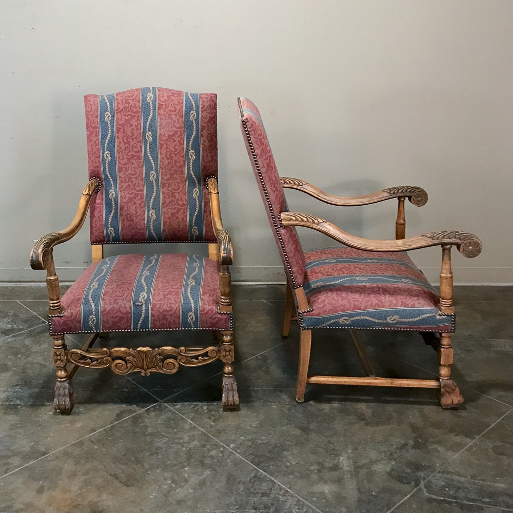 Pair 19th Century French Louis XIII Armchairs are of a grand size for their time, making them ideal for 21st century homes! Beautifully carved with graceful armrests and lions' paw feet, each features a carved transverse apron across the front for a masculine touch.