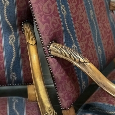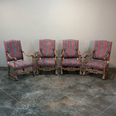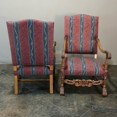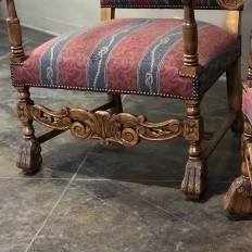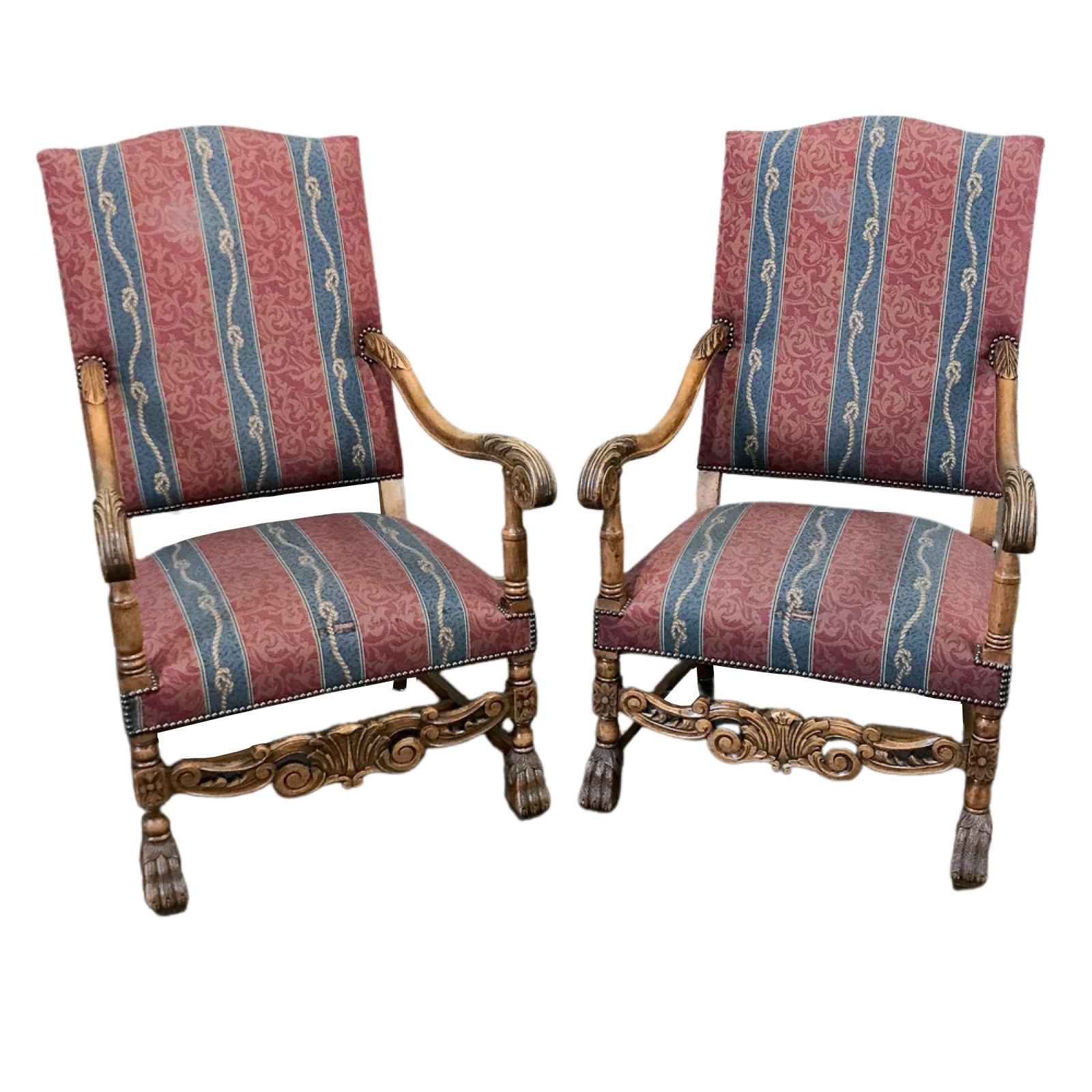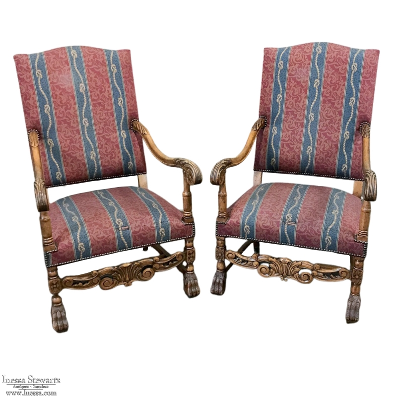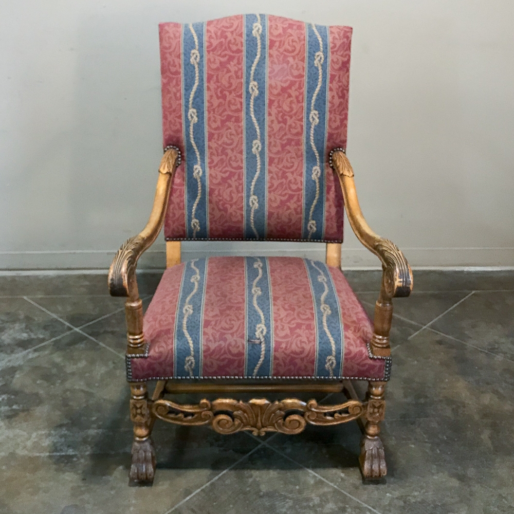 Pair 19th Century French Louis XIII Armchairs are of a grand size for their time, making them ideal for 21st century homes! Beautifully carved with graceful armrests and lions' paw feet, each features a carved transverse apron across the front for a masculine touch.