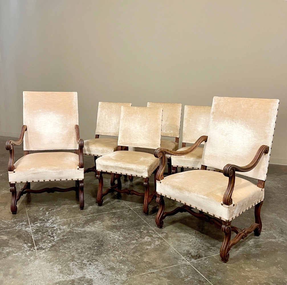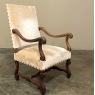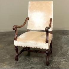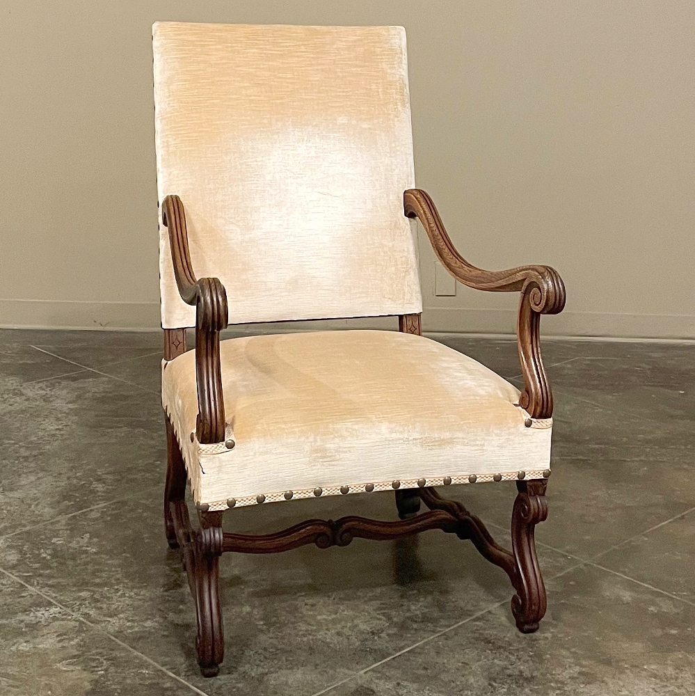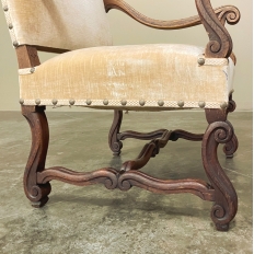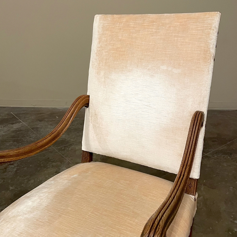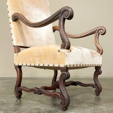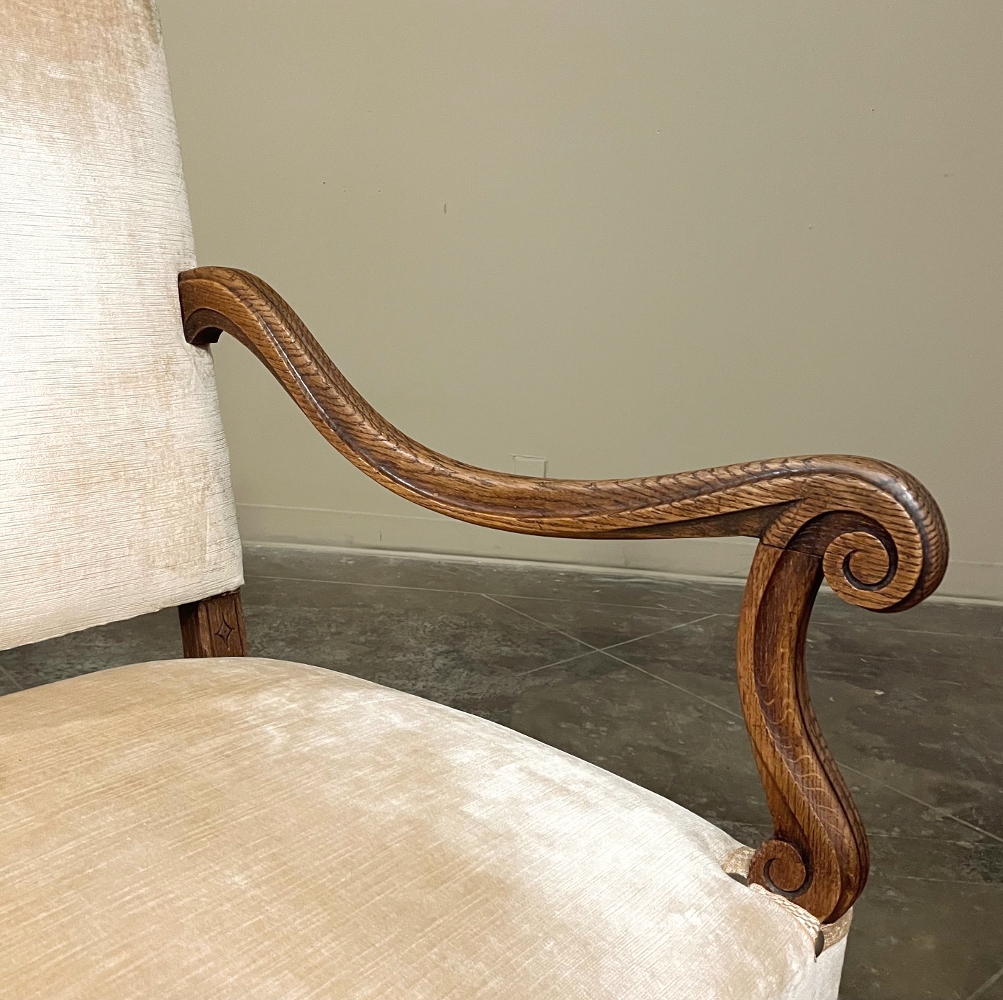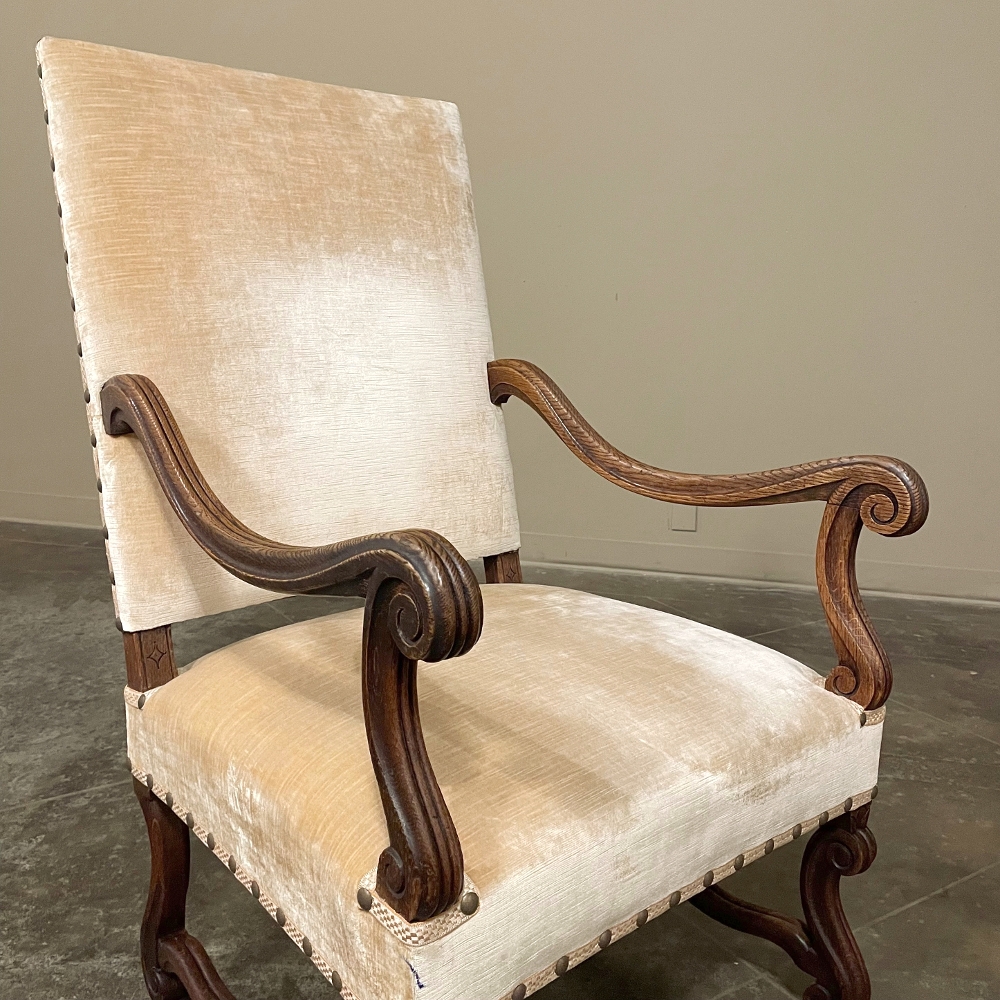 SalePair 19th Century French Louis XIV Armchairs ~ Fauteuils with Mohair represent the essence of the form, with gracefully scrolled armrests, legs and stretchers providing stylish support for the generously sized rectangular seats and high squared seatbacks. This type of French armchair has been popular for centuries as it accommodates persons of all sizes. The richly grained old-growth oak has been artfully crafted and embellished with fluting, and features classic French scrolls for understated elegance. Upholstery is a tan mohair perfect for blending with most any earth tones and providing comfort with flair for decades.