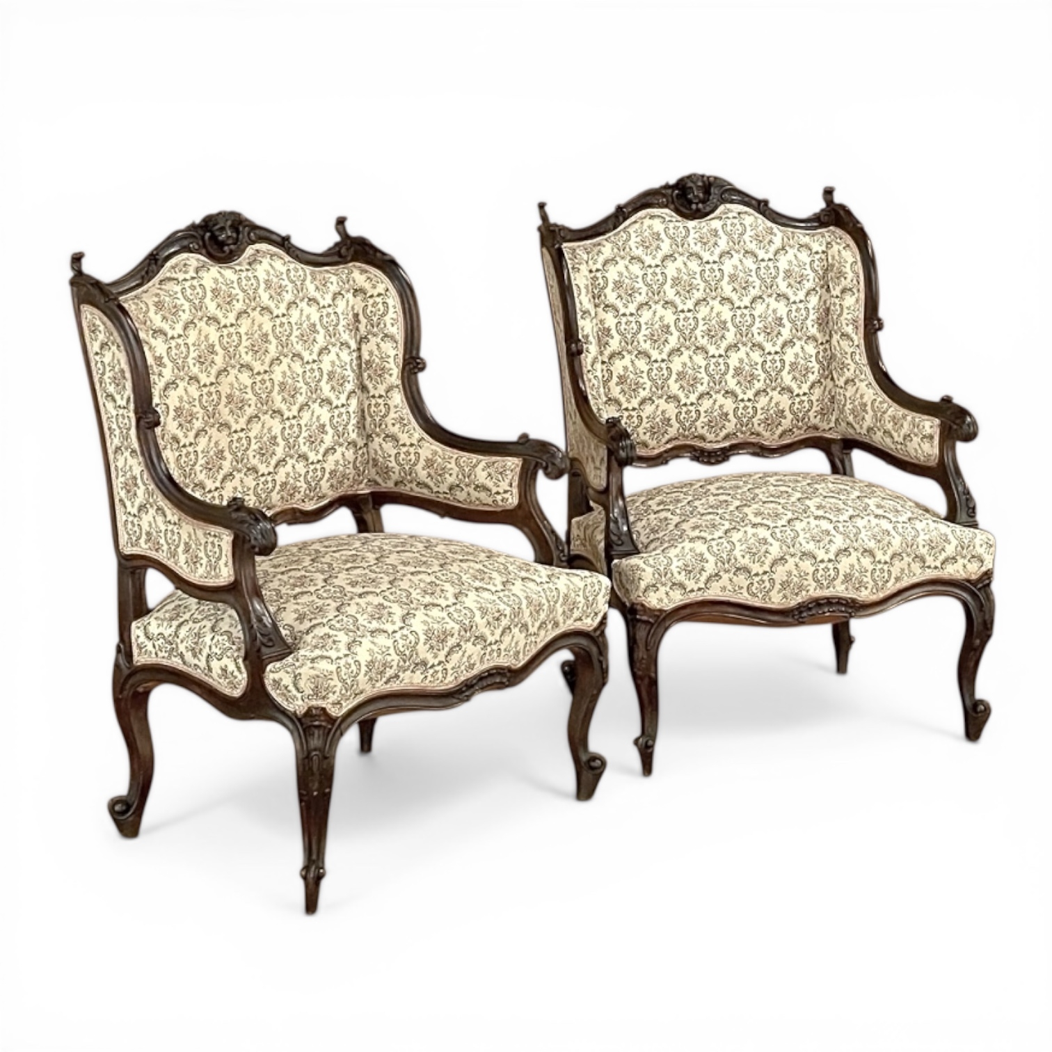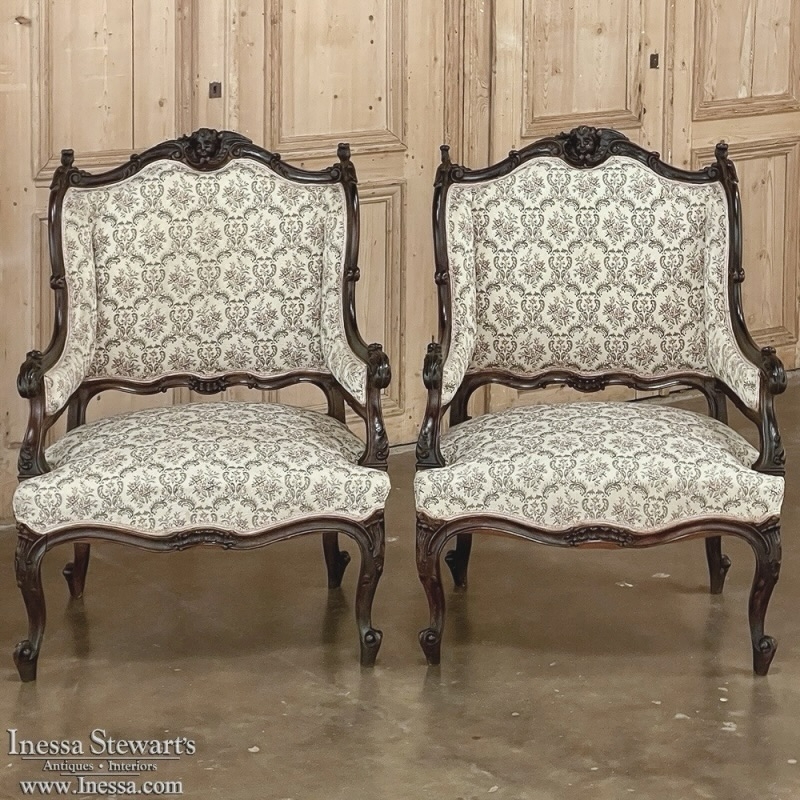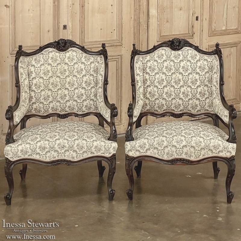 SalePair 19th Century Angel French Louis XV - Regence Armchairs ~ Bergeres are an incredibly stylish way to add comfortable seating to your favorite room! Upholstered in a very high-quality tapestry fabric, each was sculpted from fine French walnut, and features not a single straight line in the entire framework! The double arched seat back crown is centered with a charming cherub's face with asymmetrical wing surround, with the scrolls cascading down to the corners topped with foliate flourishes. The finely contoured sides create a wraparound "wingback" effect, enveloping one in comfort, with acanthus plumes carved into the armrest tips. The undulating framework below includes subtle stylized shell carvings, with four boldly scrolled cabriole legs providing support, each embellished with carved detail and escargot feet. Upholstered fully on the back side, they're perfect for placement anywhere in the room!