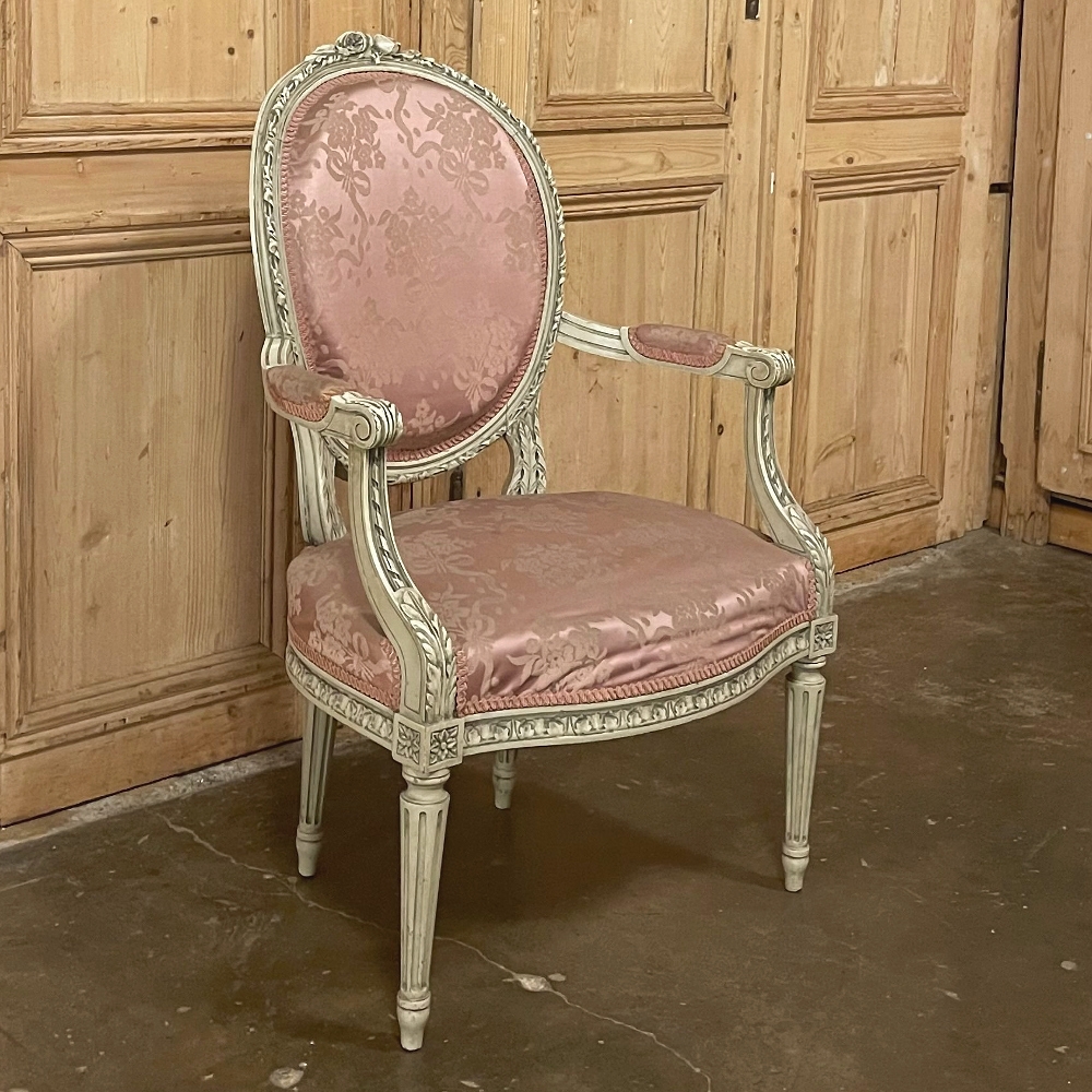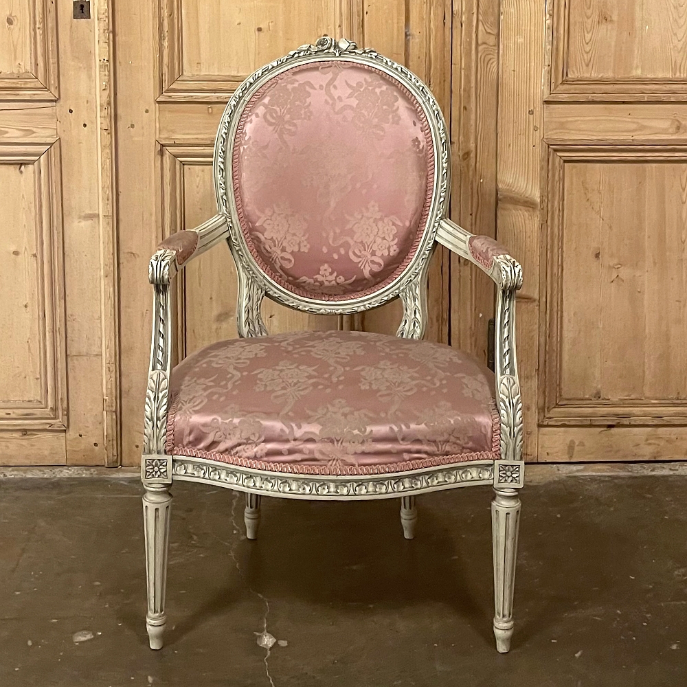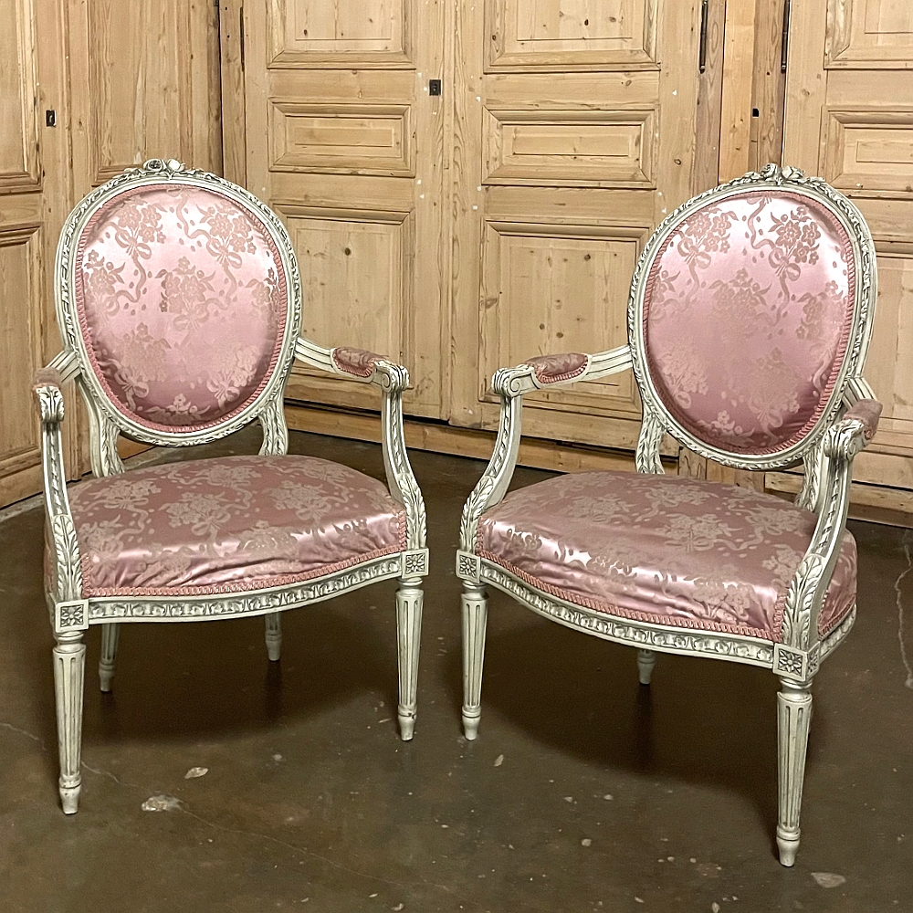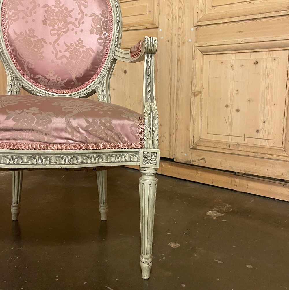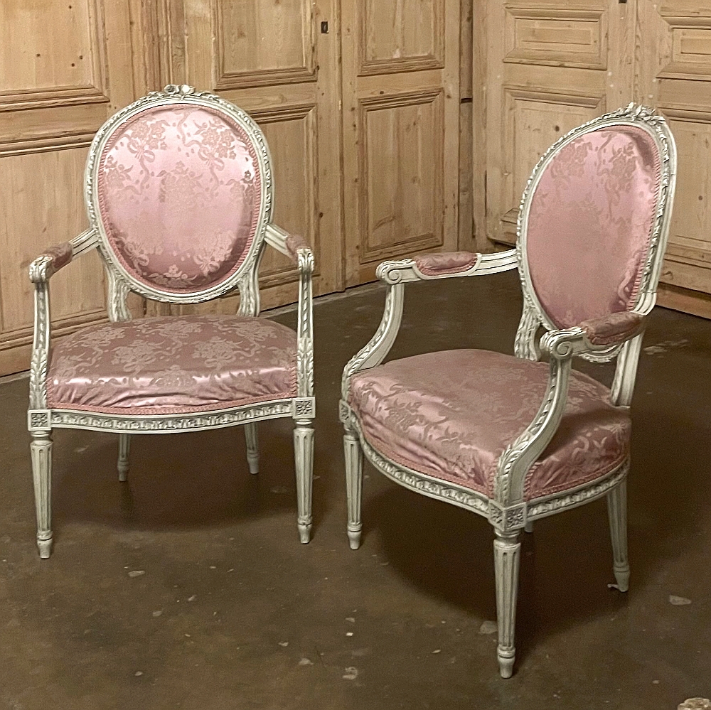 SalePair 19th Century French Louis XVI Painted Armchairs is a superlative decorative accent that just happens to provide seating! Hand-carved from solid walnut, each features a distinctive neoclassical theme in its carved embellishment that is enhanced by the patina of the original painted finish. The contoured oval seatback is framed with spiral ribbon trim topped with roses at the top center. Supports are carved with foliate plumes, repeated on the tips of the armchairs. The curved armrest supports continue the spiral ribbon motif down into the framework around the seat, punctuated by the rosettes atop the tapered and fluted legs. Silk upholstery is serviceable but does show appropriate signs of age.