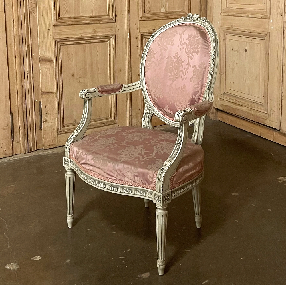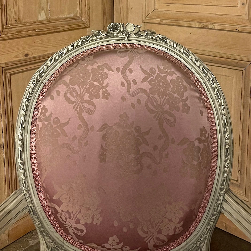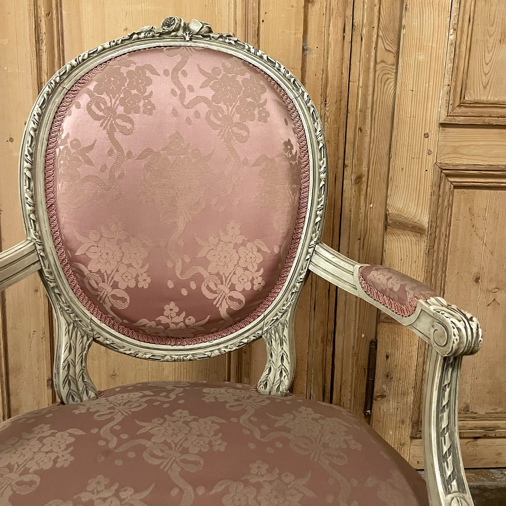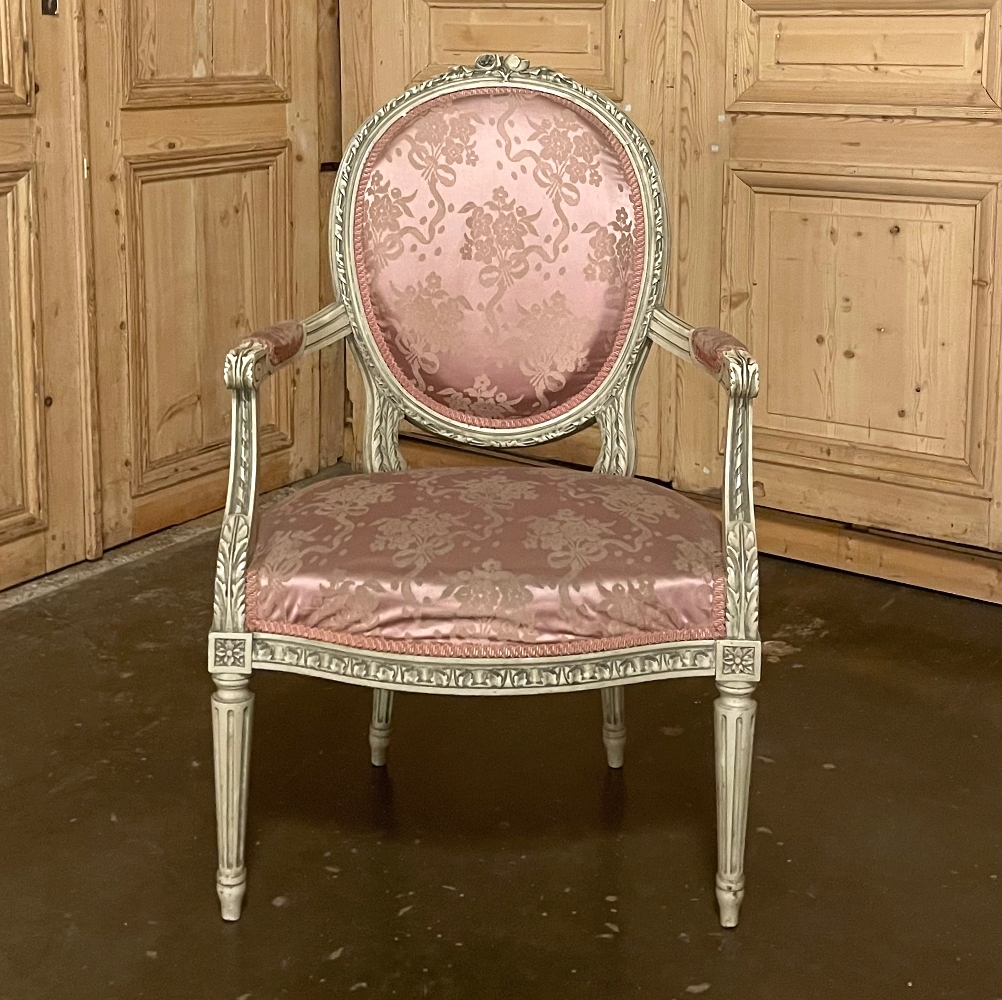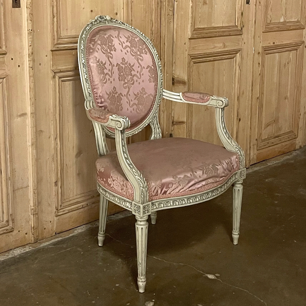 SalePair 19th Century French Louis XVI Painted Armchairs is a superlative decorative accent that just happens to provide seating! Hand-carved from solid walnut, each features a distinctive neoclassical theme in its carved embellishment that is enhanced by the patina of the original painted finish. The contoured oval seatback is framed with spiral ribbon trim topped with roses at the top center. Supports are carved with foliate plumes, repeated on the tips of the armchairs. The curved armrest supports continue the spiral ribbon motif down into the framework around the seat, punctuated by the rosettes atop the tapered and fluted legs. Silk upholstery is serviceable but does show appropriate signs of age.