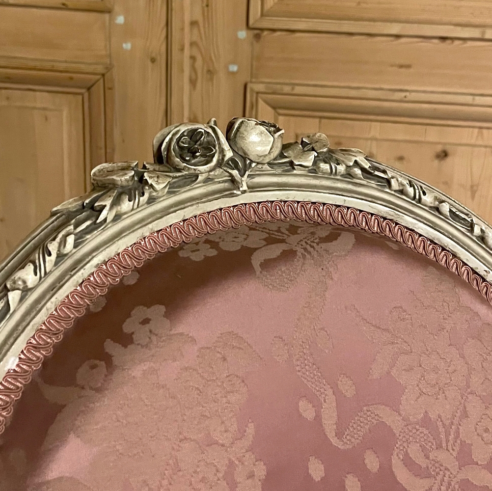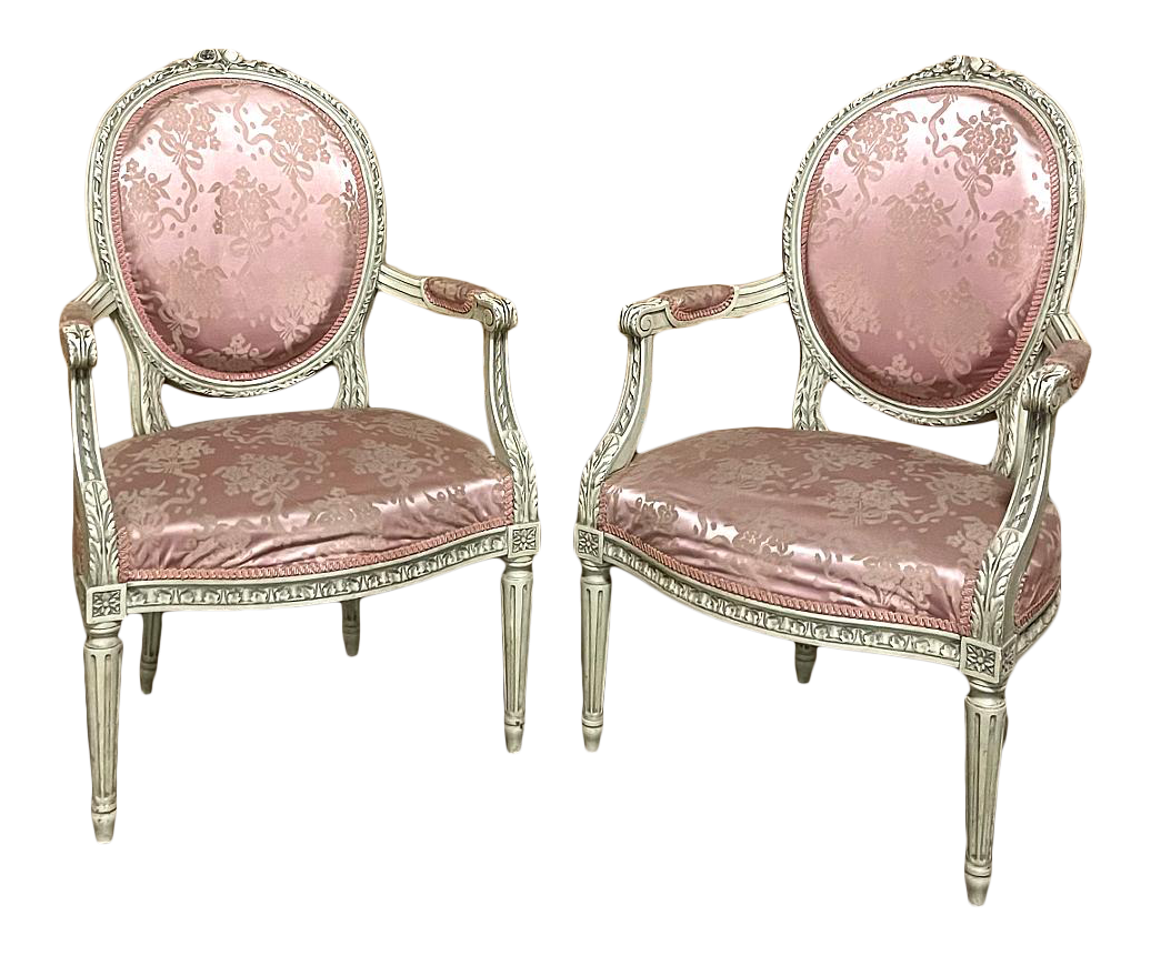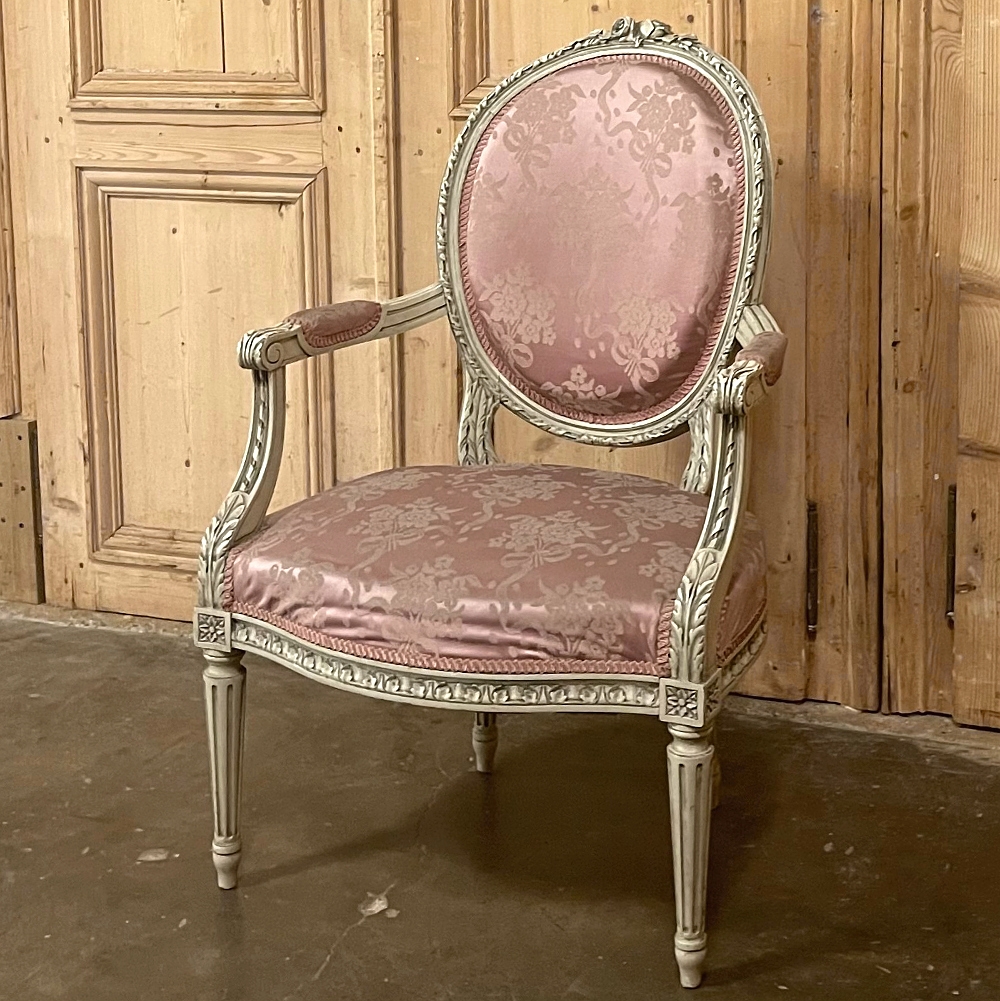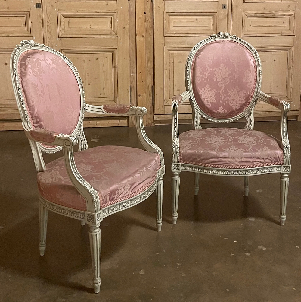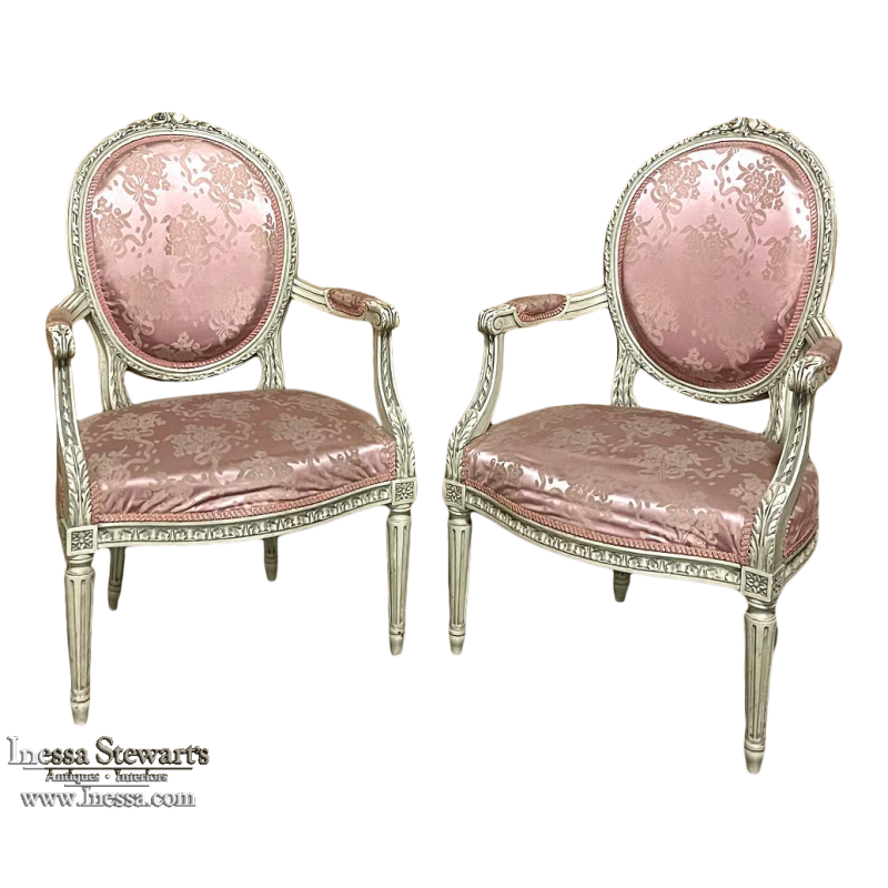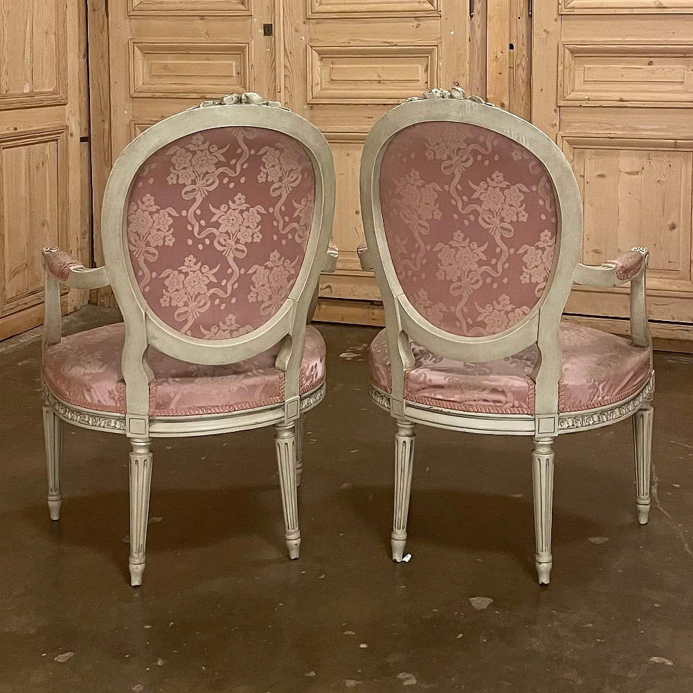 SalePair 19th Century French Louis XVI Painted Armchairs is a superlative decorative accent that just happens to provide seating! Hand-carved from solid walnut, each features a distinctive neoclassical theme in its carved embellishment that is enhanced by the patina of the original painted finish. The contoured oval seatback is framed with spiral ribbon trim topped with roses at the top center. Supports are carved with foliate plumes, repeated on the tips of the armchairs. The curved armrest supports continue the spiral ribbon motif down into the framework around the seat, punctuated by the rosettes atop the tapered and fluted legs. Silk upholstery is serviceable but does show appropriate signs of age.
