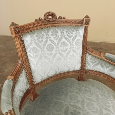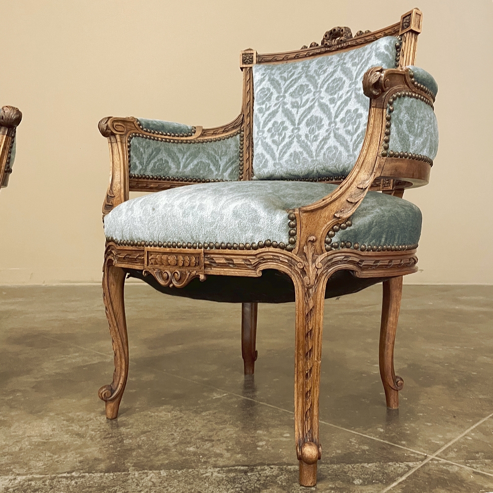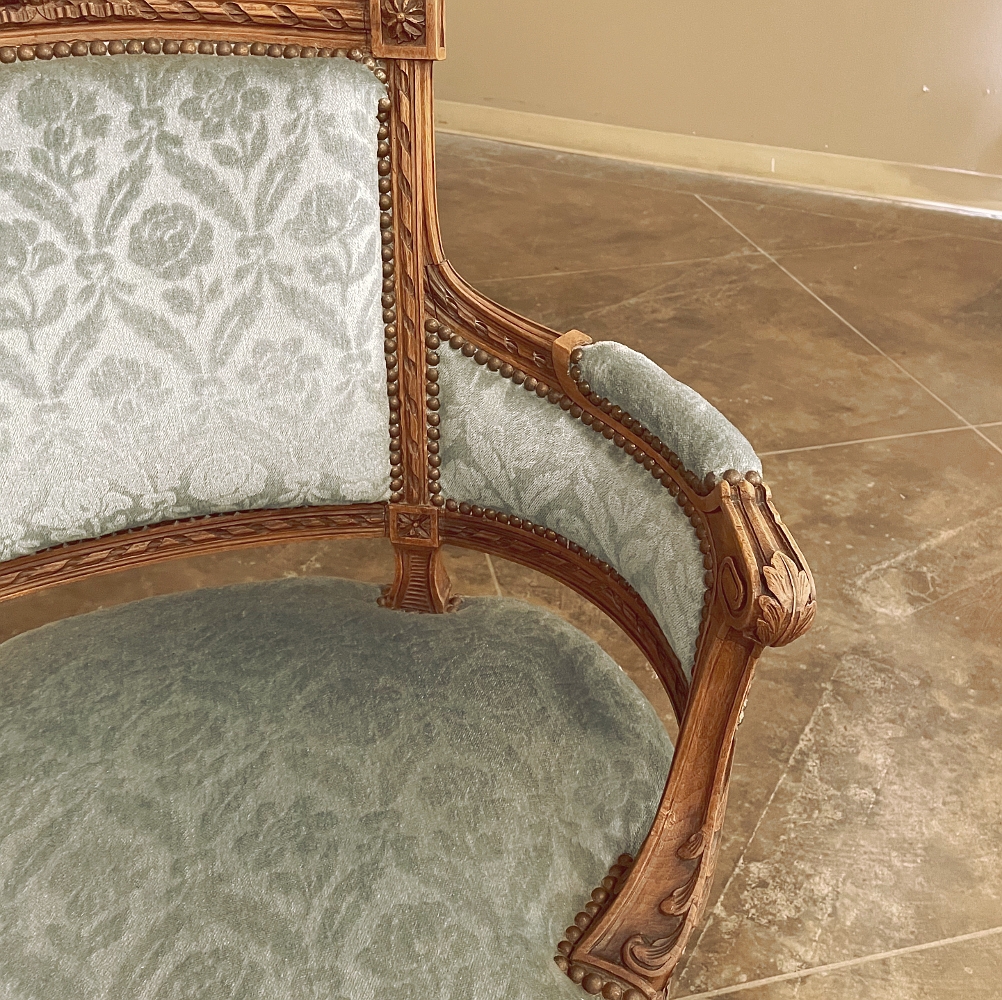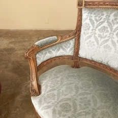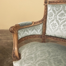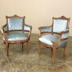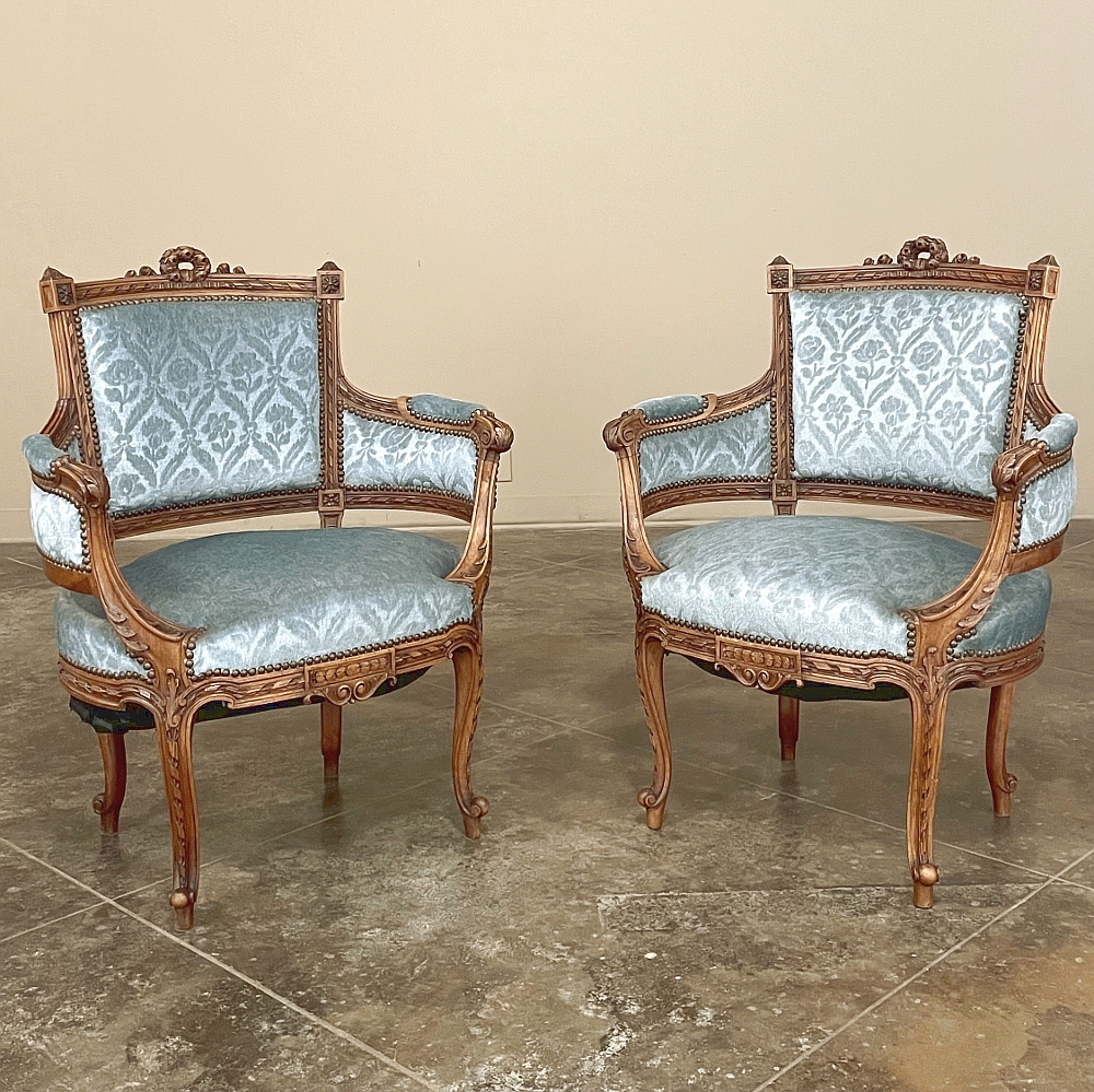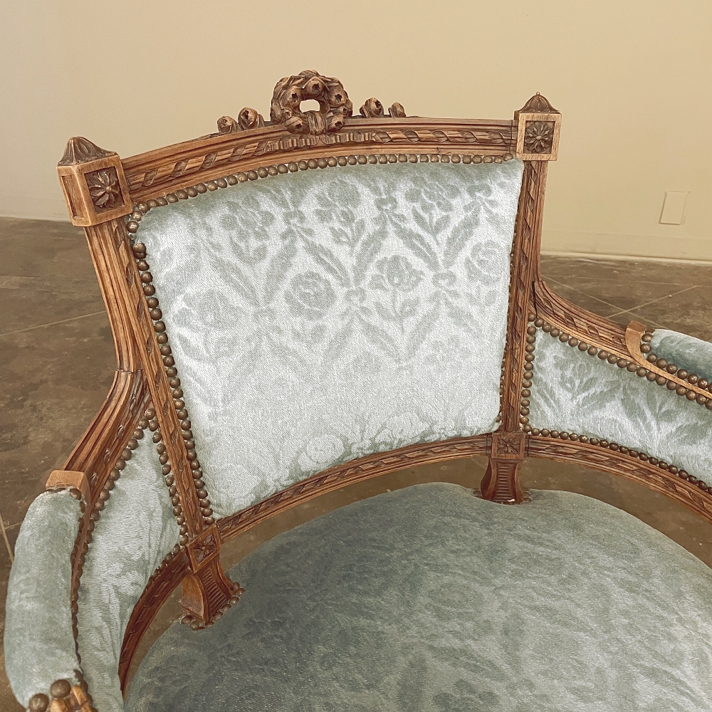 SalePair 19th Century French Louis XVI Walnut Bergeres ~ Armchairs is a remarkable combination of master furniture makers with exceedingly talented sculptors! Fashioned from sumptuous French walnut, each features a subtly curved seat back that joins with the more curvaceous armrests on each side, both of which are upholstered and topped with armrest pads. The generously sized seat works with this wraparound design to envelope you in comfort. The frame glorifies the sculptor's art, with a floral wreath flanked by sprays taking center stage, and rosettes atop the seatback corner posts, and acanthus plumes adorning the armrests and centered on the apron beneath a panel of Greek coin overlay. The entire frame's facade is connected with spiral ribbon trim throughout to bring the design together.