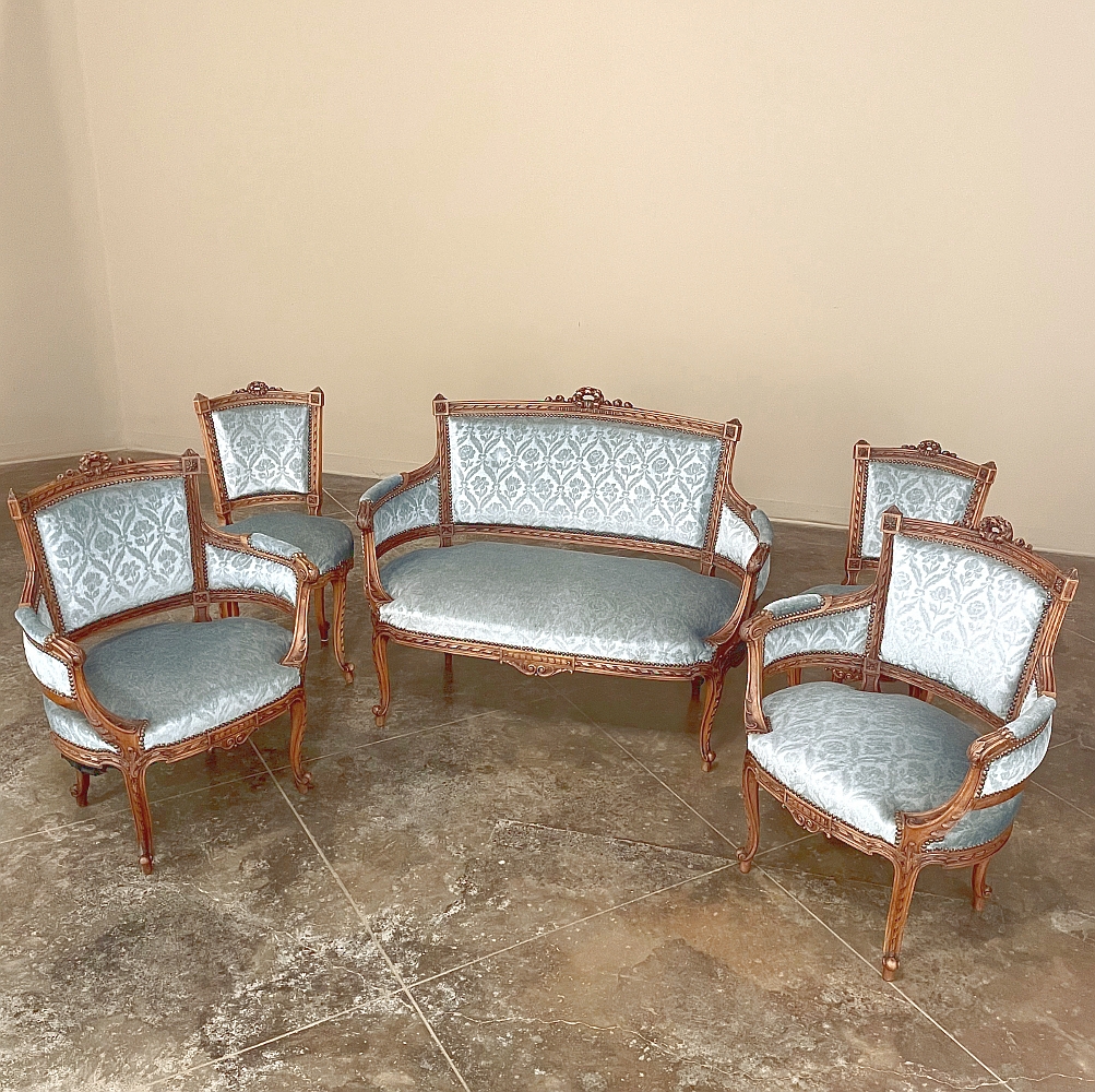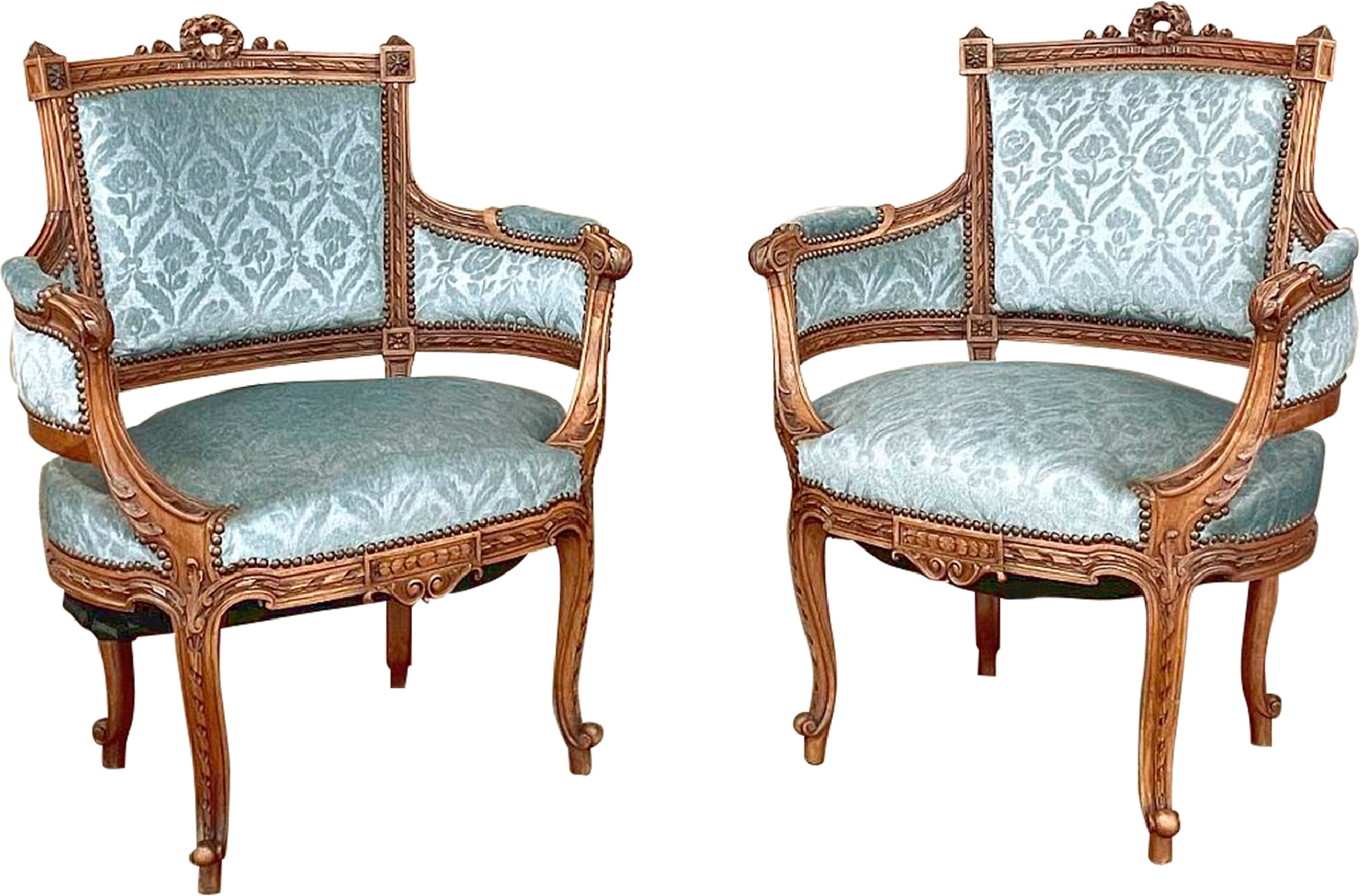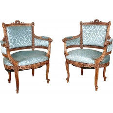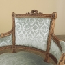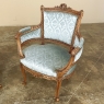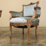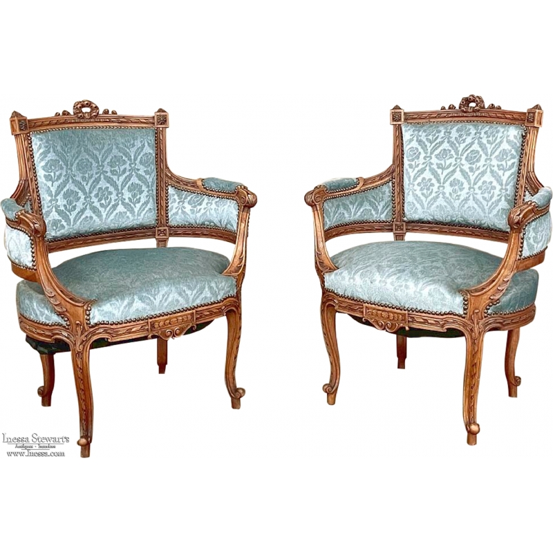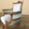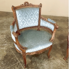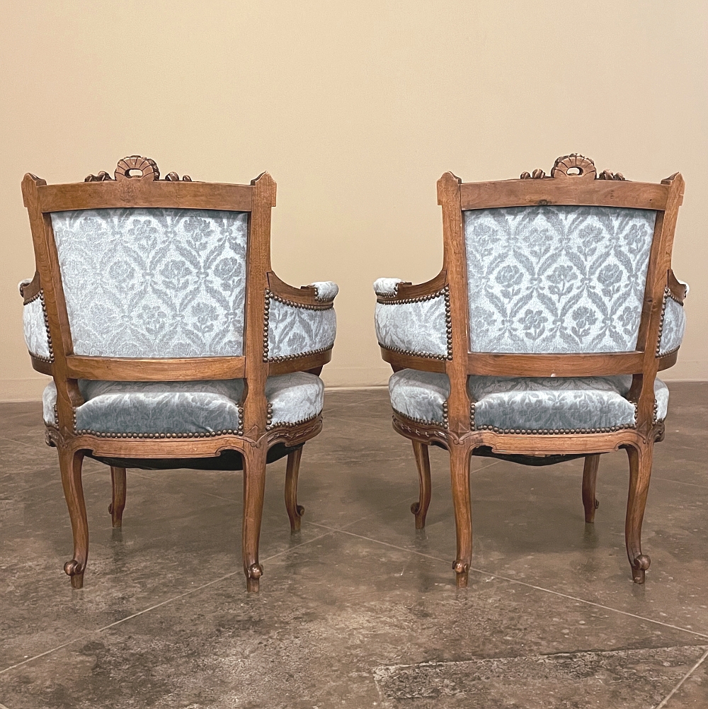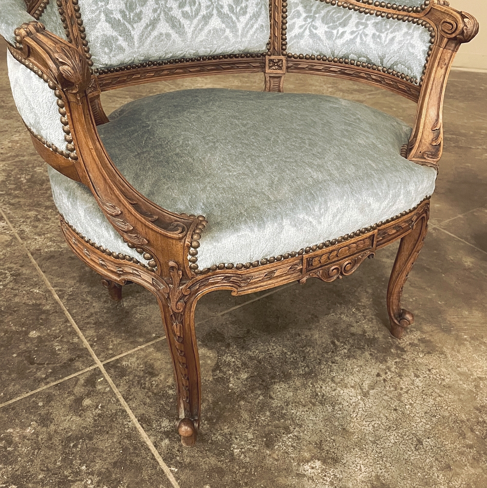 SalePair 19th Century French Louis XVI Walnut Bergeres ~ Armchairs is a remarkable combination of master furniture makers with exceedingly talented sculptors! Fashioned from sumptuous French walnut, each features a subtly curved seat back that joins with the more curvaceous armrests on each side, both of which are upholstered and topped with armrest pads. The generously sized seat works with this wraparound design to envelope you in comfort. The frame glorifies the sculptor's art, with a floral wreath flanked by sprays taking center stage, and rosettes atop the seatback corner posts, and acanthus plumes adorning the armrests and centered on the apron beneath a panel of Greek coin overlay. The entire frame's facade is connected with spiral ribbon trim throughout to bring the design together.