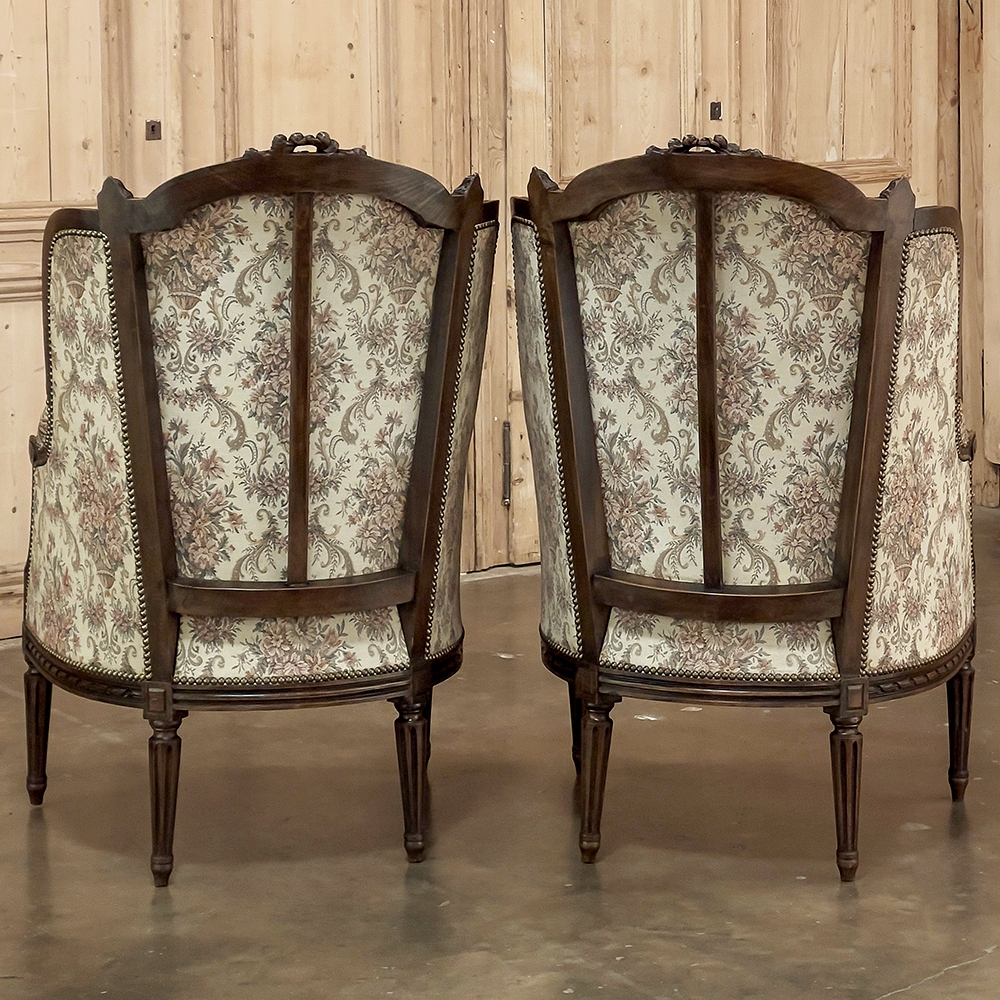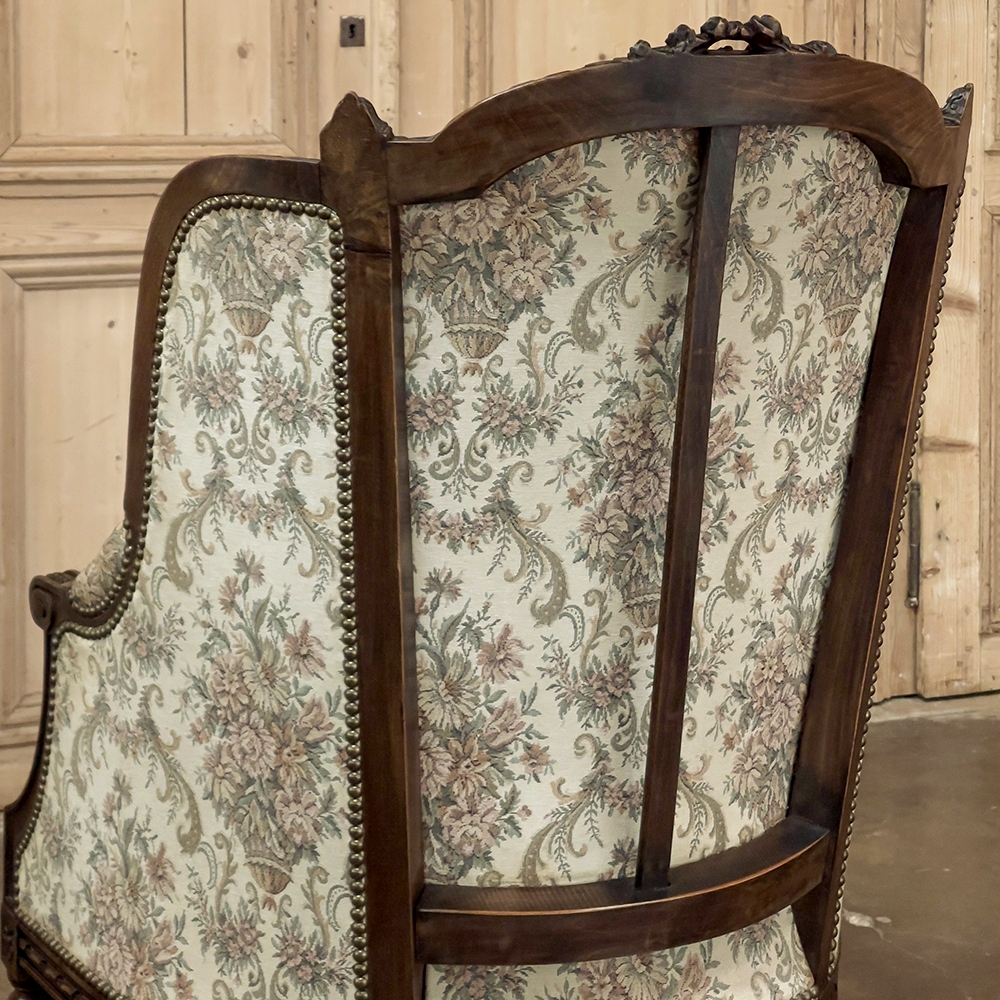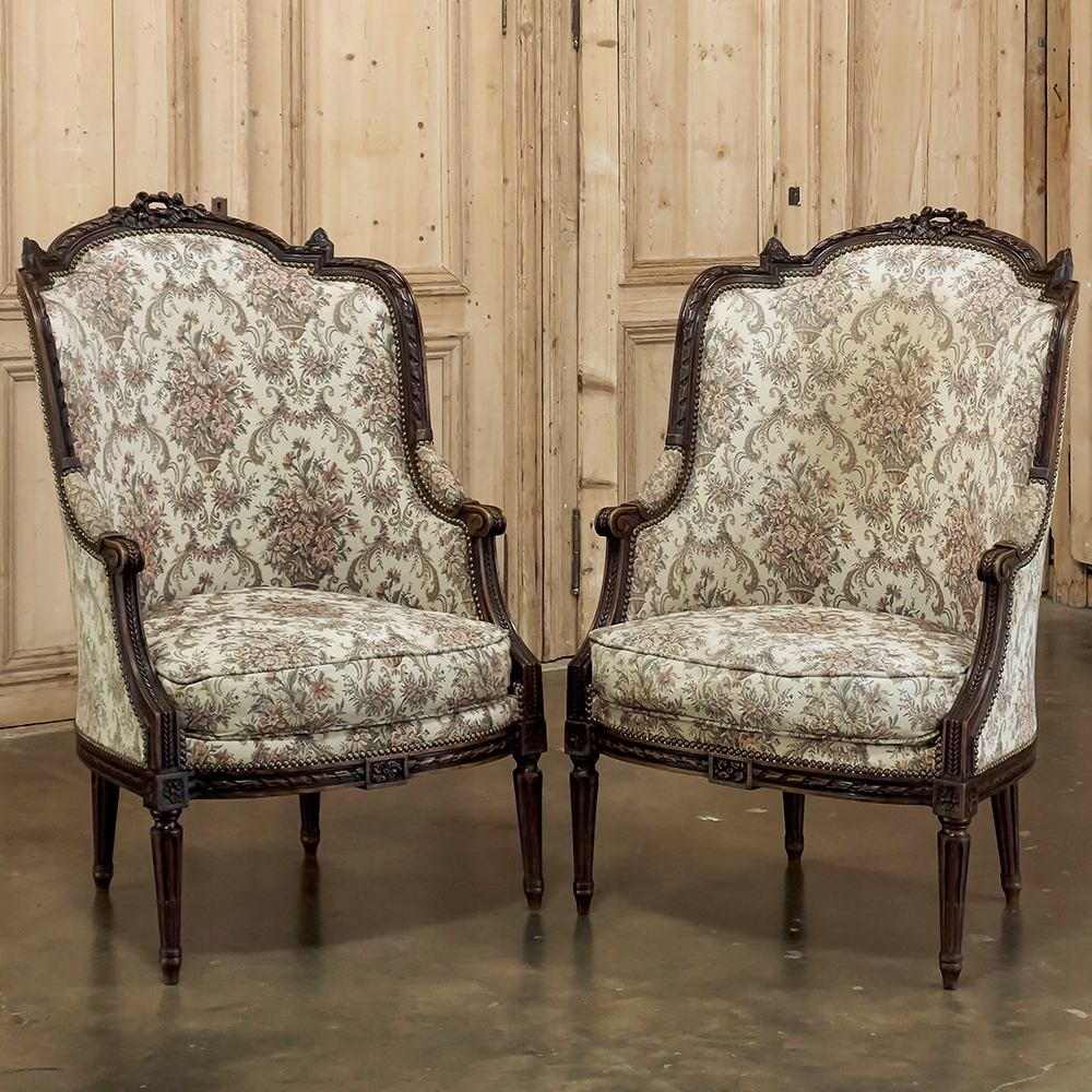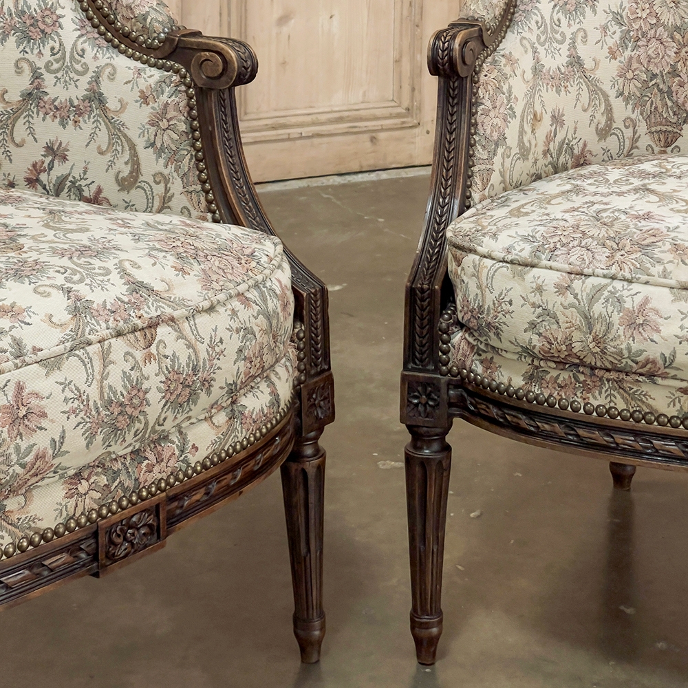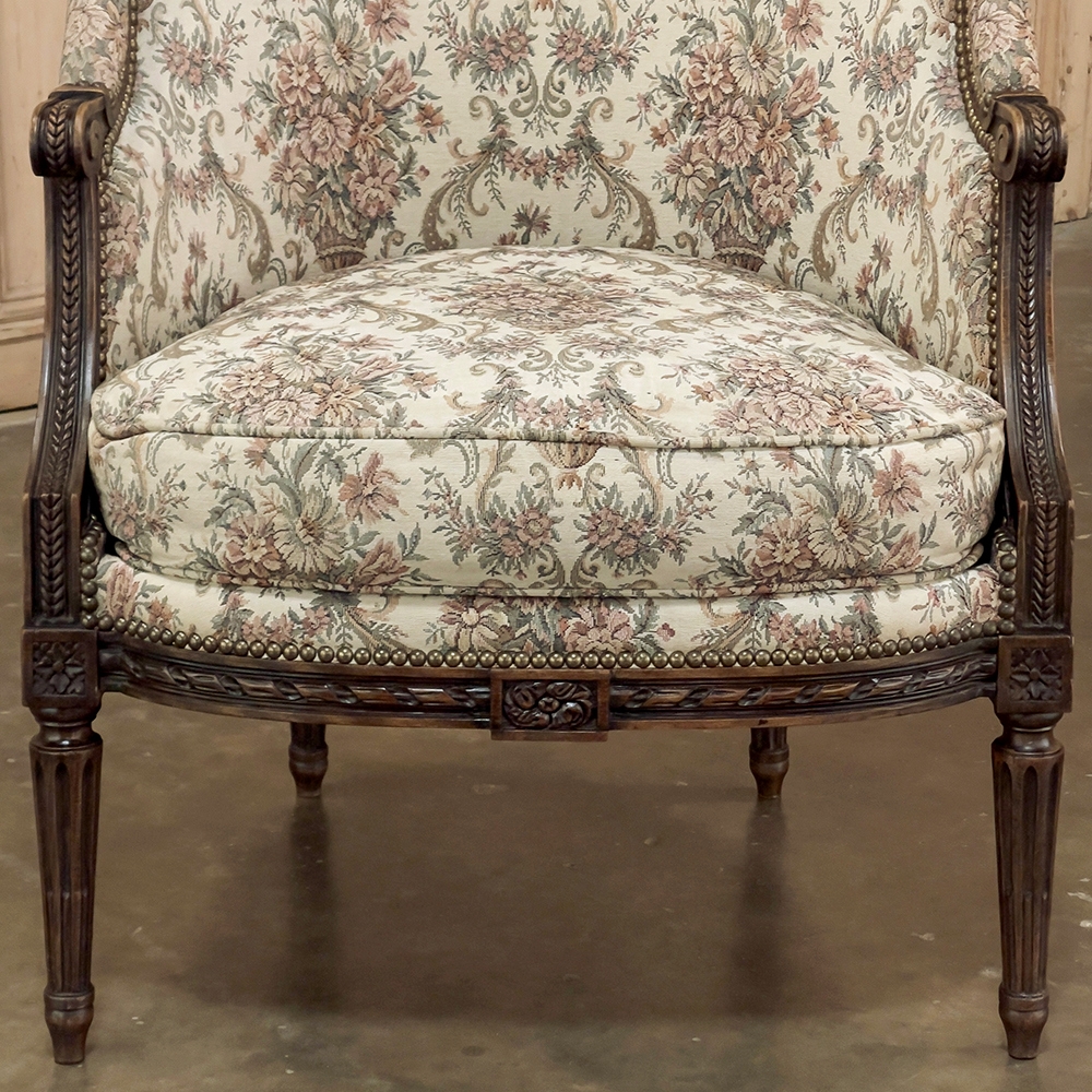 Pair 19th Century French Louis XVI Walnut Bergeres ~ Armchairs envelope one in comfort, and do it in classic style! Crafted from sumptuous French walnut, the design features an arched seat back crown accented with a small floral wreath with ribbon that converts to a spiral ribbon trim motif that continues down to the armrest cushions, and picks up again on the apron under the seat. In between, the armrest supports are carved with wheat motif for an interesting transition. Tapered and fluted legs provide support all around, with rosettes and a small center carving providing visual interest on the apron. Lavishly upholstered even on the back side with sumptuous pastel-hued tapestry, the fabric takes advantage of the wraparound design to surround one in comfort. The original concept behind such a design was to protect against drafts, and the inherent comfort in the design has endeared it to countless families for centuries. Hundreds of brass head tacks provide the perfect finishing touch.