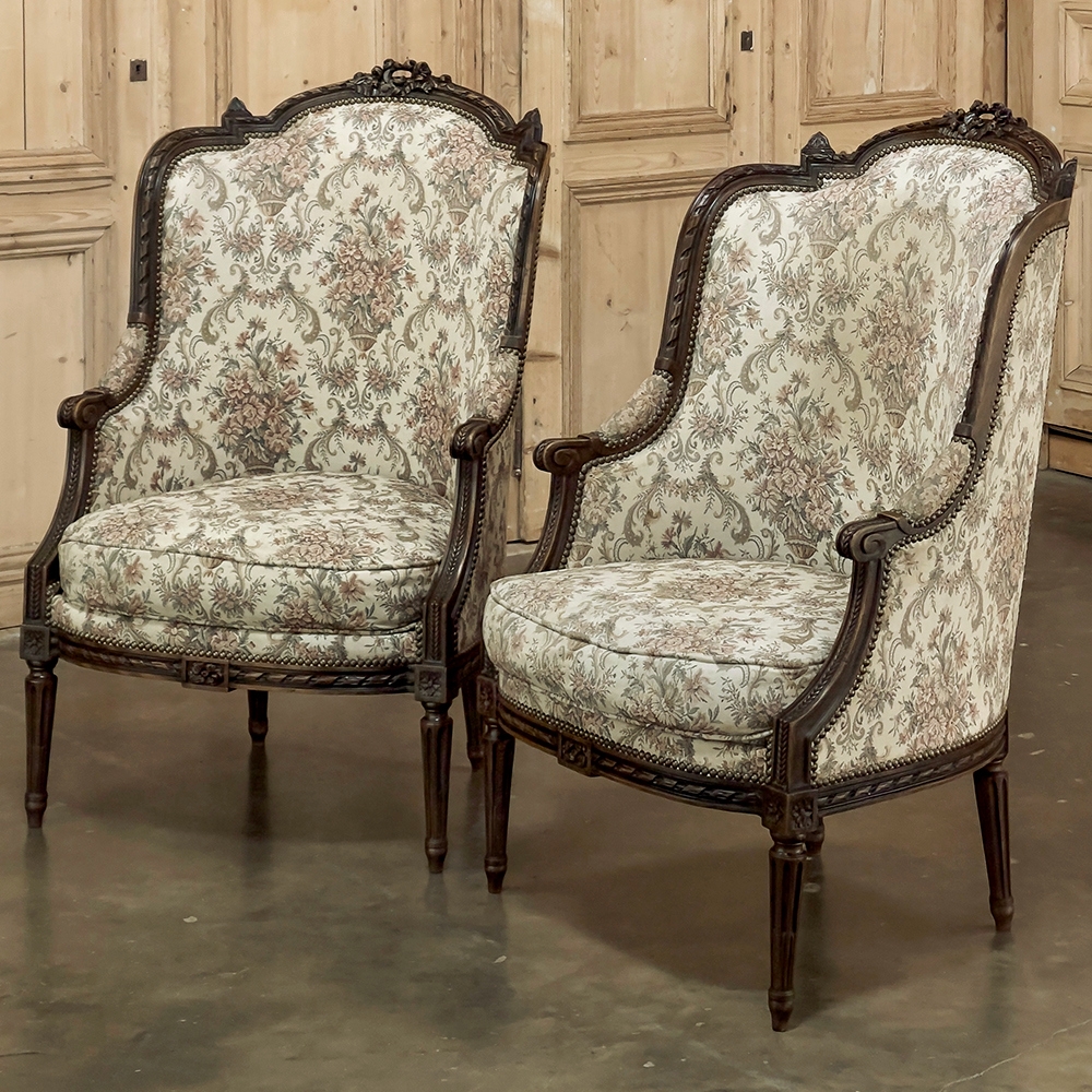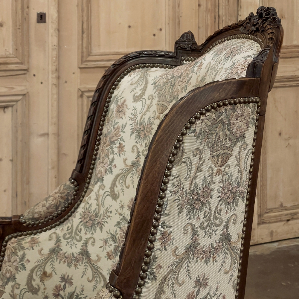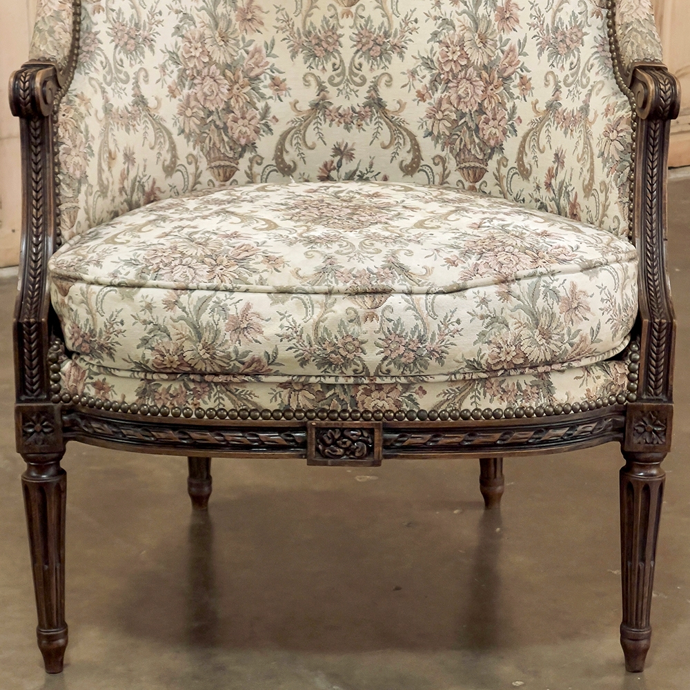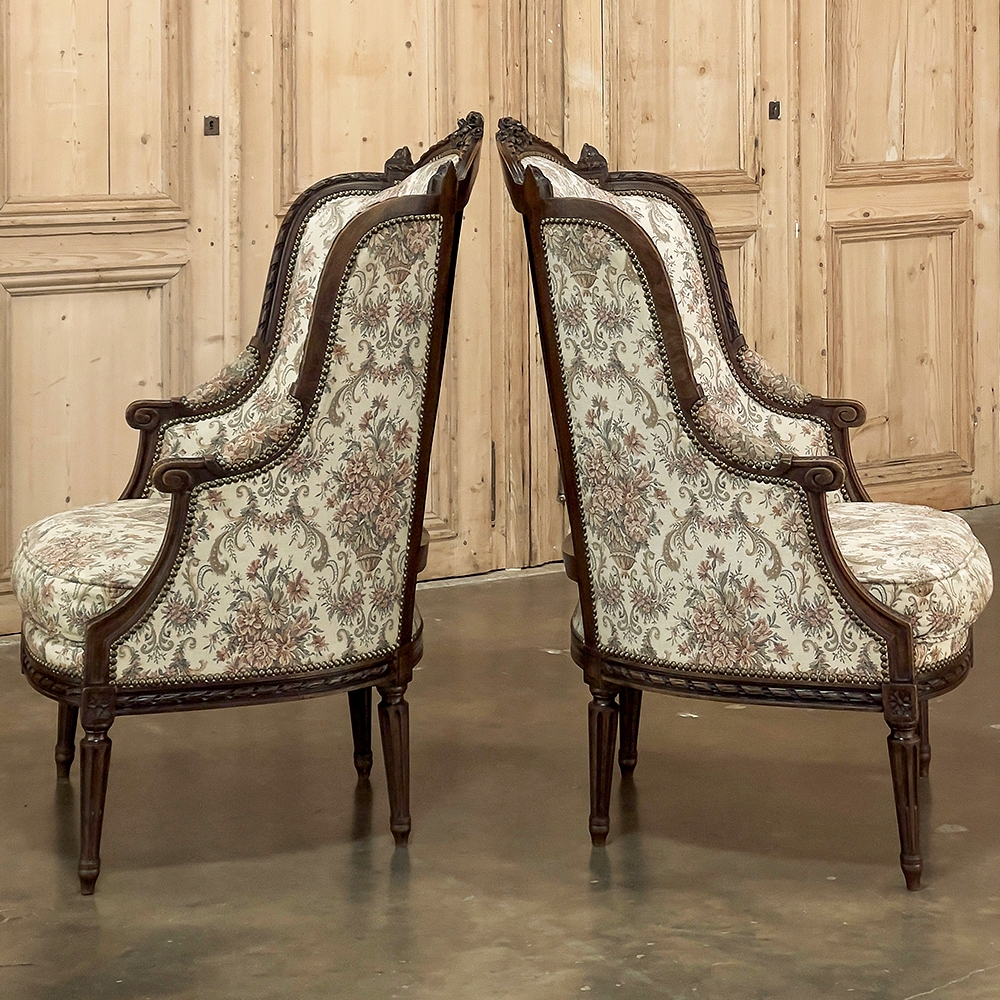 Pair 19th Century French Louis XVI Walnut Bergeres ~ Armchairs envelope one in comfort, and do it in classic style! Crafted from sumptuous French walnut, the design features an arched seat back crown accented with a small floral wreath with ribbon that converts to a spiral ribbon trim motif that continues down to the armrest cushions, and picks up again on the apron under the seat. In between, the armrest supports are carved with wheat motif for an interesting transition. Tapered and fluted legs provide support all around, with rosettes and a small center carving providing visual interest on the apron. Lavishly upholstered even on the back side with sumptuous pastel-hued tapestry, the fabric takes advantage of the wraparound design to surround one in comfort. The original concept behind such a design was to protect against drafts, and the inherent comfort in the design has endeared it to countless families for centuries. Hundreds of brass head tacks provide the perfect finishing touch.