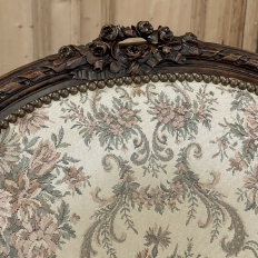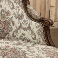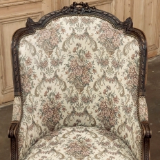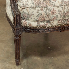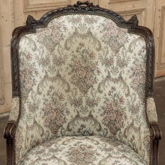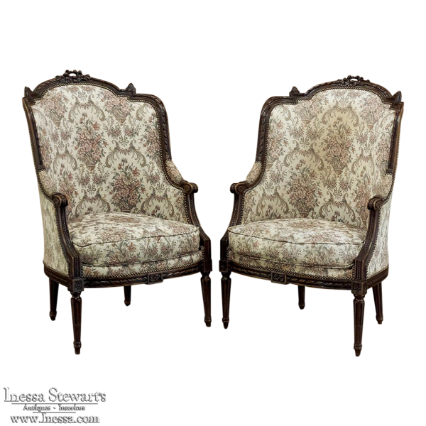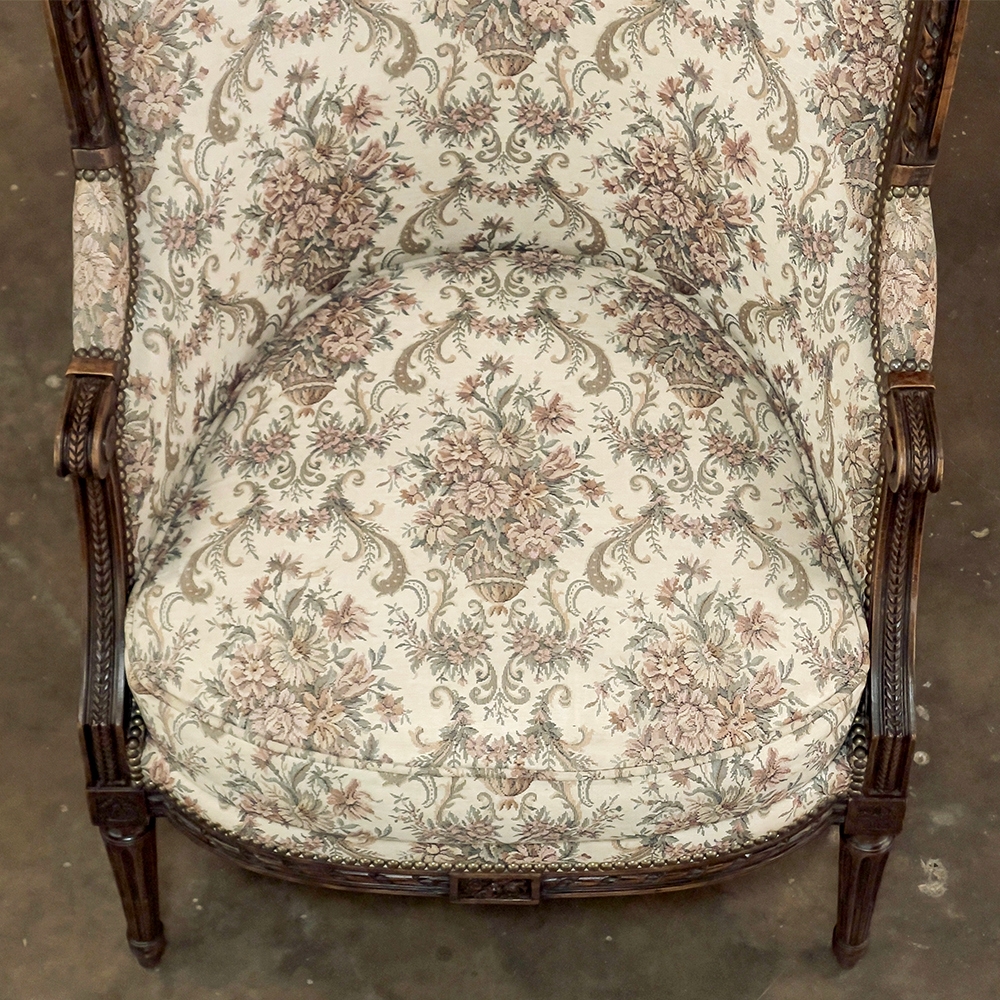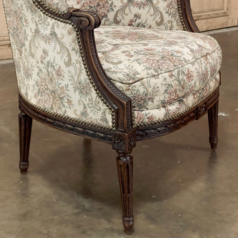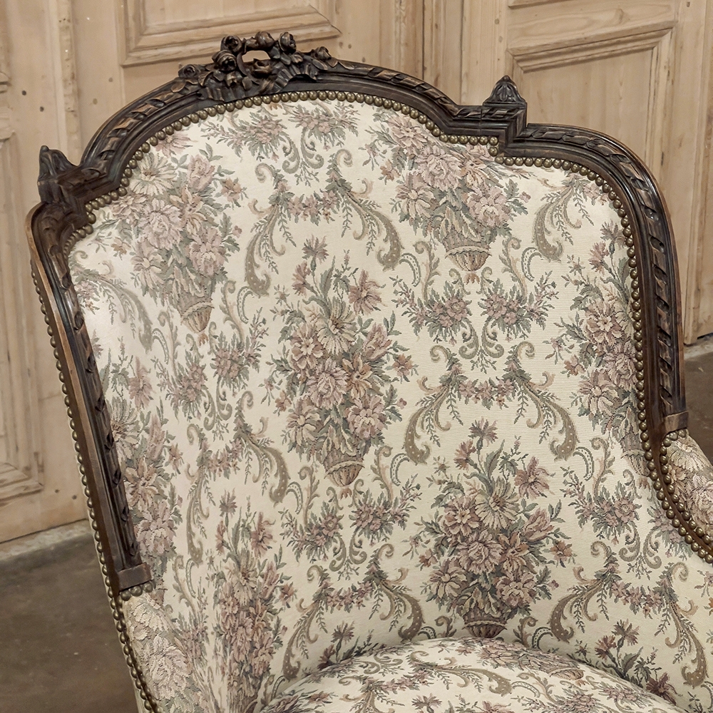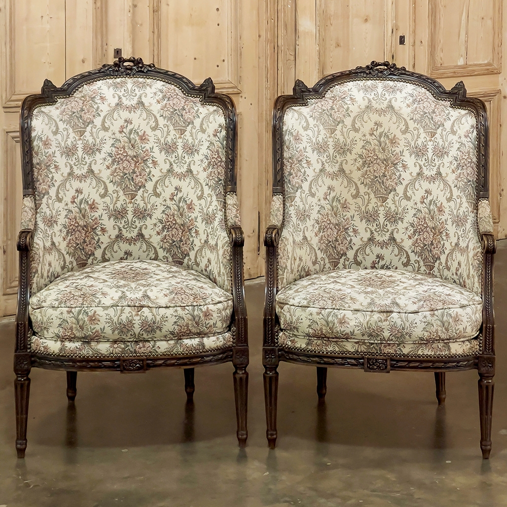 Pair 19th Century French Louis XVI Walnut Bergeres ~ Armchairs envelope one in comfort, and do it in classic style! Crafted from sumptuous French walnut, the design features an arched seat back crown accented with a small floral wreath with ribbon that converts to a spiral ribbon trim motif that continues down to the armrest cushions, and picks up again on the apron under the seat. In between, the armrest supports are carved with wheat motif for an interesting transition. Tapered and fluted legs provide support all around, with rosettes and a small center carving providing visual interest on the apron. Lavishly upholstered even on the back side with sumptuous pastel-hued tapestry, the fabric takes advantage of the wraparound design to surround one in comfort. The original concept behind such a design was to protect against drafts, and the inherent comfort in the design has endeared it to countless families for centuries. Hundreds of brass head tacks provide the perfect finishing touch.