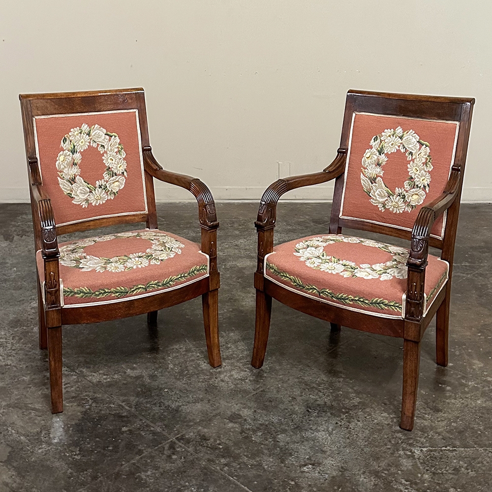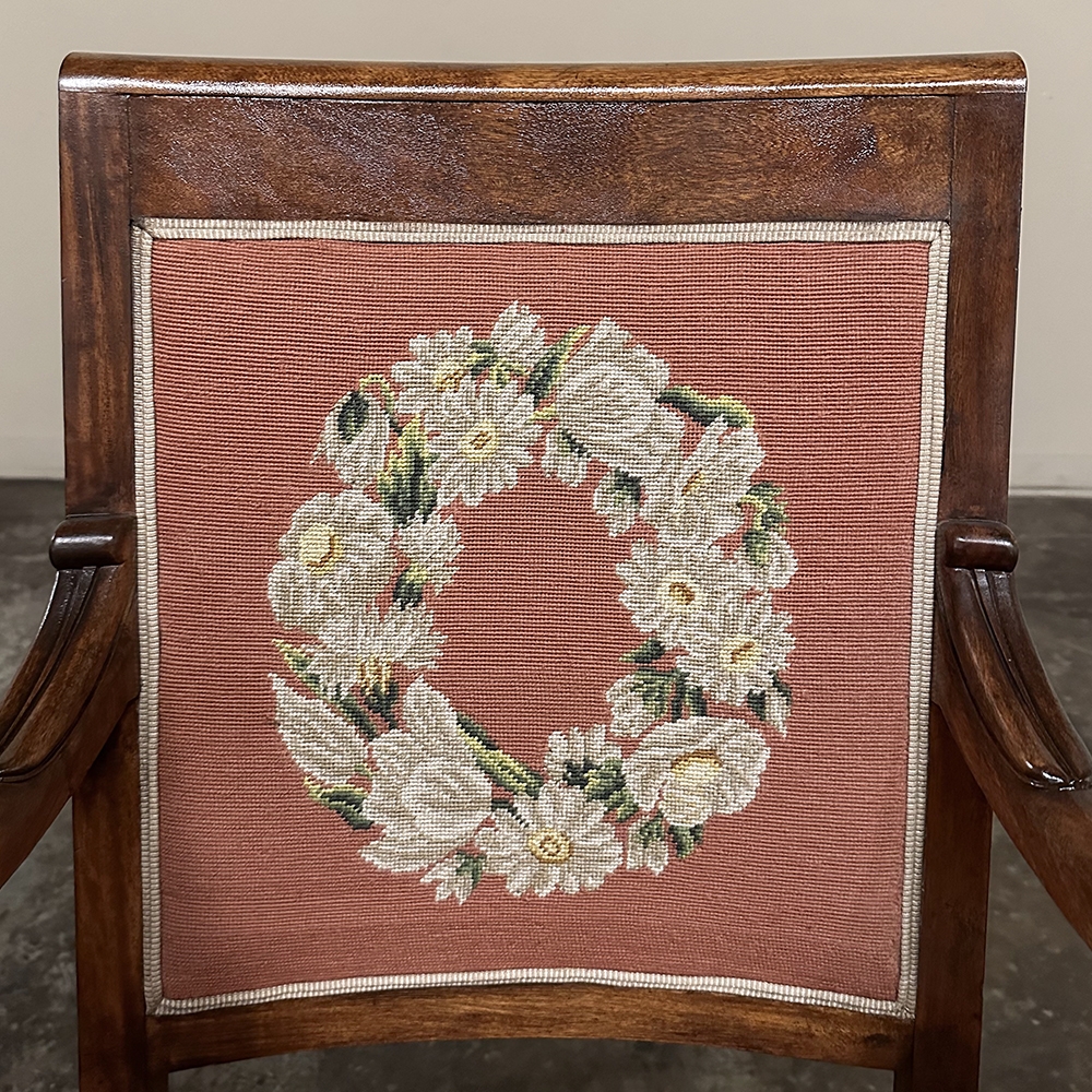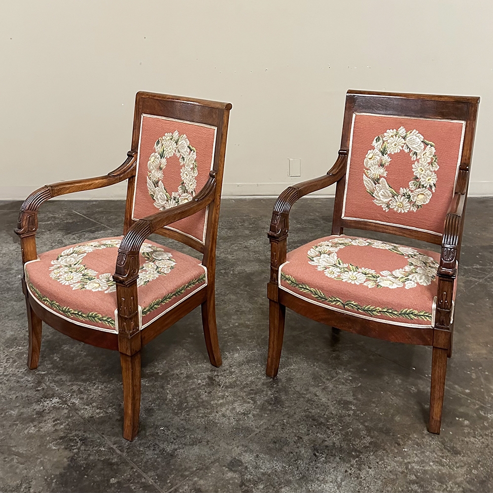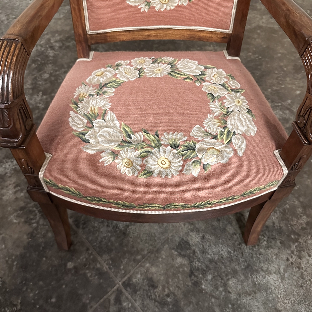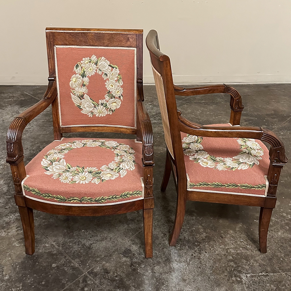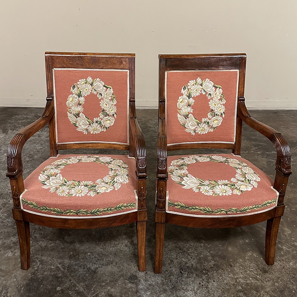 PAIR 19th Century French Mahogany Empire Armchairs with Needlepoint Tapestry was literally designed to last for centuries! Hand-crafted from highly revered exotic imported mahogany from the Americas, the frameworks were adorned with a modicum of carved detail yet still allow the sheer natural beauty of the sumptuous wood to show forth. The carvings on the armrests and armrest supports were inspired by ancient Egyptian themes which so captivated Napoleon during his forays beyond the French borders. His nephew, Napoleon III, rekindled the style during the period in which these were made, using the same exotic wood, impeccable French furniture craftsmanship, and exquisite hand-knotted needlepoint tapestry for the seat and seat back that depict floral wreaths and laurel sprays with amazing realism and color retention, indicating these have been coddled and protected for over 150 years!