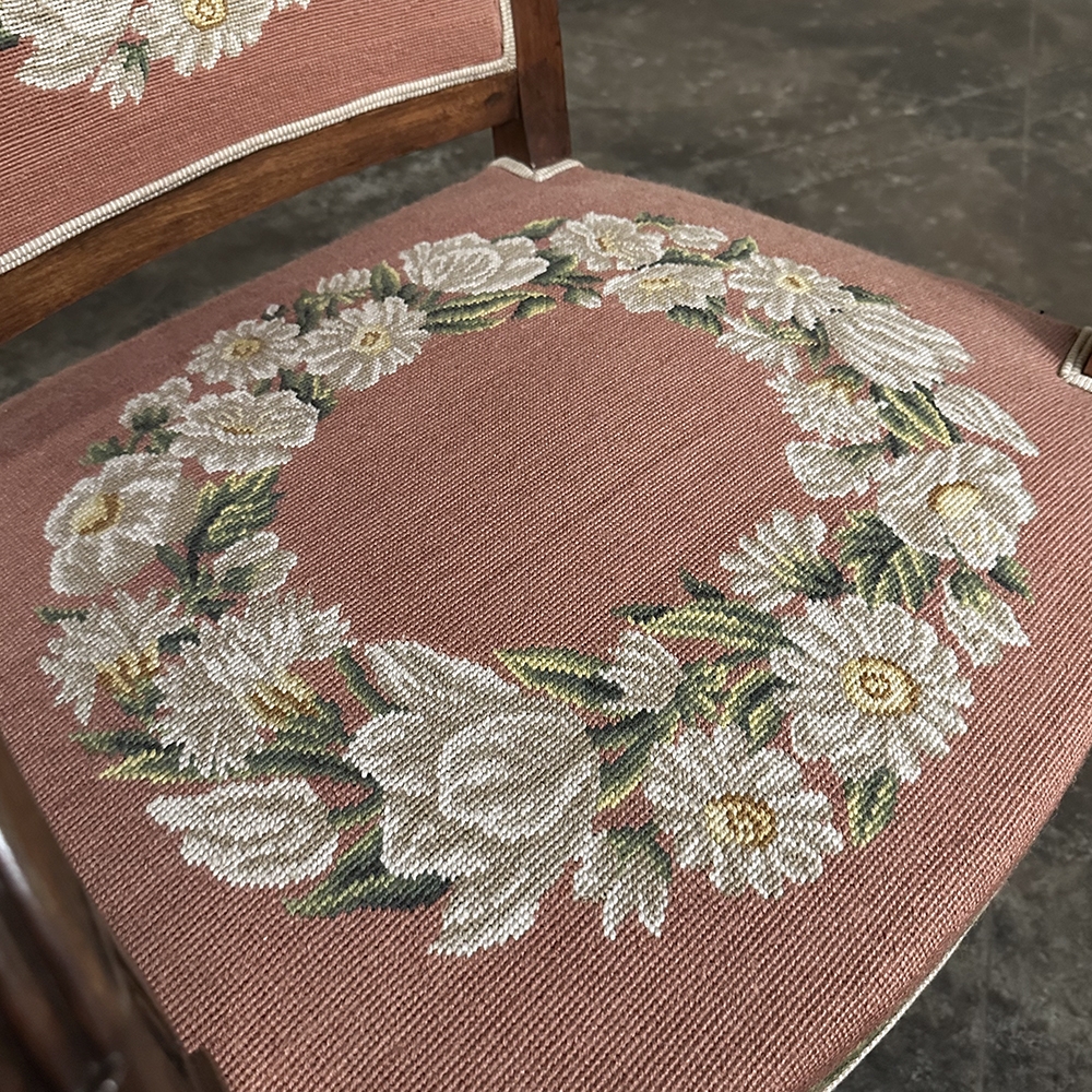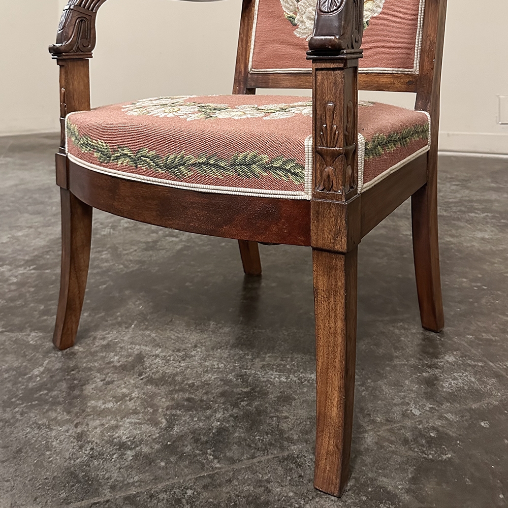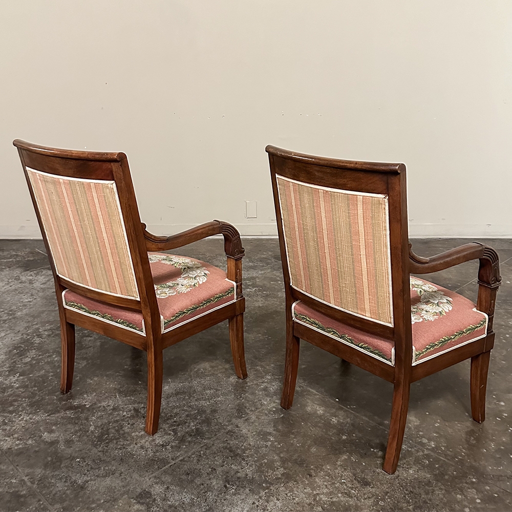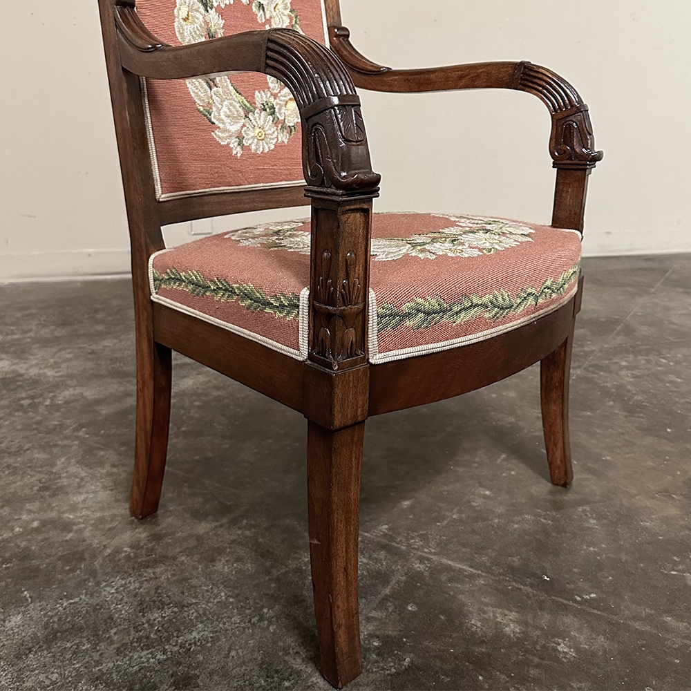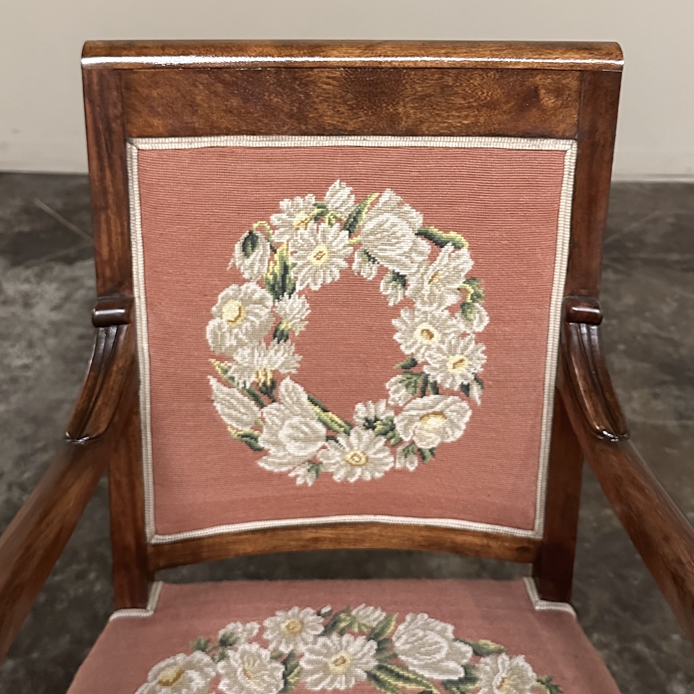 PAIR 19th Century French Mahogany Empire Armchairs with Needlepoint Tapestry was literally designed to last for centuries! Hand-crafted from highly revered exotic imported mahogany from the Americas, the frameworks were adorned with a modicum of carved detail yet still allow the sheer natural beauty of the sumptuous wood to show forth. The carvings on the armrests and armrest supports were inspired by ancient Egyptian themes which so captivated Napoleon during his forays beyond the French borders. His nephew, Napoleon III, rekindled the style during the period in which these were made, using the same exotic wood, impeccable French furniture craftsmanship, and exquisite hand-knotted needlepoint tapestry for the seat and seat back that depict floral wreaths and laurel sprays with amazing realism and color retention, indicating these have been coddled and protected for over 150 years!