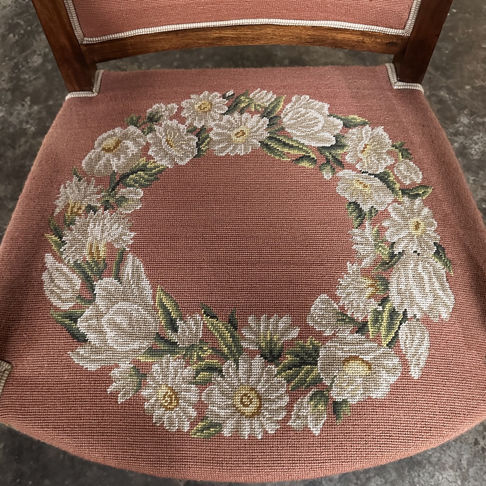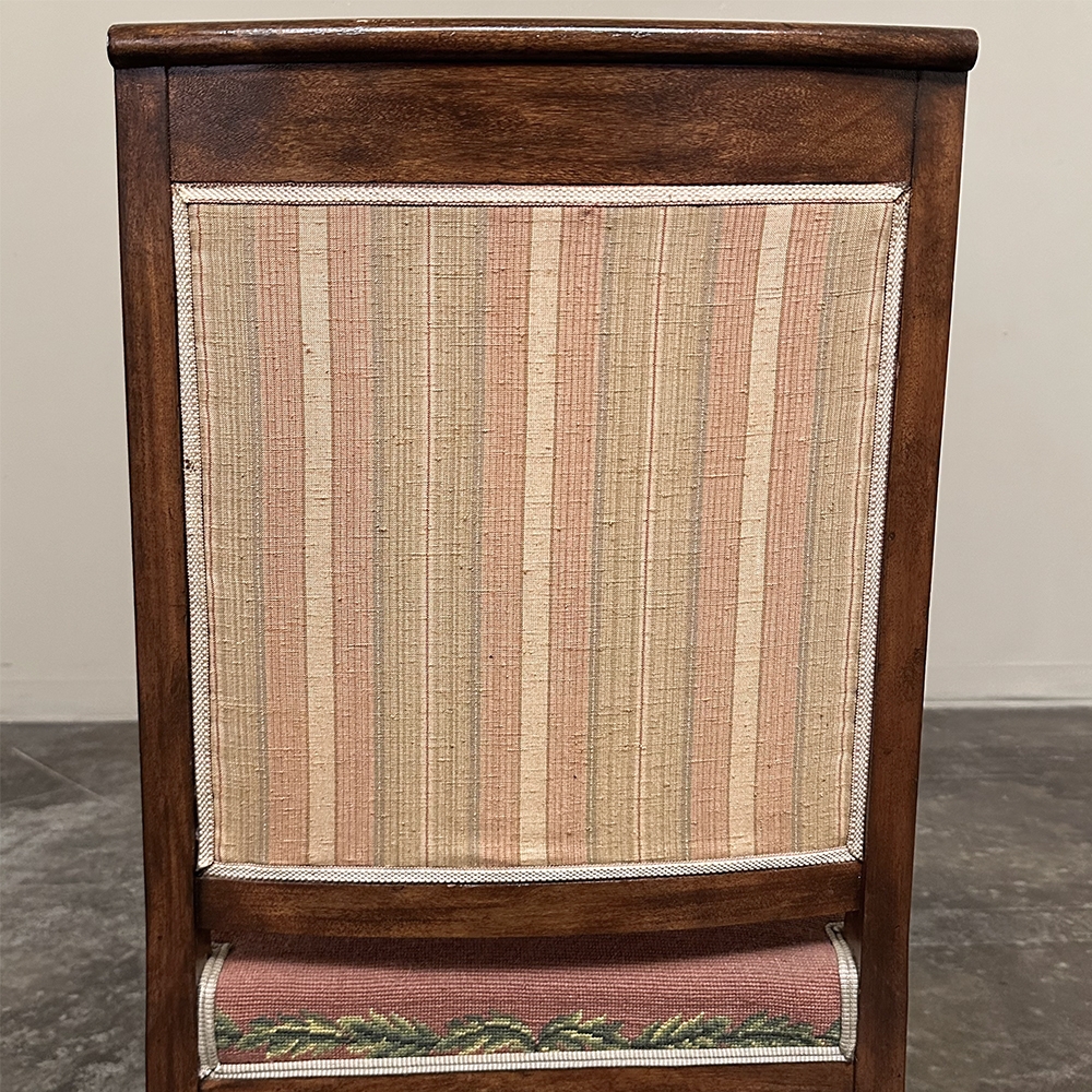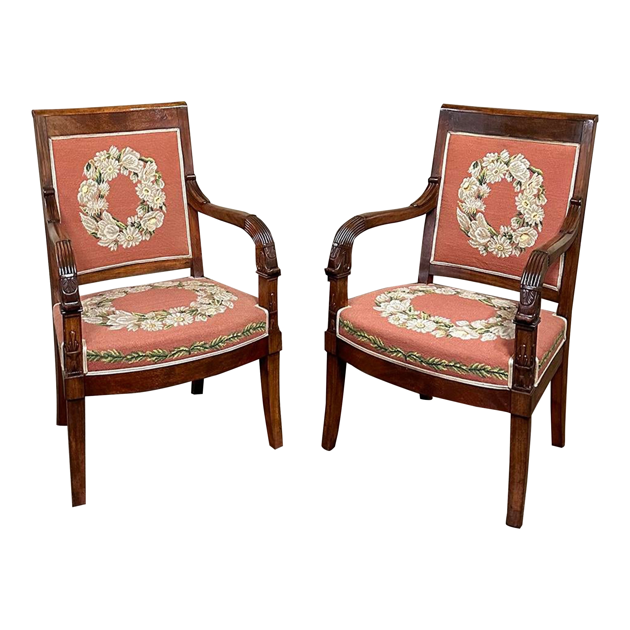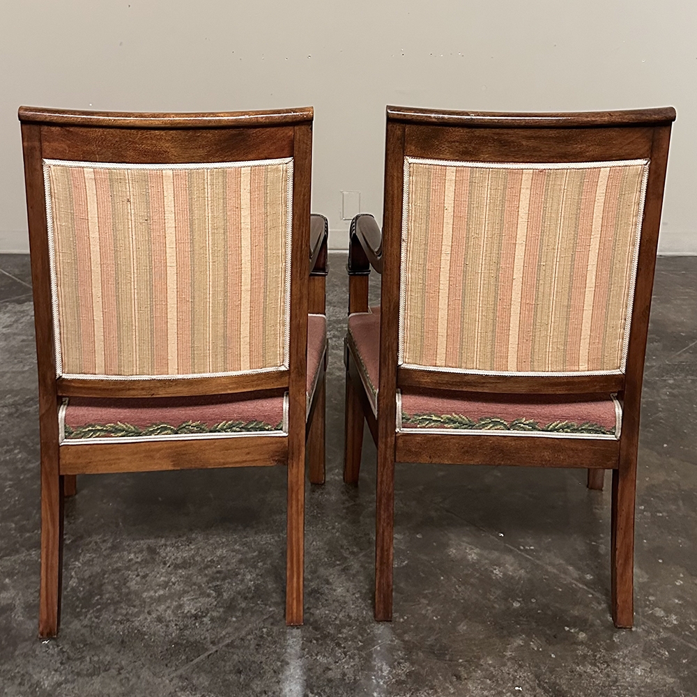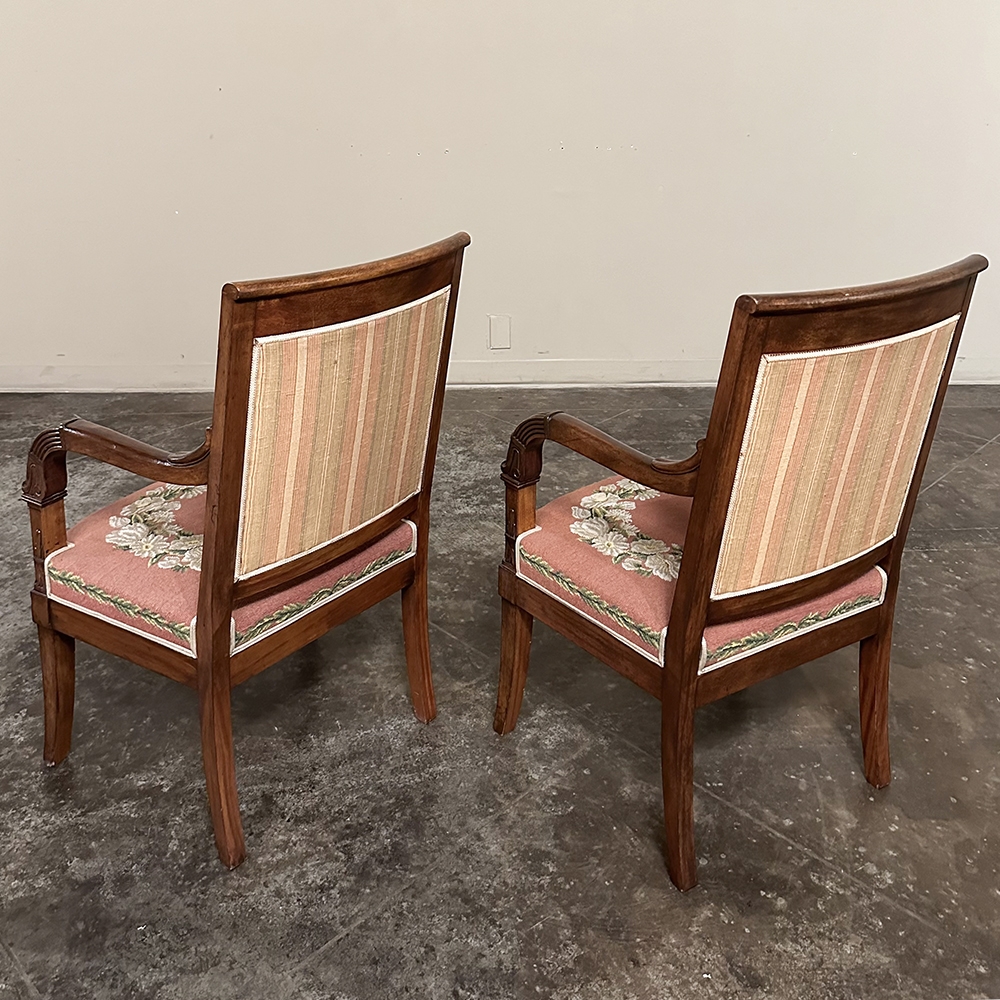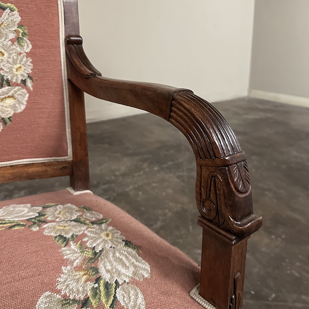 PAIR 19th Century French Mahogany Empire Armchairs with Needlepoint Tapestry was literally designed to last for centuries! Hand-crafted from highly revered exotic imported mahogany from the Americas, the frameworks were adorned with a modicum of carved detail yet still allow the sheer natural beauty of the sumptuous wood to show forth. The carvings on the armrests and armrest supports were inspired by ancient Egyptian themes which so captivated Napoleon during his forays beyond the French borders. His nephew, Napoleon III, rekindled the style during the period in which these were made, using the same exotic wood, impeccable French furniture craftsmanship, and exquisite hand-knotted needlepoint tapestry for the seat and seat back that depict floral wreaths and laurel sprays with amazing realism and color retention, indicating these have been coddled and protected for over 150 years!