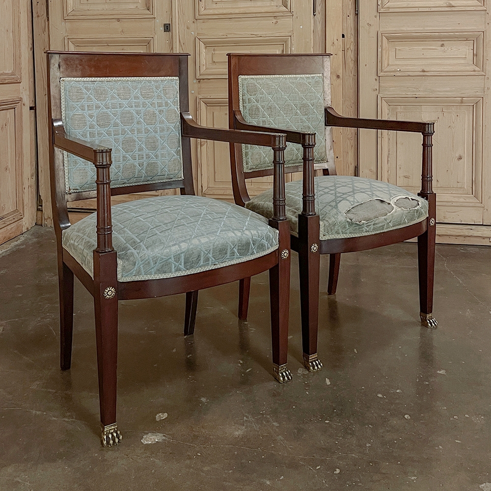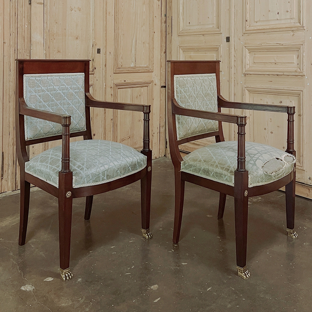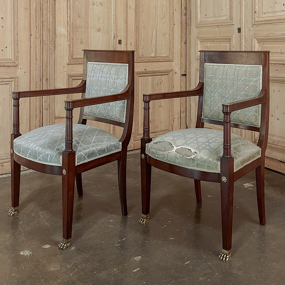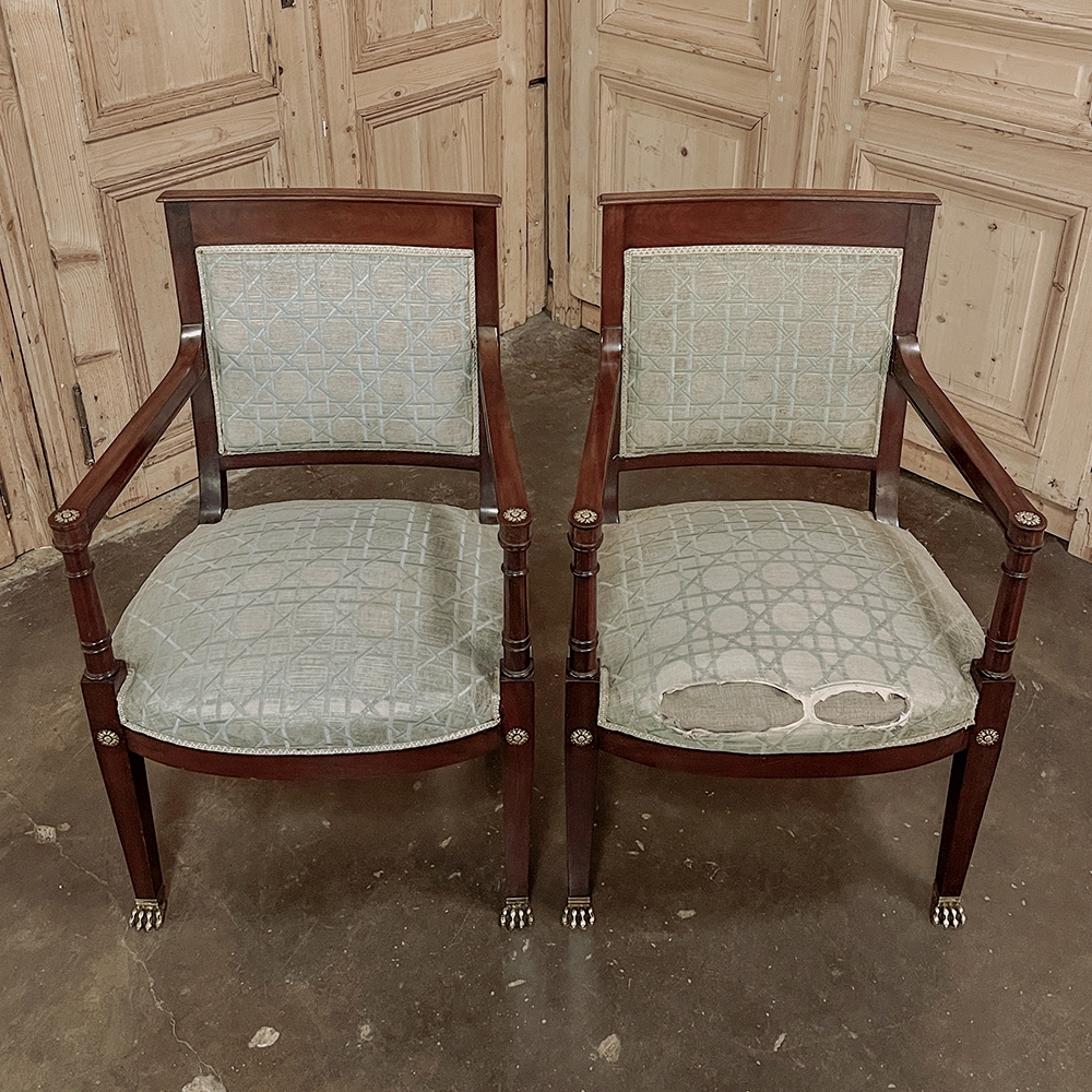 Pair 19th Century French Napoleon III Period Mahogany Armchairs reflects the stately classically-inspired architecture of the ancients, accentuated by bronze castings of rosettes and lions' paw feet which contrast beautifully with the rich sumptuousness of the exotic imported mahogany frames. Upholstery needs to be replaced.