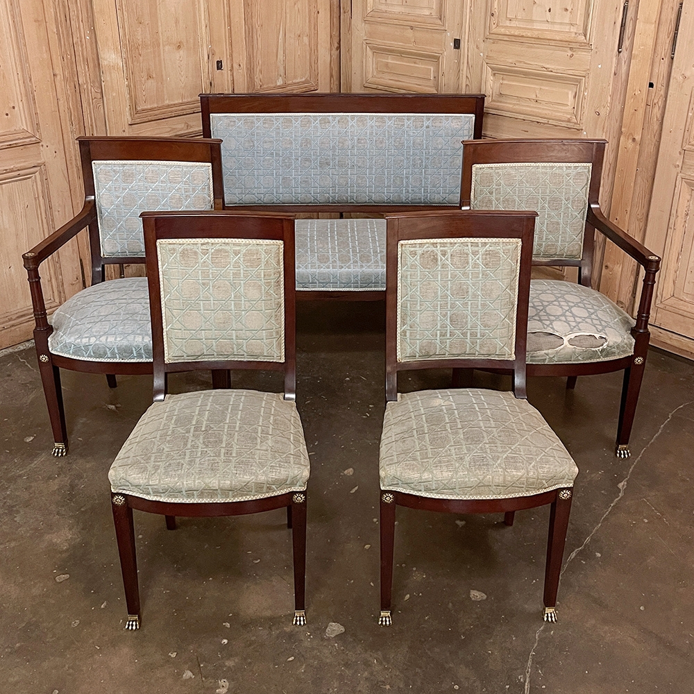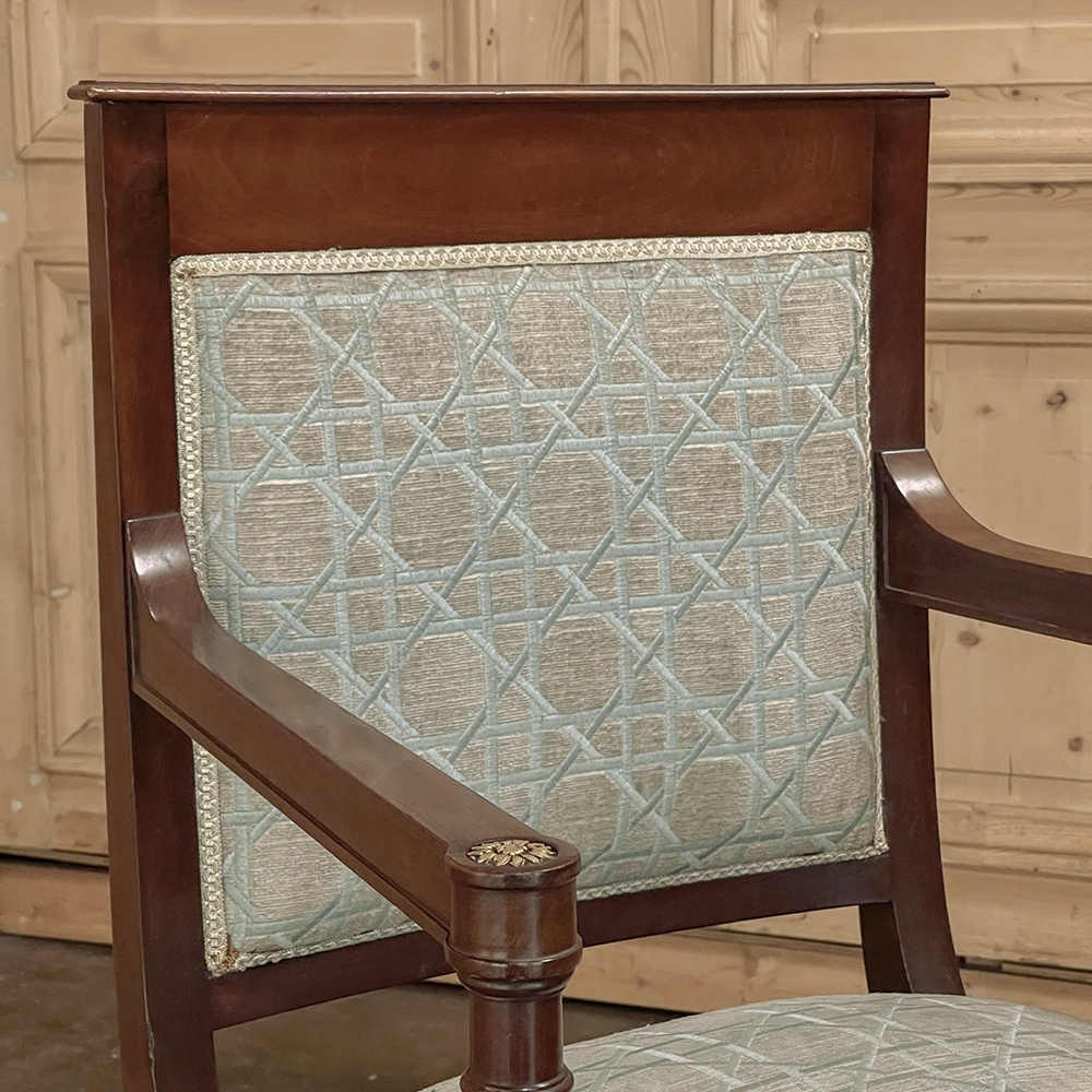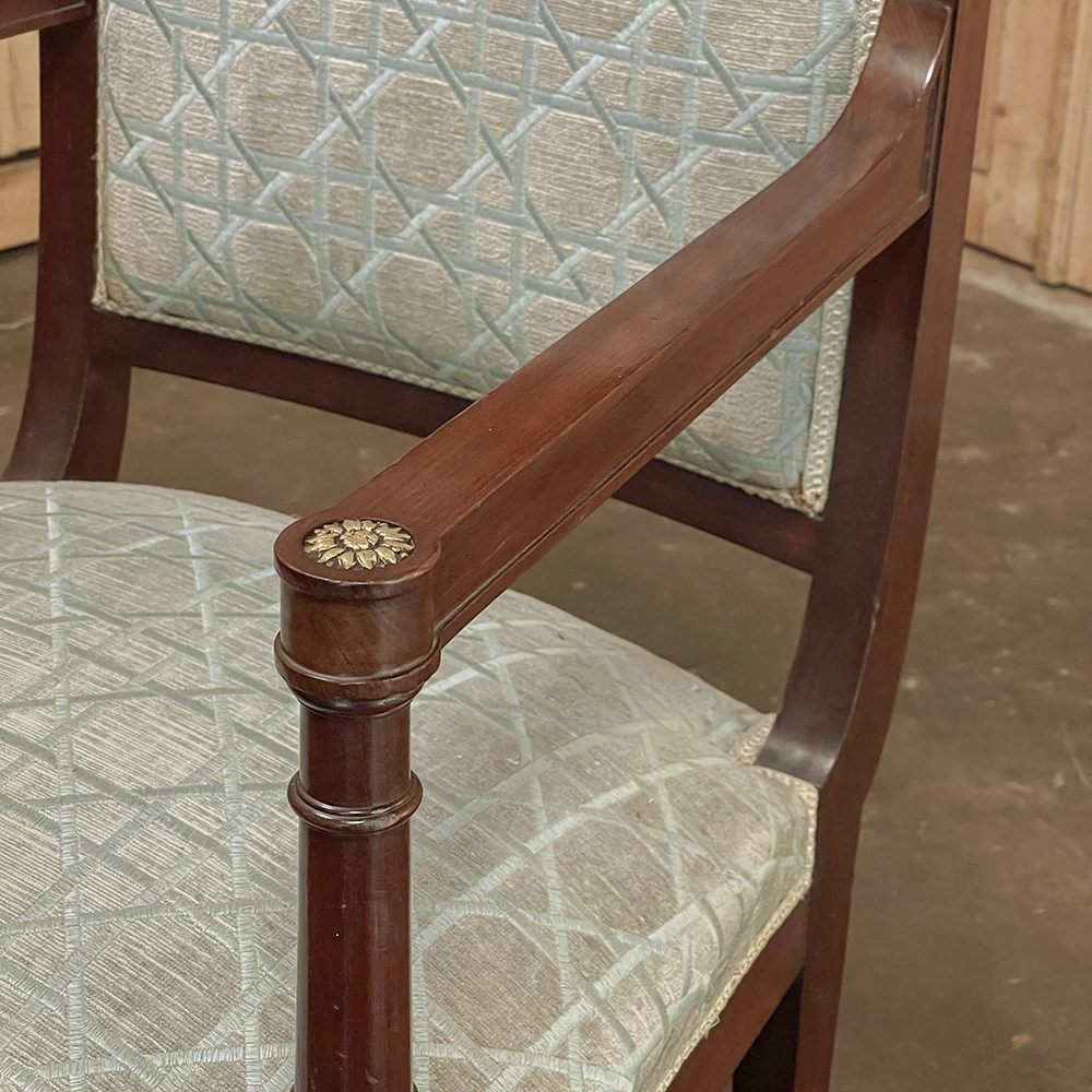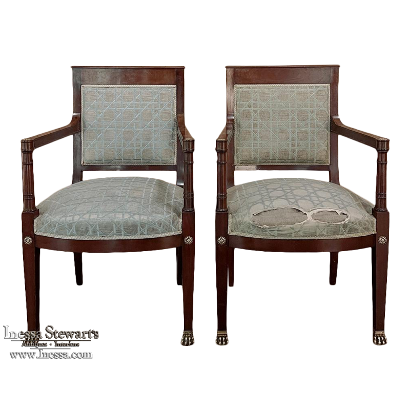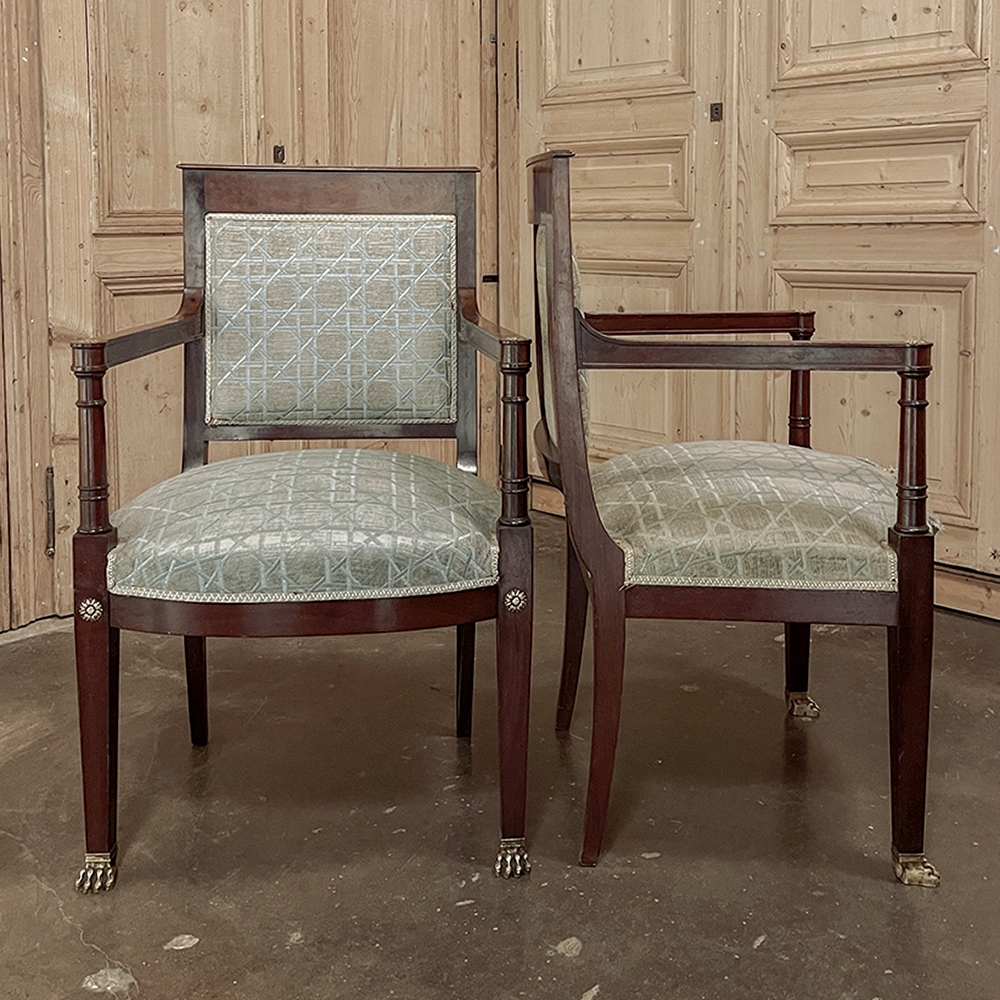 Pair 19th Century French Napoleon III Period Mahogany Armchairs reflects the stately classically-inspired architecture of the ancients, accentuated by bronze castings of rosettes and lions' paw feet which contrast beautifully with the rich sumptuousness of the exotic imported mahogany frames. Upholstery needs to be replaced.