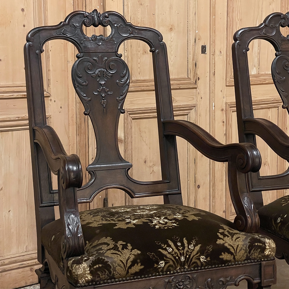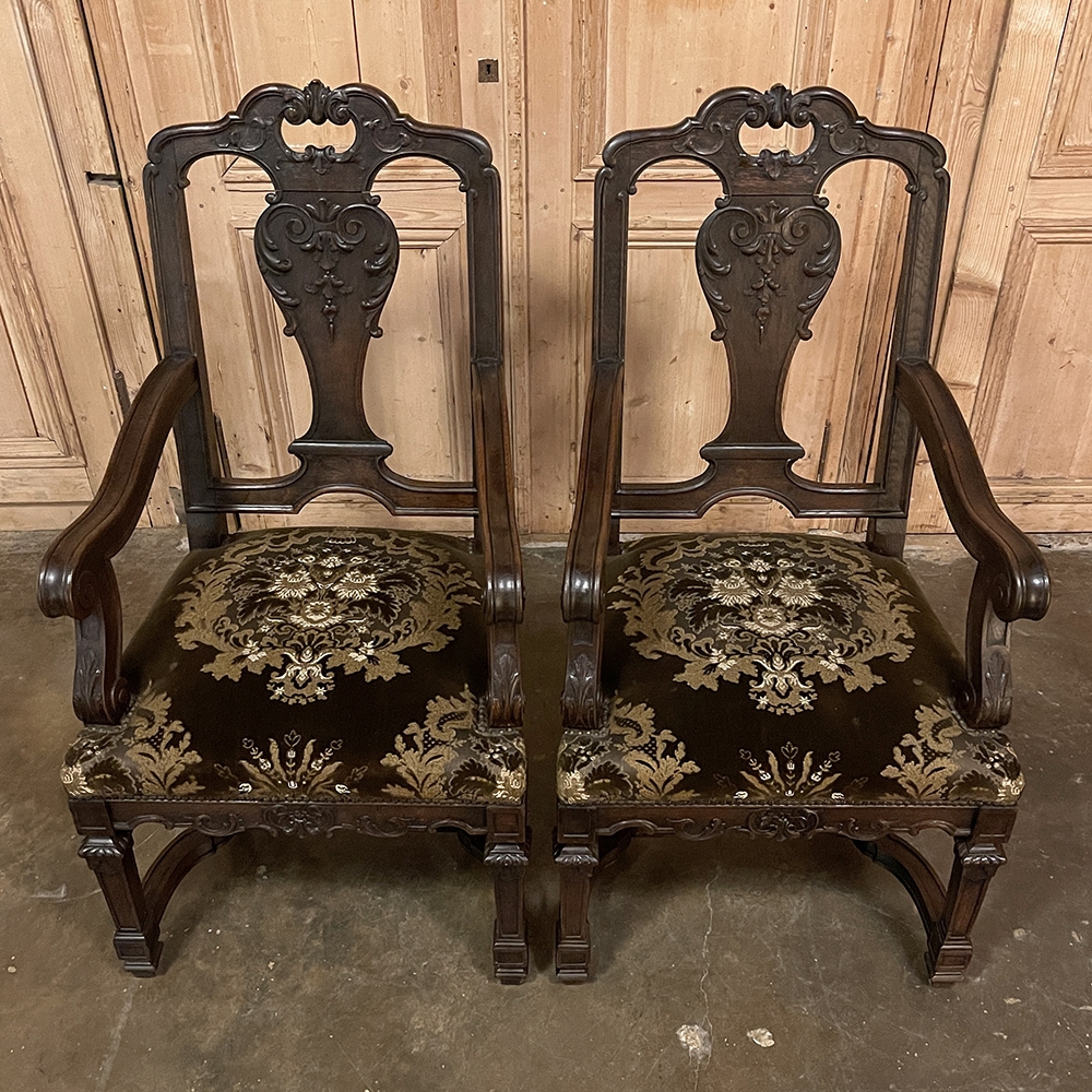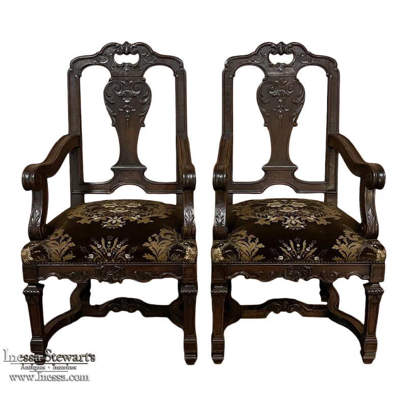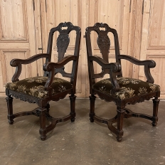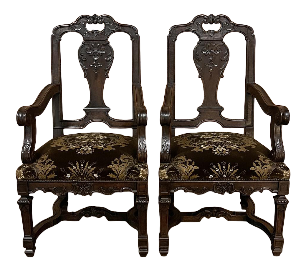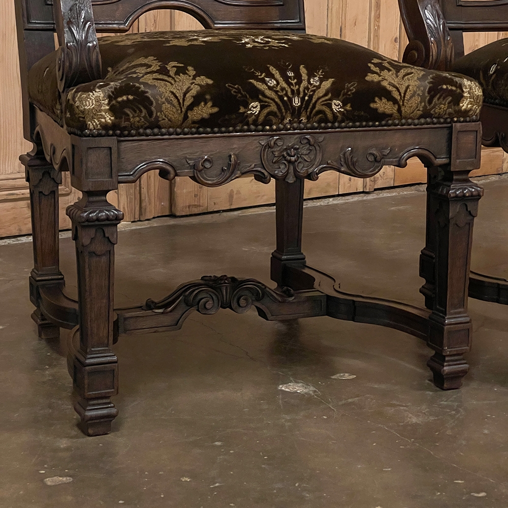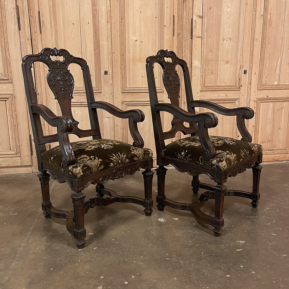 Pair Antique French Louis XIV Armchairs ~ Fauteuils will bring a truly regal air to your room, along with some surprisingly comfortable seating! Hand-crafted from thick planks and posts of solid old-growth oak, each features an arched seatback design with carved foliates over an urn-shaped backsplat also carved with foliates. The seatback is connected to the frame in front with gracefully scrolled armrests leading the eye down to the luxurious damascene mohair upholstery of the seat. A handsomely contoured apron carved with foliates spans the entire width, supported by four tapered and carved column style legs. The legs are connected with a version of the classic "H" stretcher, centered with foliate motifs that match the apron.