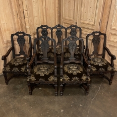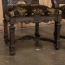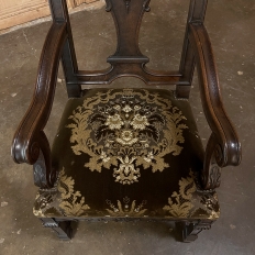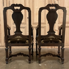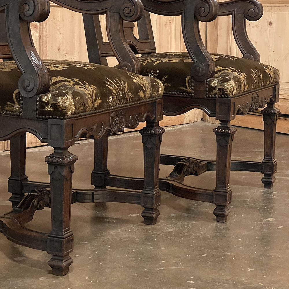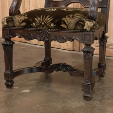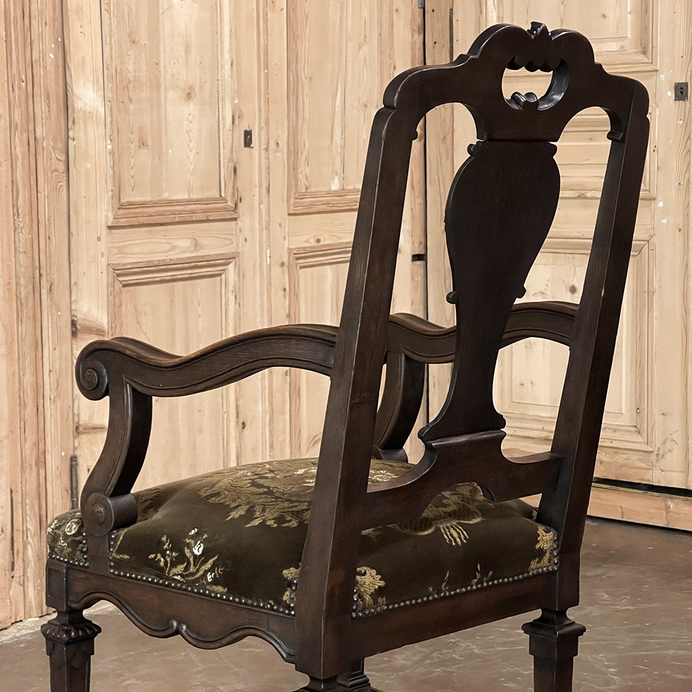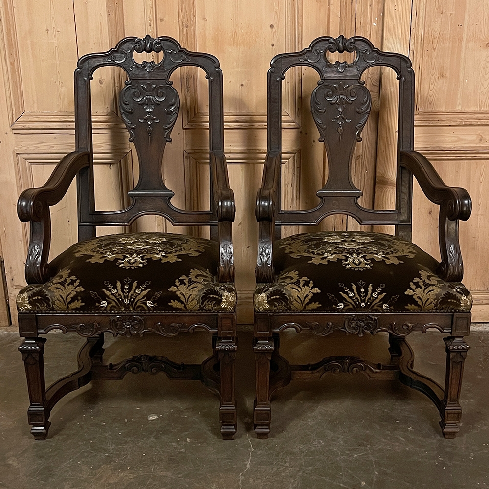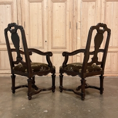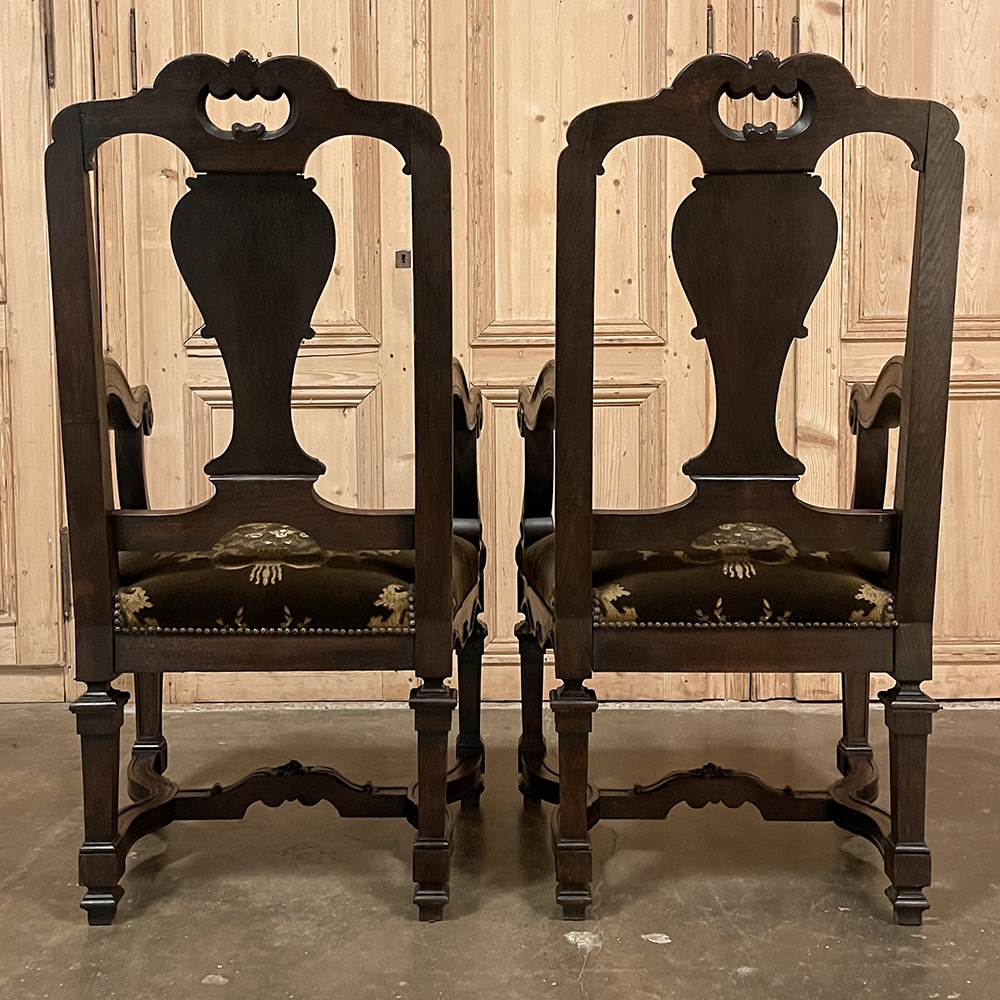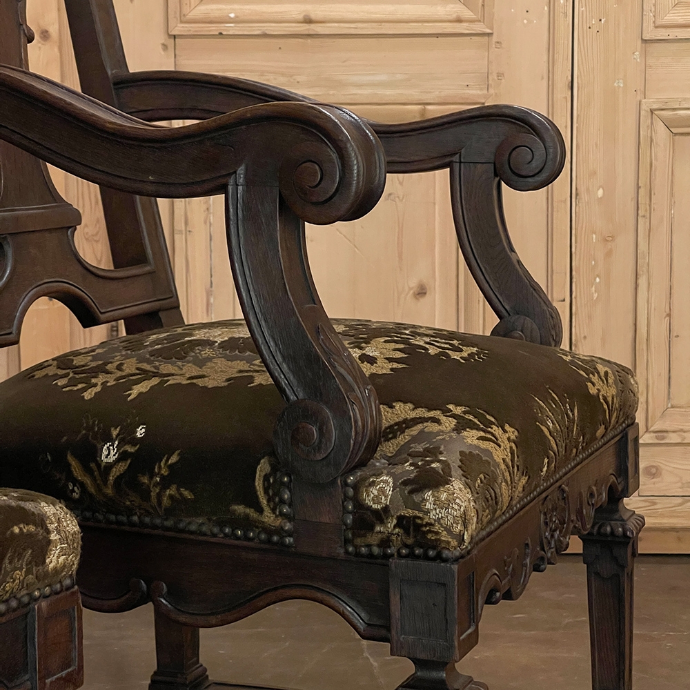 Pair Antique French Louis XIV Armchairs ~ Fauteuils will bring a truly regal air to your room, along with some surprisingly comfortable seating! Hand-crafted from thick planks and posts of solid old-growth oak, each features an arched seatback design with carved foliates over an urn-shaped backsplat also carved with foliates. The seatback is connected to the frame in front with gracefully scrolled armrests leading the eye down to the luxurious damascene mohair upholstery of the seat. A handsomely contoured apron carved with foliates spans the entire width, supported by four tapered and carved column style legs. The legs are connected with a version of the classic "H" stretcher, centered with foliate motifs that match the apron.