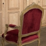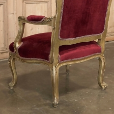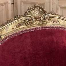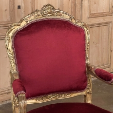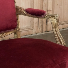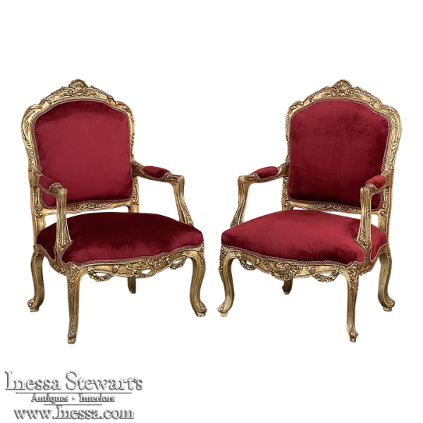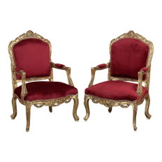 Pair Antique French Louis XIV Giltwood Armchairs ~ Fauteuils will add timeless grace and elegance to your room worthy of the kings of France! Each frame is meticulously sculpted with elegant scrolled form then lavished with shell, floral and foliate motifs from the seatback crown to the tips of the feet. The apron even includes flower garlands suspended below the contour of the apron itself. Even the armrest supports are lovingly carved. All four legs feature the timeless cabriole form with upturned acanthus fronds on the shoulders as well as on the tips of the feet, for an attractive visual presence no matter the angle! Recently upholstered in luxurious burgundy mohair for a truly opulent finish.