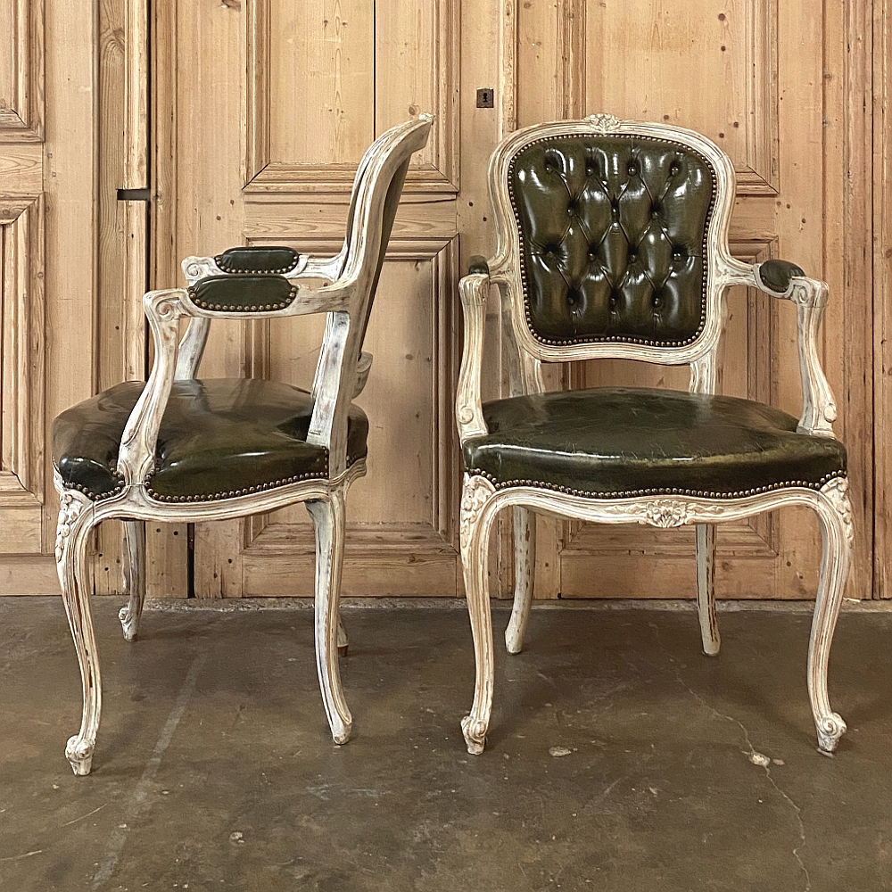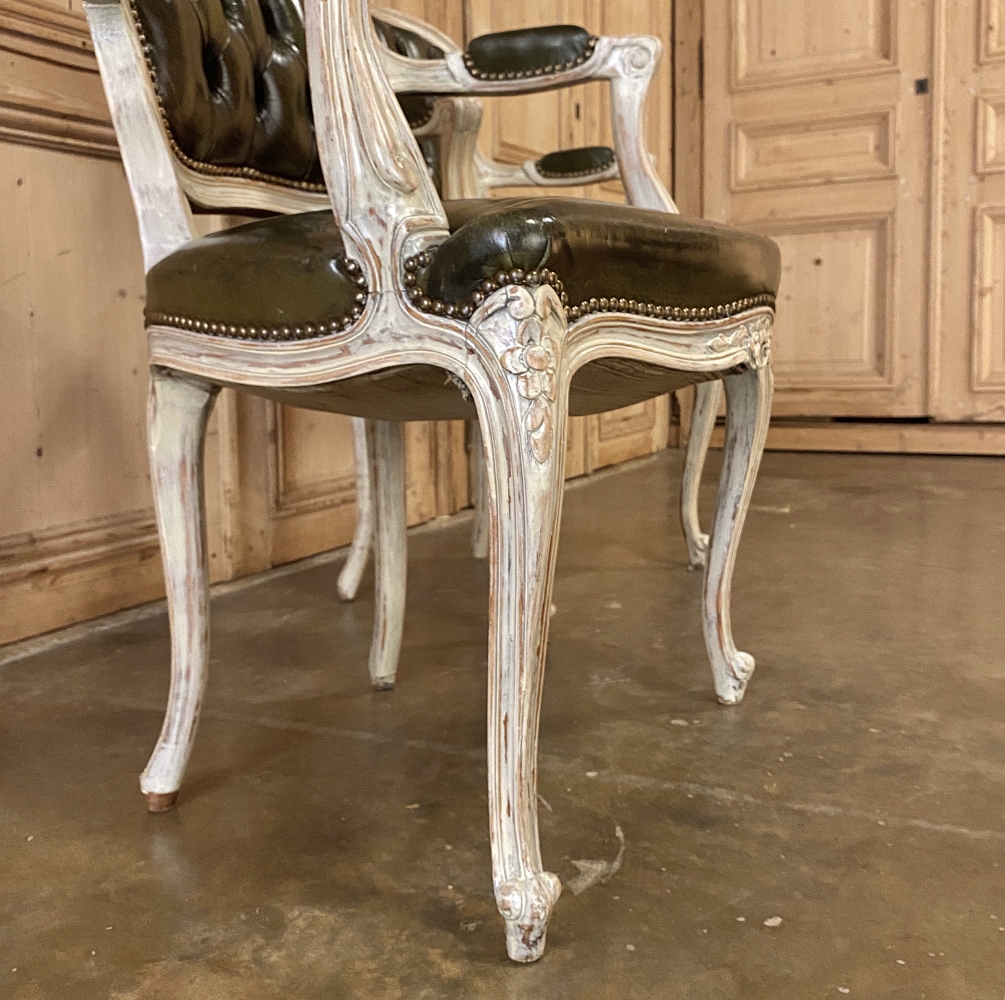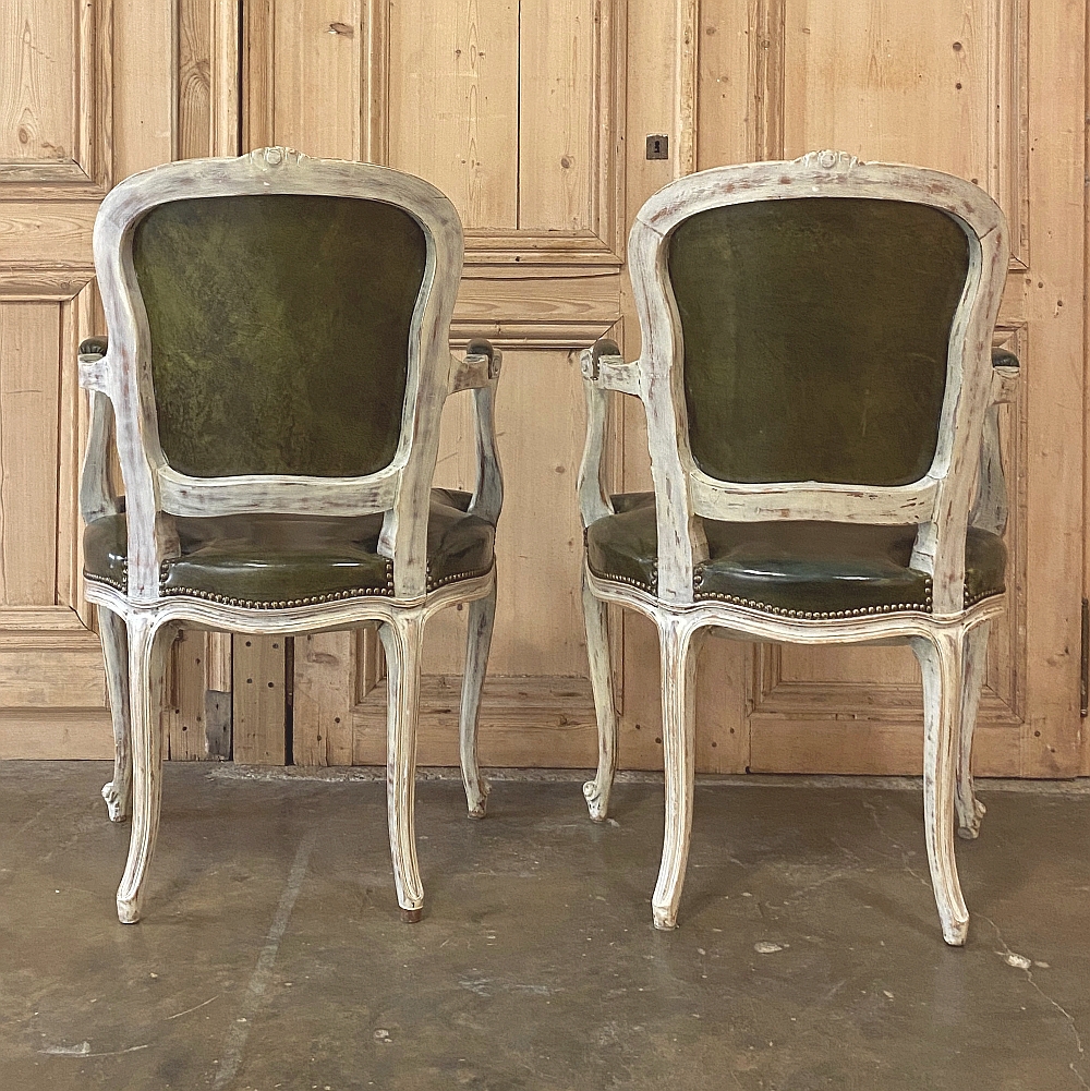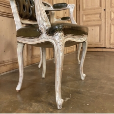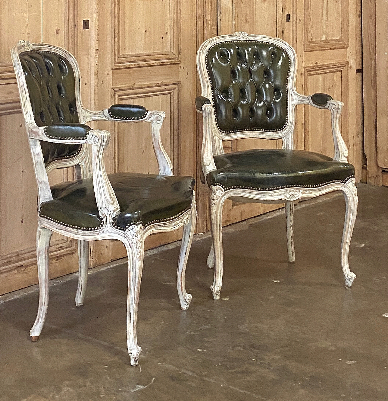 Pair Antique French Louis XV Painted Armchairs with Leather represent the epitome of the style, with gracefully contoured frameworks emulating the forms of nature, surrounding the ergonomically tufted seatback and generous seat. Scrolled armrest supports mirror the scrolled curvatures of the cabriole legs below. Ornamentation includes hand-carved floral and foliate motifs from the seatback crown to the escargots on the tips of the feet. The painted finish enhances the carved detail creating a splendid visual presence.