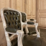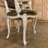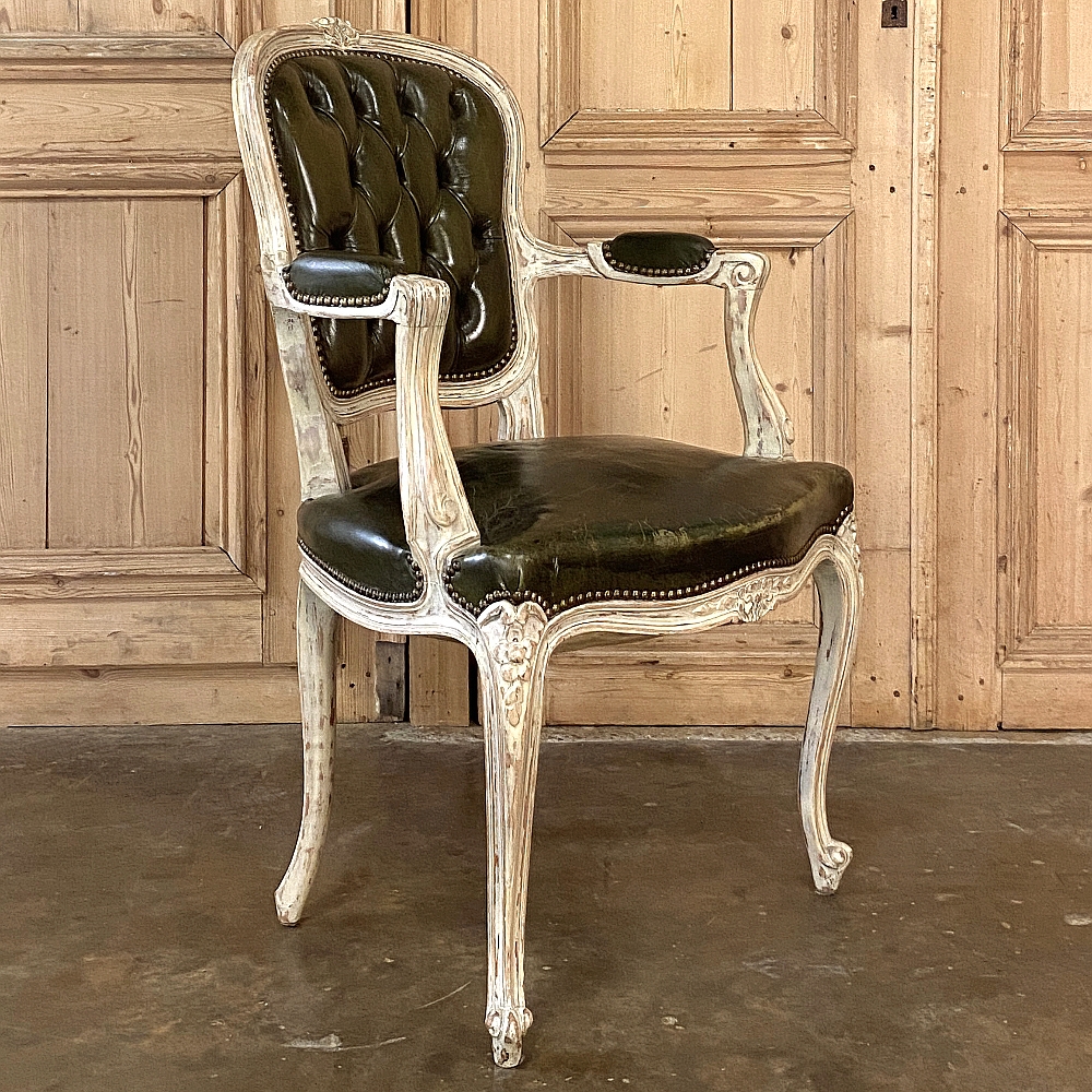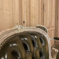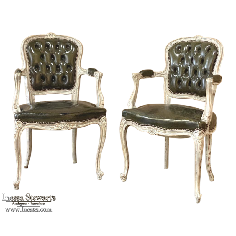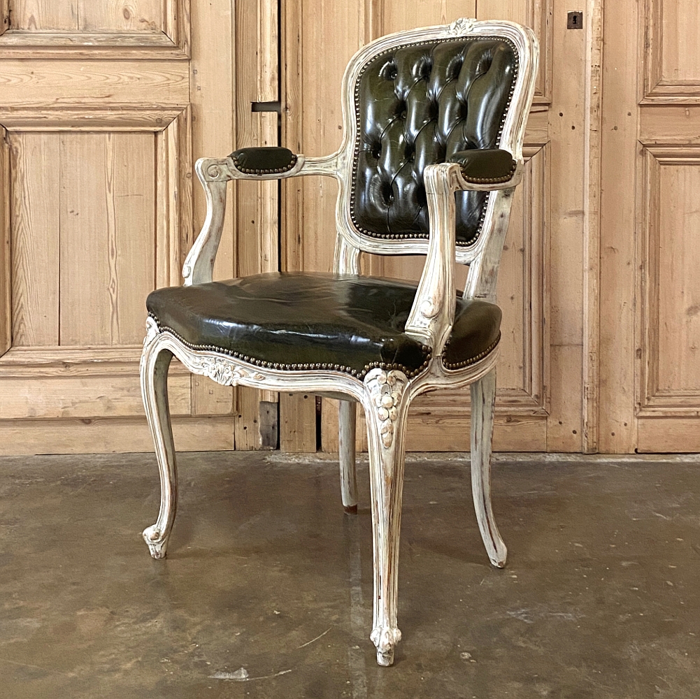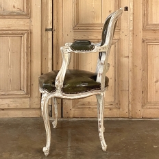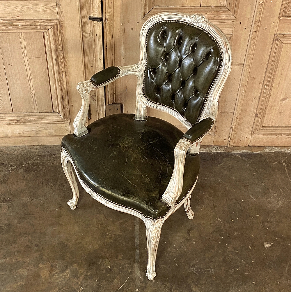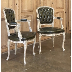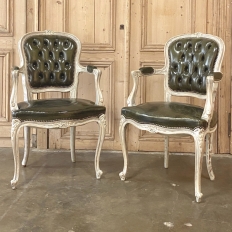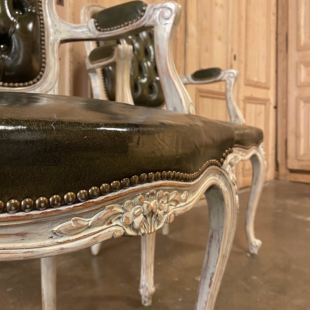 Pair Antique French Louis XV Painted Armchairs with Leather represent the epitome of the style, with gracefully contoured frameworks emulating the forms of nature, surrounding the ergonomically tufted seatback and generous seat. Scrolled armrest supports mirror the scrolled curvatures of the cabriole legs below. Ornamentation includes hand-carved floral and foliate motifs from the seatback crown to the escargots on the tips of the feet. The painted finish enhances the carved detail creating a splendid visual presence.