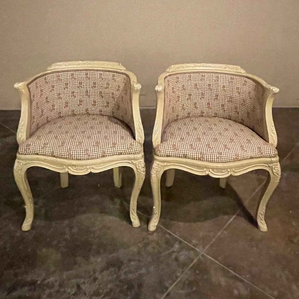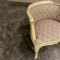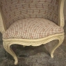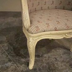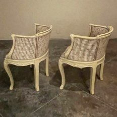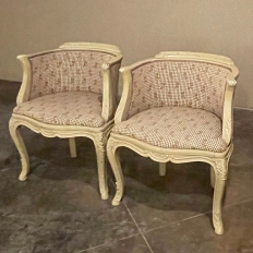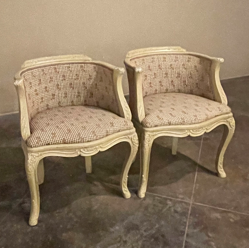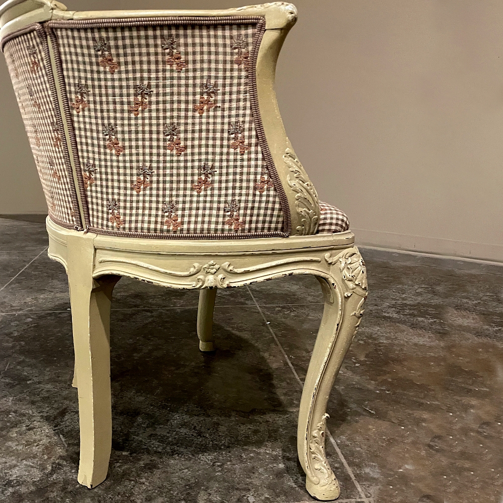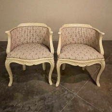 SalePair Antique French Louis XV Painted Bergeres ~ Armchairs will add a delightful accent to your interior decor, plus surprisingly comfortable occasional seating. Featuring a wraparound seatback that transitions into the armrests, the seatback is fully upholstered to match the seat, all in a durable, earth-toned tapestry fabric. The painted finish has achieved a lovely patina with just the right amount of distressing to accentuate the carved detailing which includes various floral, foliate and shell motifs from the seatback crown to the tips and bases of the armrests, to the apron and beautifully scrolled cabriole legs below. Even the backs are fully upholstered making this pair an excellent choice for placement in the center of the room, if so desired!