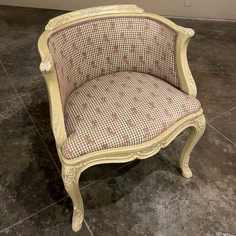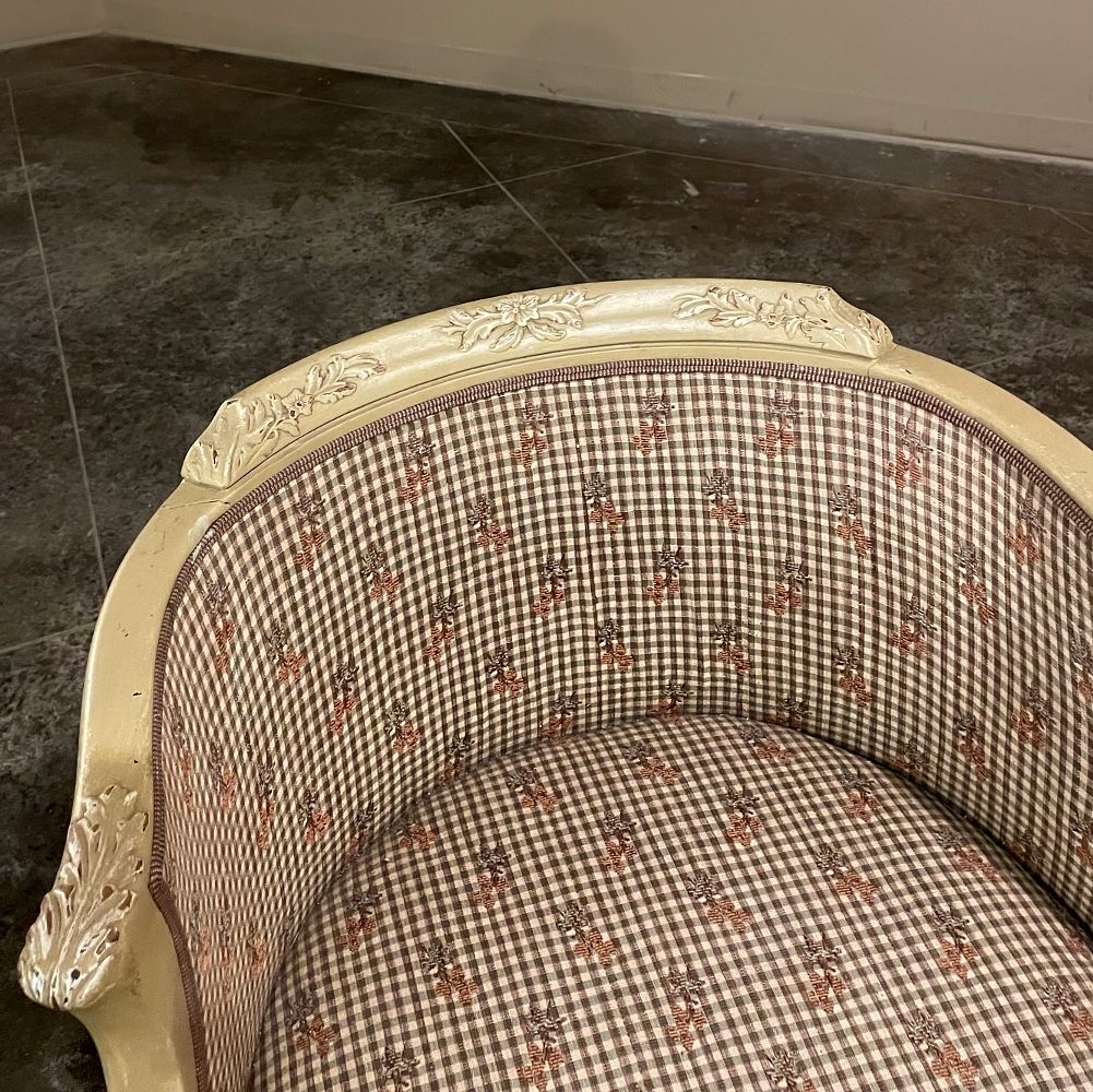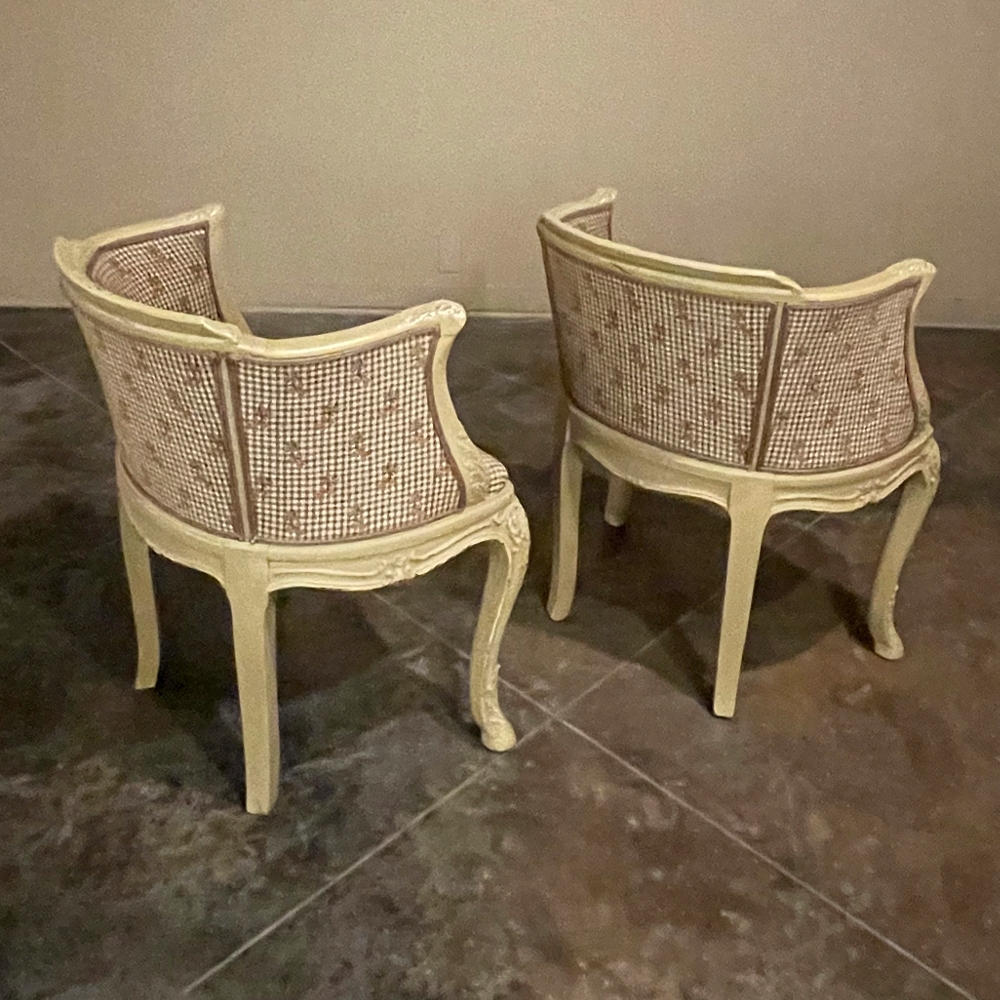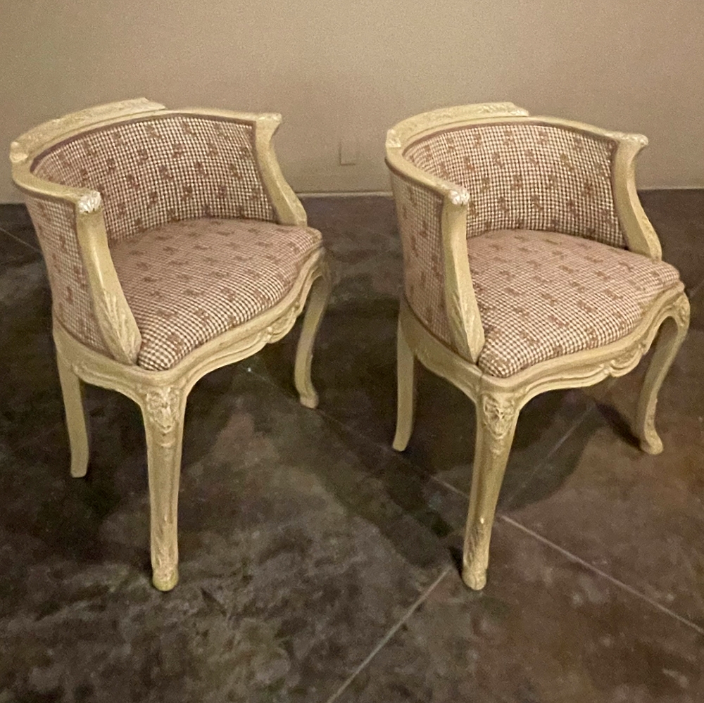 SalePair Antique French Louis XV Painted Bergeres ~ Armchairs will add a delightful accent to your interior decor, plus surprisingly comfortable occasional seating. Featuring a wraparound seatback that transitions into the armrests, the seatback is fully upholstered to match the seat, all in a durable, earth-toned tapestry fabric. The painted finish has achieved a lovely patina with just the right amount of distressing to accentuate the carved detailing which includes various floral, foliate and shell motifs from the seatback crown to the tips and bases of the armrests, to the apron and beautifully scrolled cabriole legs below. Even the backs are fully upholstered making this pair an excellent choice for placement in the center of the room, if so desired!