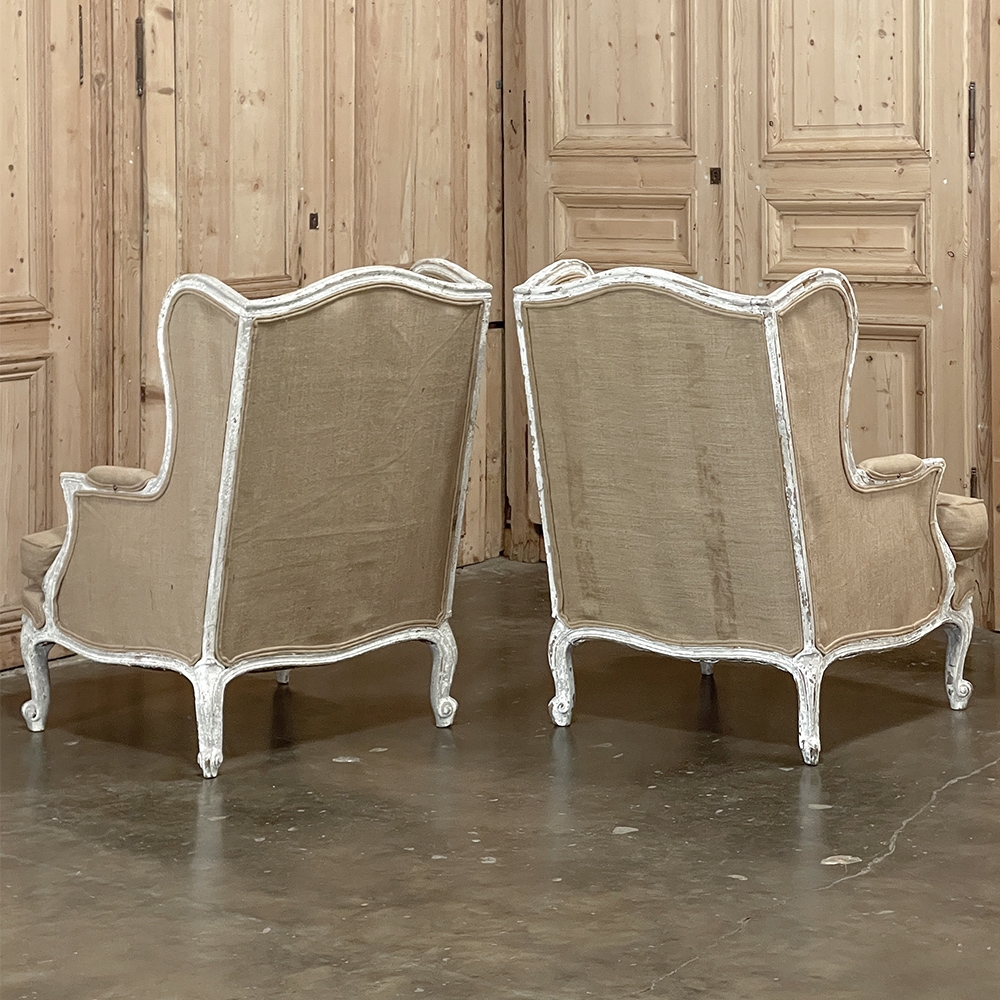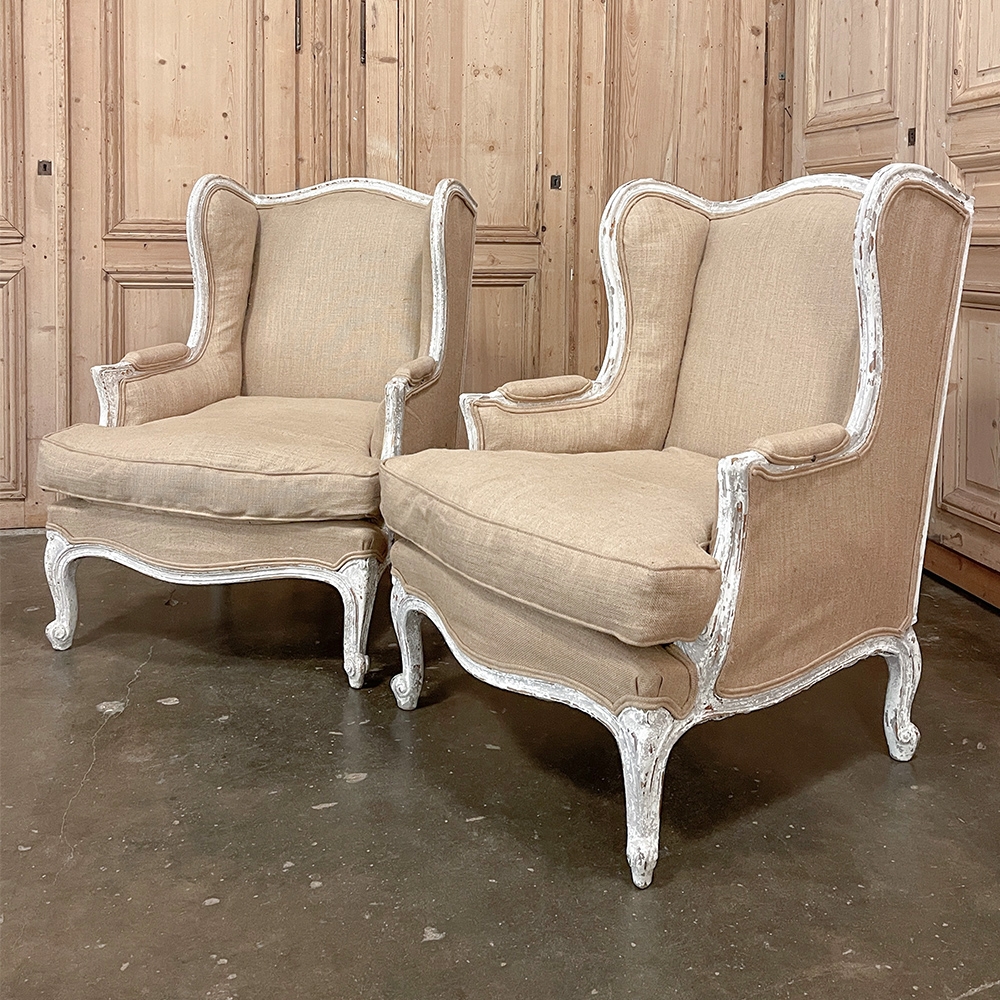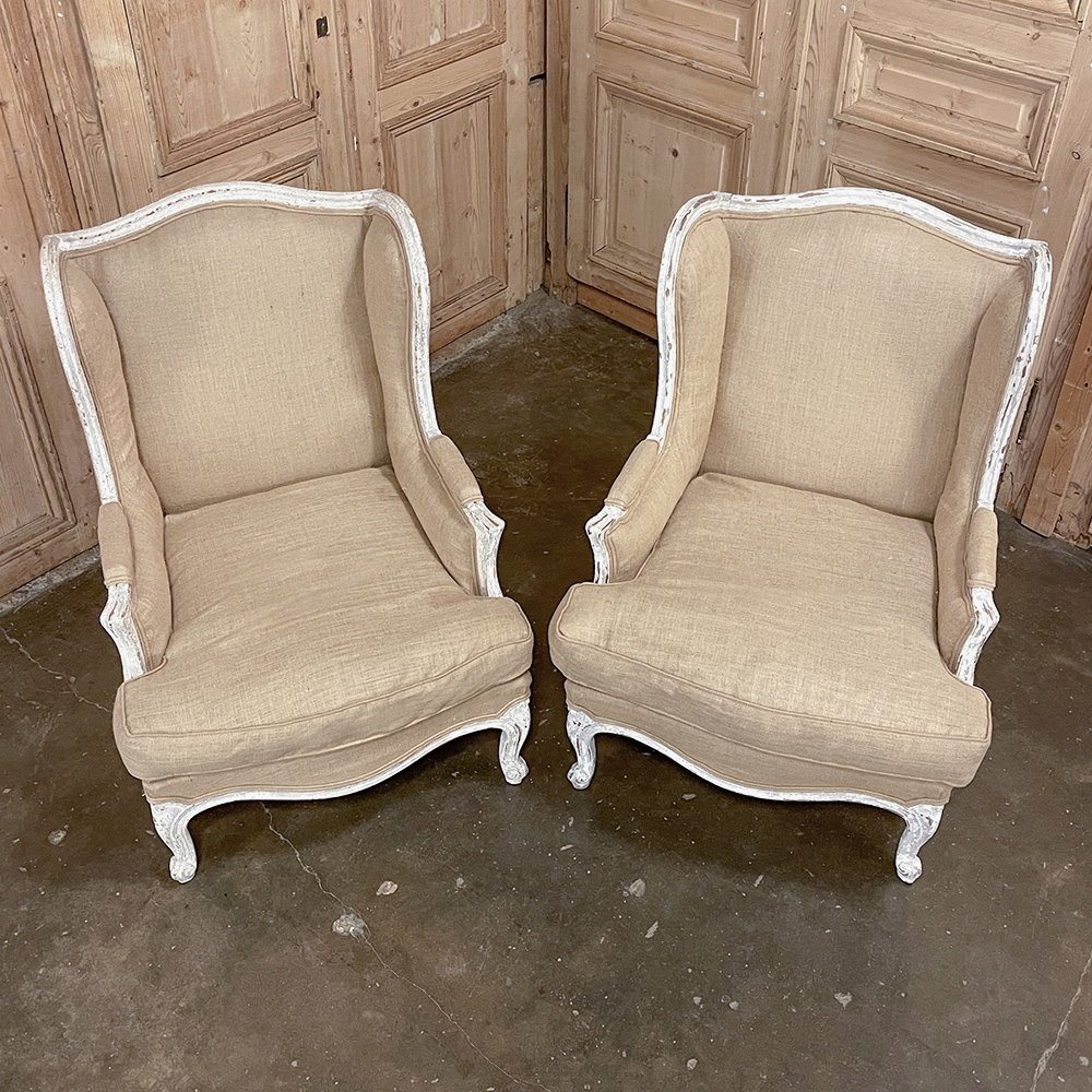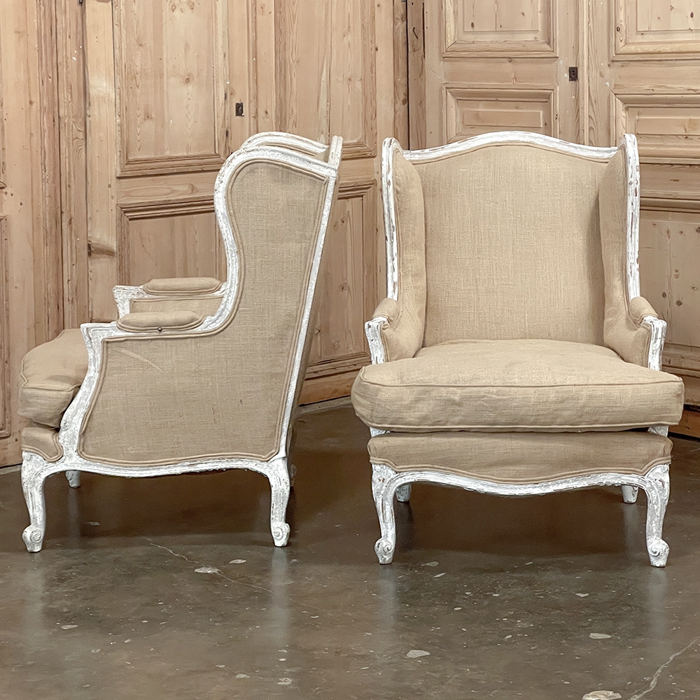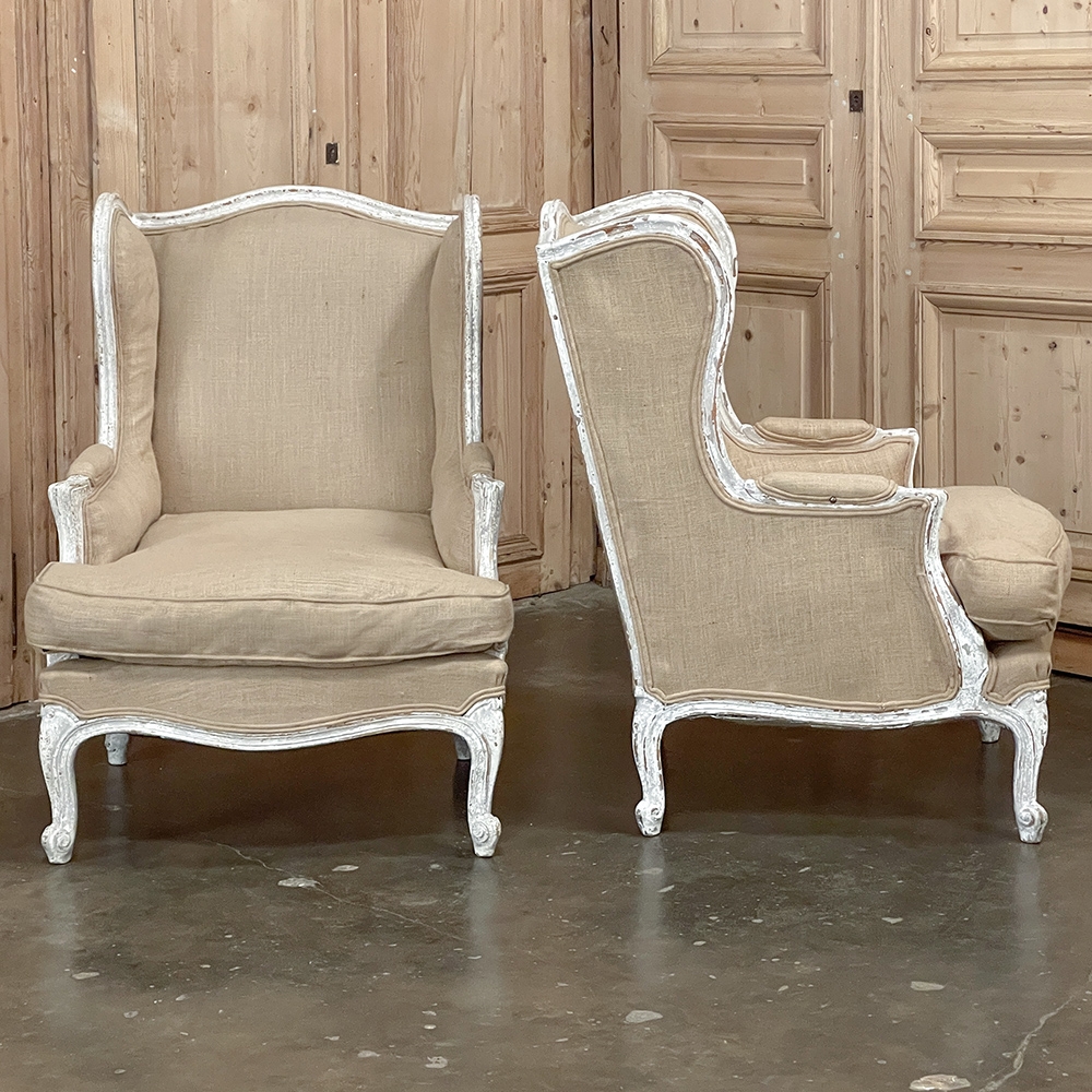 Pair Antique French Louis XV Painted Wingback Armchairs ~ Bergeres feature graceful naturalistic lines, a beautifully patinaed, distressed painted finish, and linen upholstery for a soft, comfortable effect! The tailored lines of this pair combined with the weathered finish to make them a perfect choice for the casual decor, the country french decor, or any rustic interior design. Relax as you melt into the wingback design which surrounds you in comfort, with padded armrests to make the experience complete!