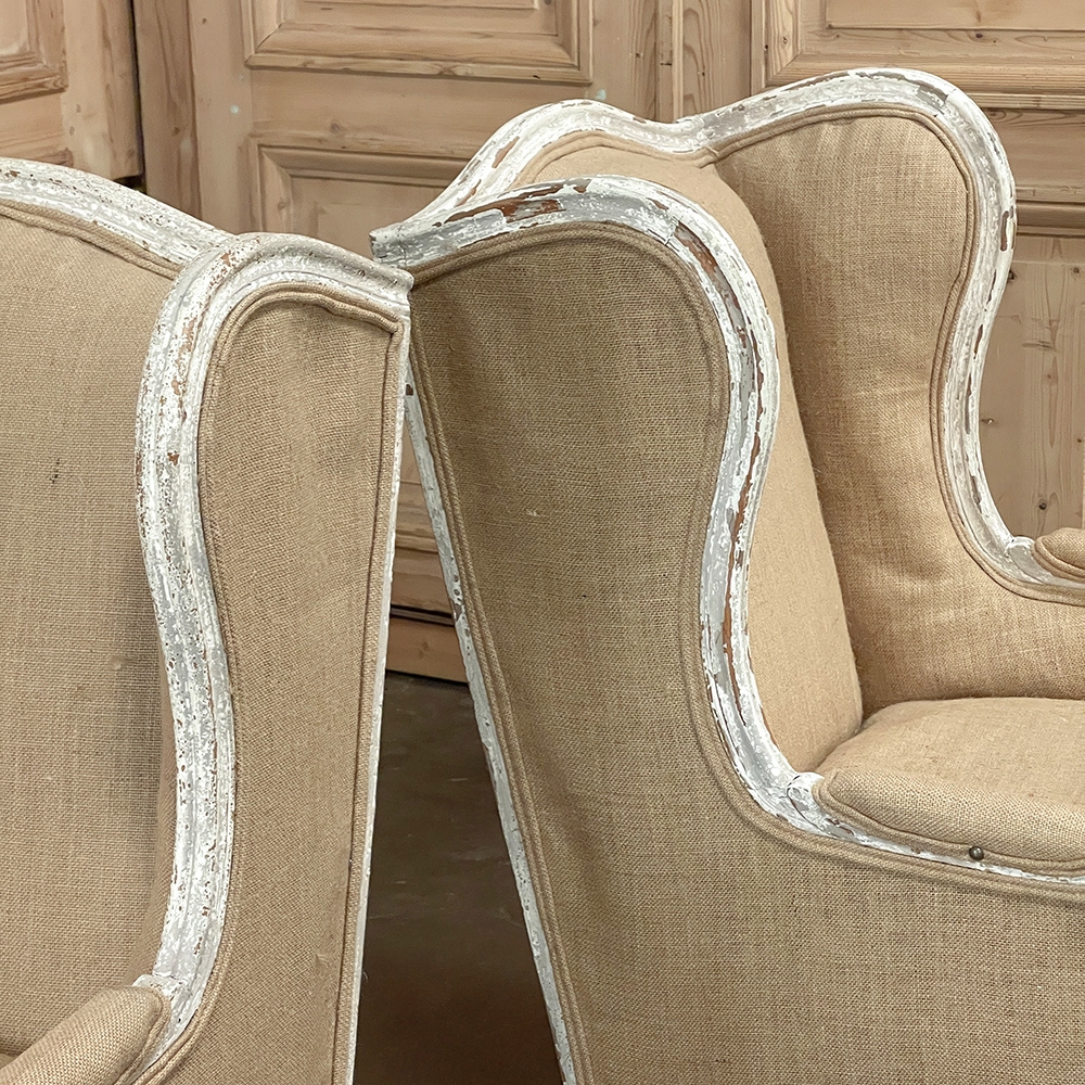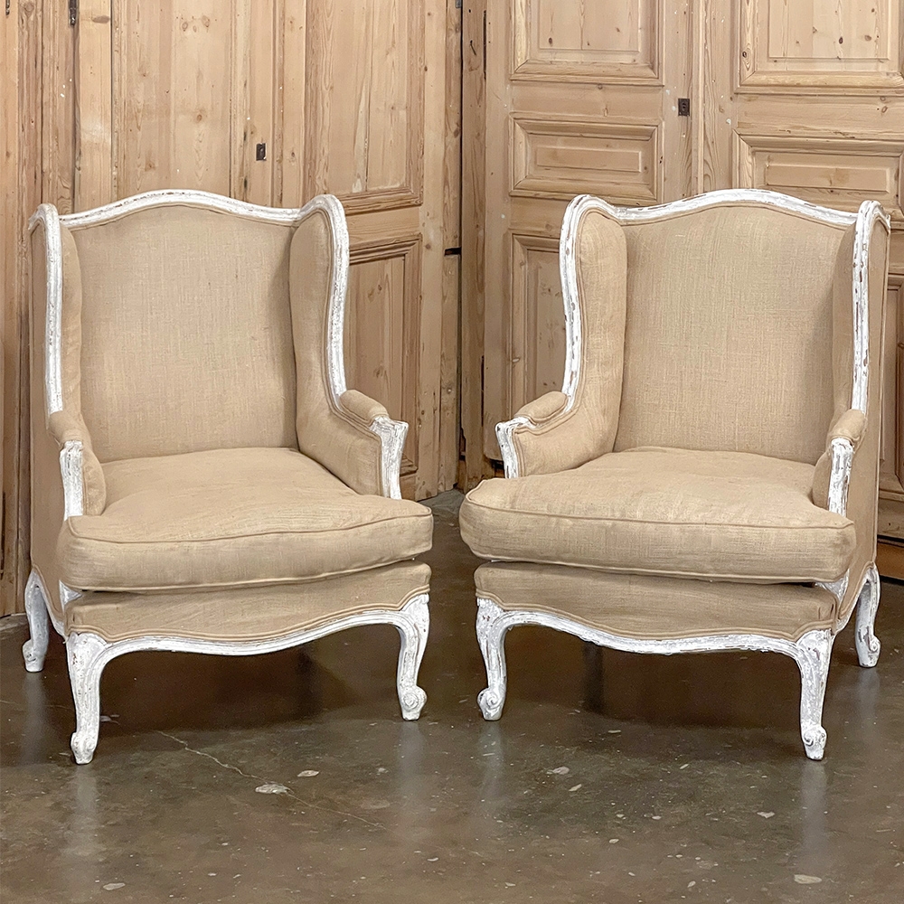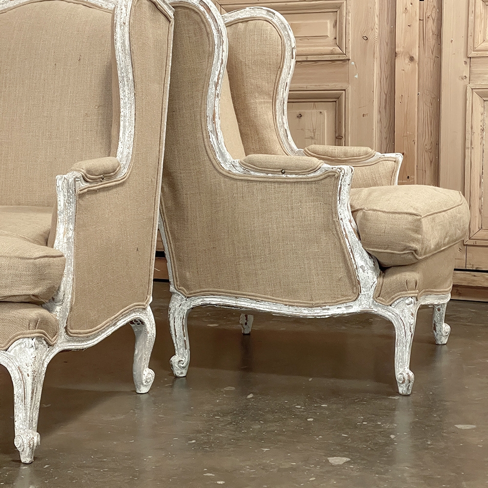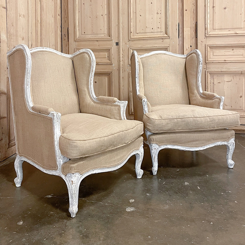 Pair Antique French Louis XV Painted Wingback Armchairs ~ Bergeres feature graceful naturalistic lines, a beautifully patinaed, distressed painted finish, and linen upholstery for a soft, comfortable effect! The tailored lines of this pair combined with the weathered finish to make them a perfect choice for the casual decor, the country french decor, or any rustic interior design. Relax as you melt into the wingback design which surrounds you in comfort, with padded armrests to make the experience complete!