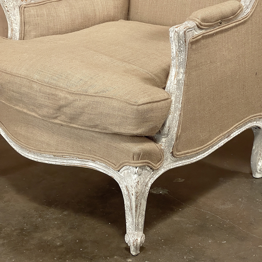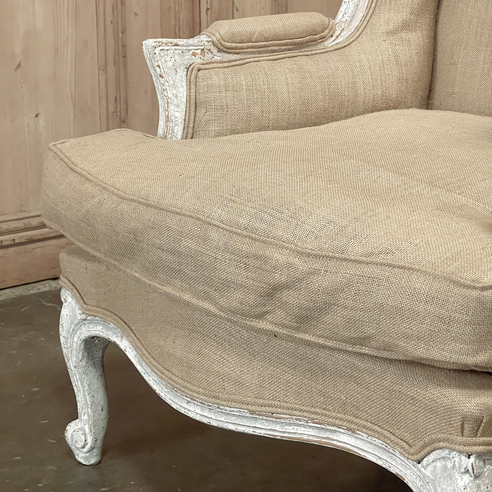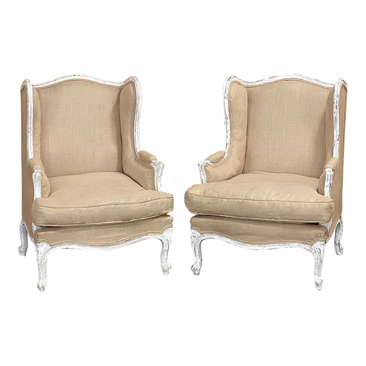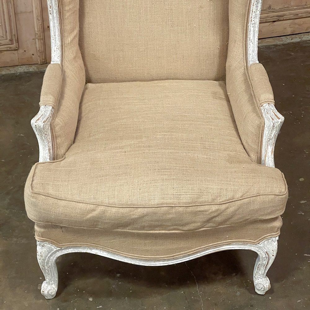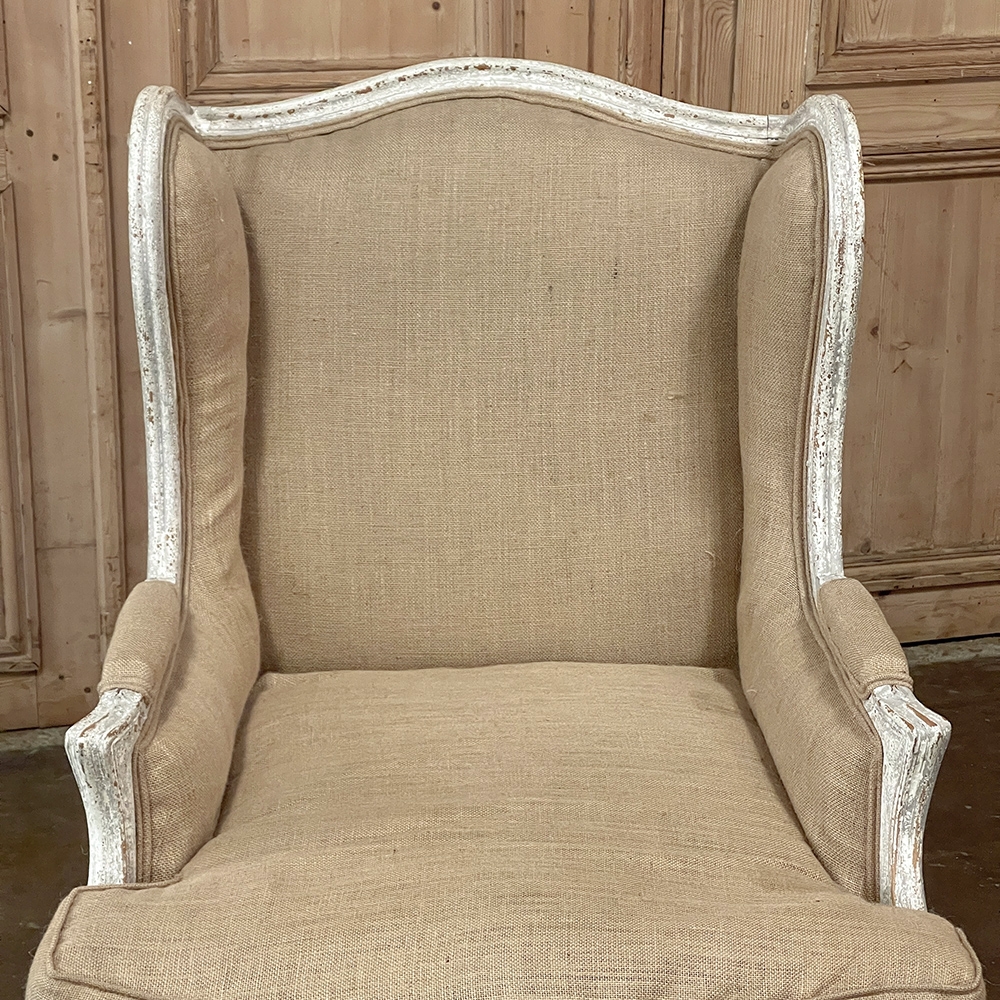 Pair Antique French Louis XV Painted Wingback Armchairs ~ Bergeres feature graceful naturalistic lines, a beautifully patinaed, distressed painted finish, and linen upholstery for a soft, comfortable effect! The tailored lines of this pair combined with the weathered finish to make them a perfect choice for the casual decor, the country french decor, or any rustic interior design. Relax as you melt into the wingback design which surrounds you in comfort, with padded armrests to make the experience complete!