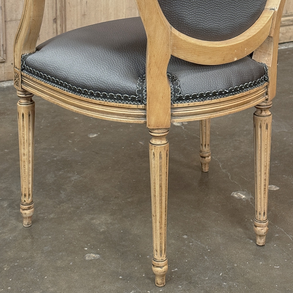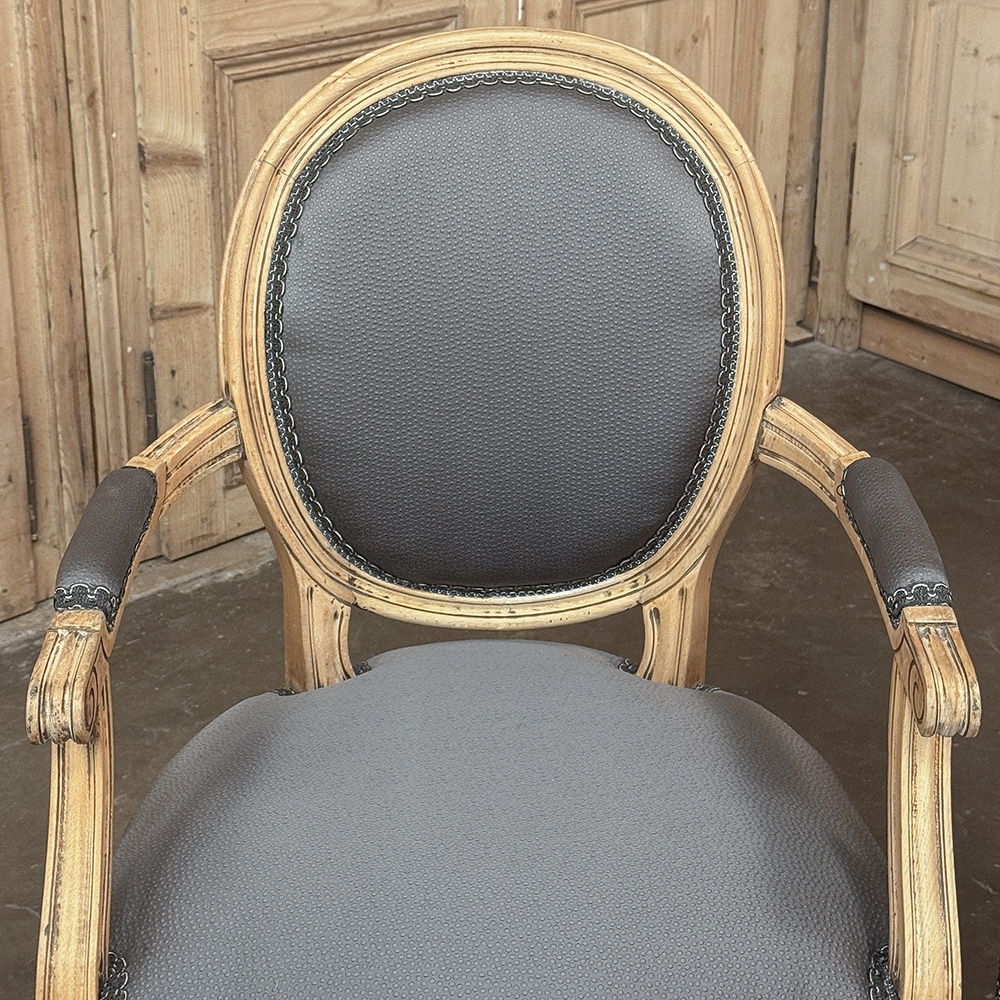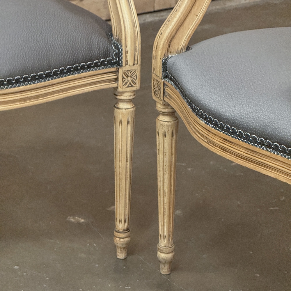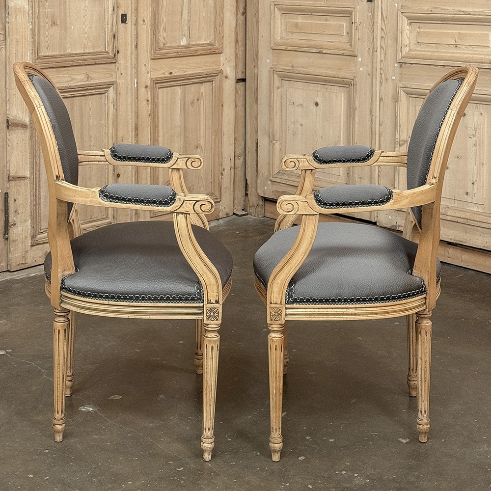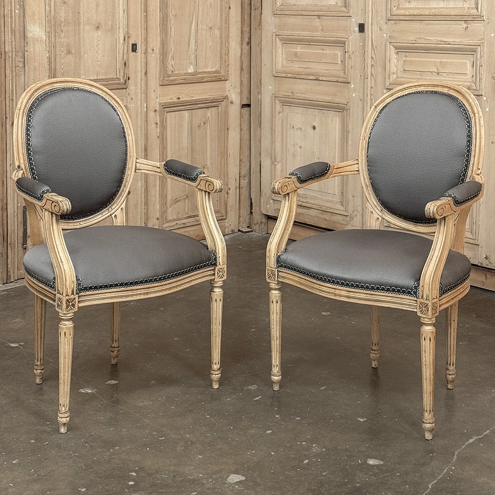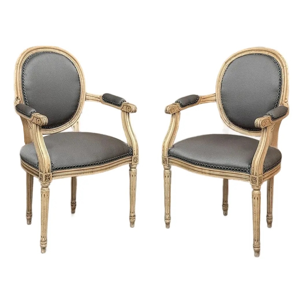 Pair Antique French Louis XVI Armchairs ~ Fauteuils feature a timeless design with a contemporary finish. The solid maple frames have been subtly antiqued but retain their natural color for a lighter visual effect. The classical architecture includes oval, contoured seat backs, elegantly curved and padded armrests supported by scrolled arms, and four tapered and fluted legs for support around the generously sized seat. Carved accents of rosettes add a nice effect. Reupholstered in a faux leather with matching gimp prior to our acquisition, the upholstery is in great shape and of a neutral gray perfect for blending with a wide palette of color schemes.