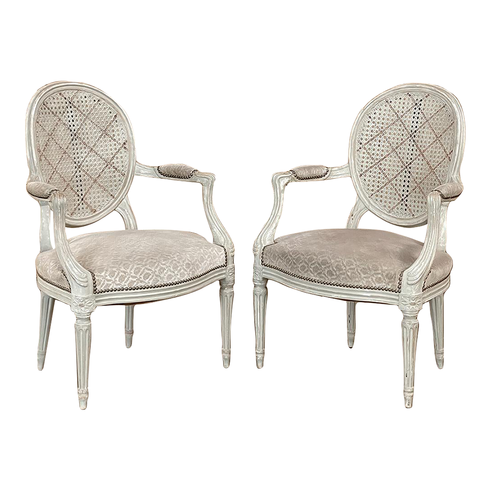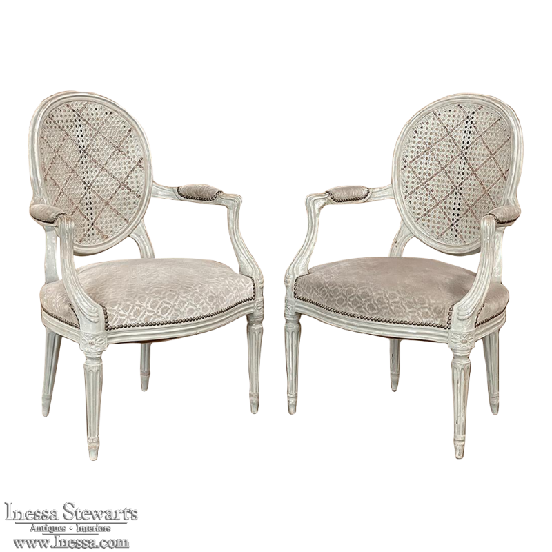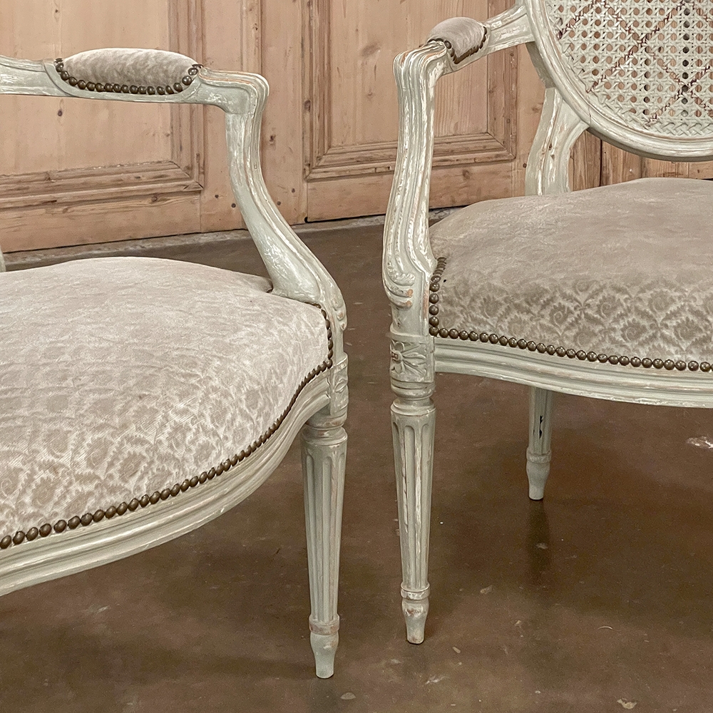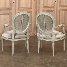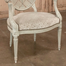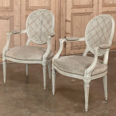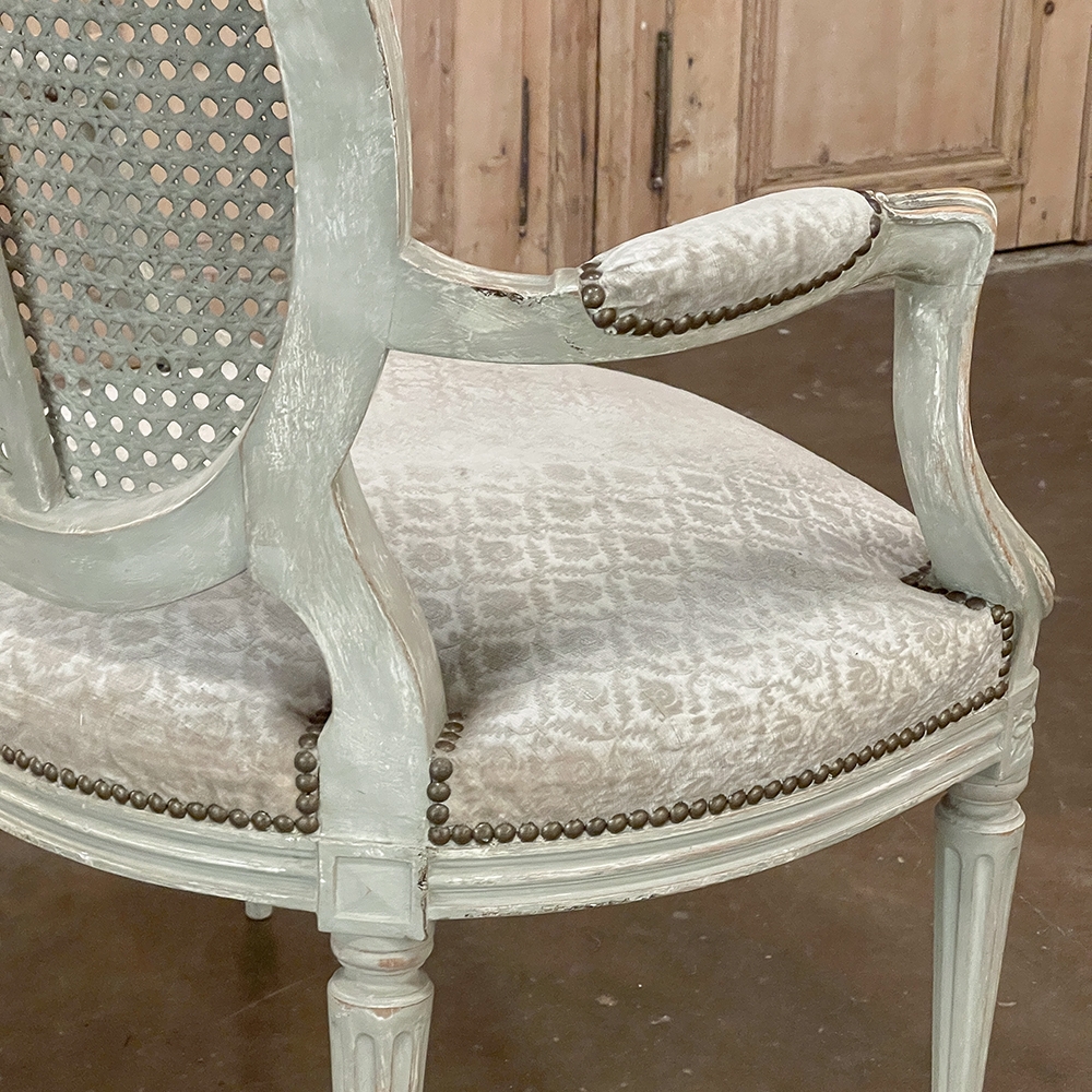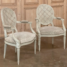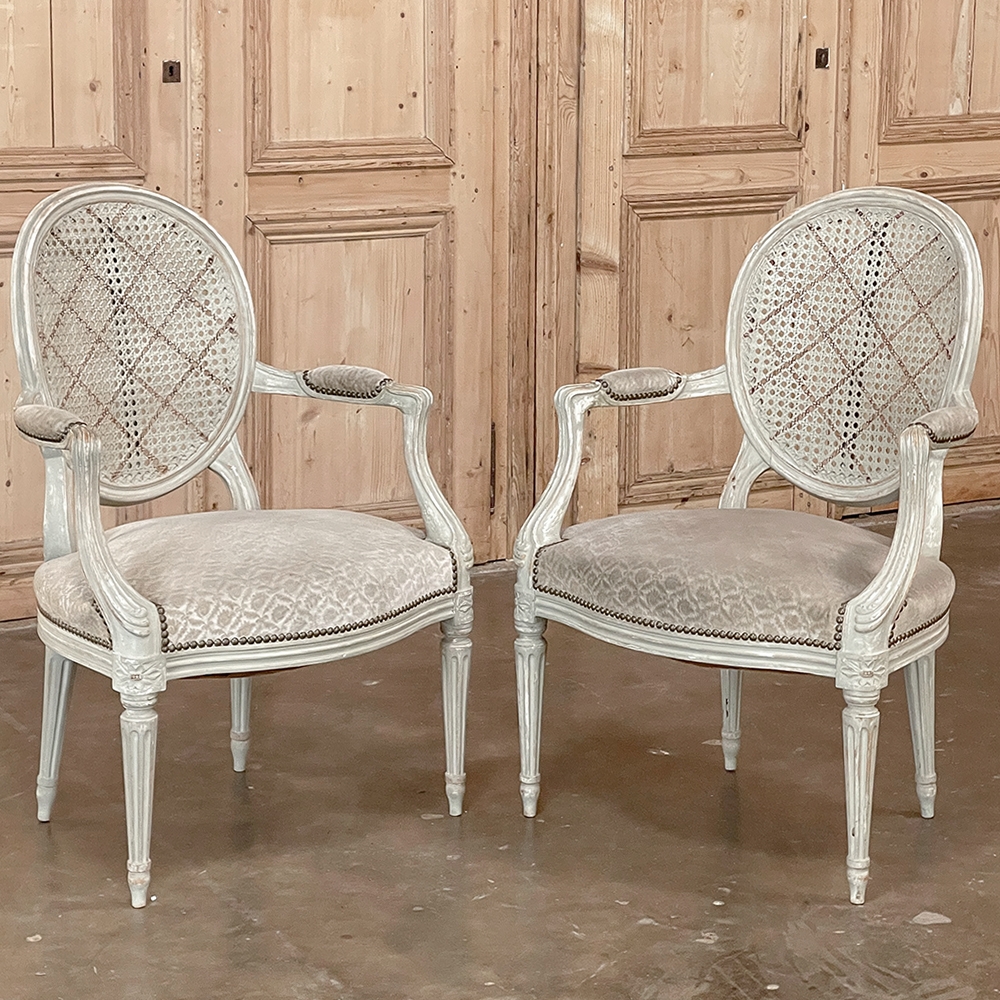 Pair Antique French Louis XVI Painted Armchairs with Cane and Fabric will make a great addition to any room. The classical styling inspired by ancient Greek and Roman architecture has never gone out of style for three millennia, and this version features ergonomic, beautifully upholstered seats coupled with contoured, oval seatbacks fitted with cane for a lightweight, breathable backing that you'll really appreciate on warmer days. The fabric is a repeating diamond damascene style, echoing the diamond tinting pattern on the cane. The padded armrests are connected to elegantly contoured and carved supports, while the entire chair rests upon a tailored apron with four tapered and fluted legs, which join to the seat frame with rounded rosette-adorned plinths in the front, and pyramidal plinths in the back, making the chairs attractive from all angles!