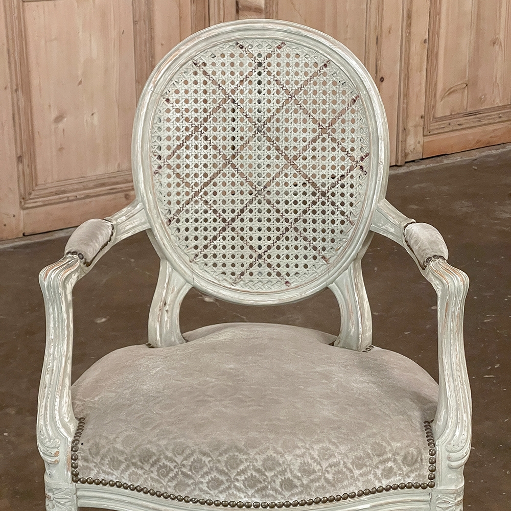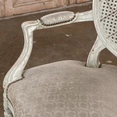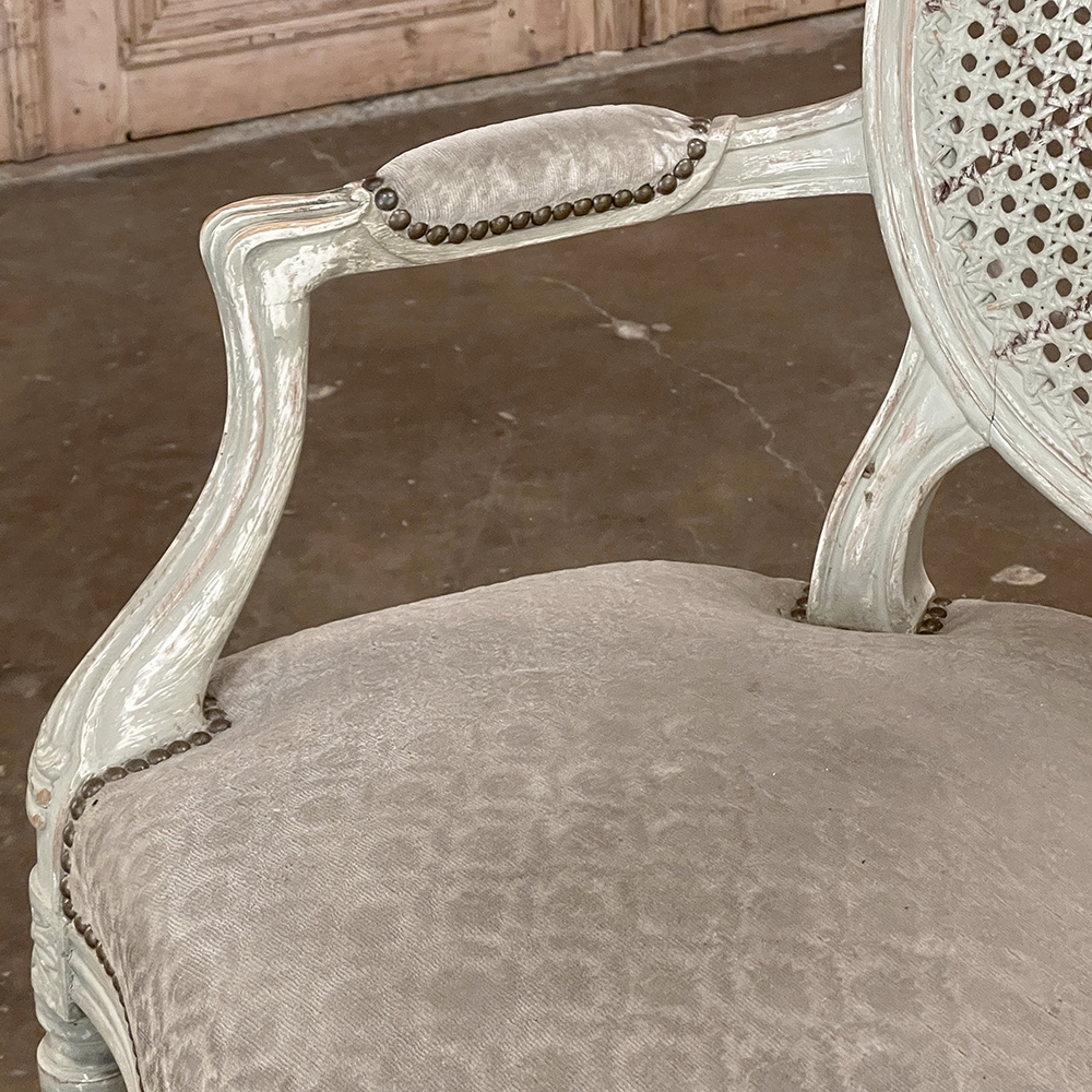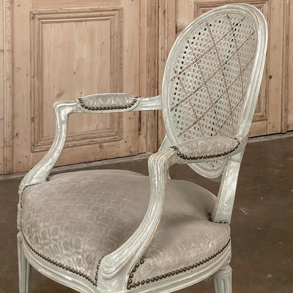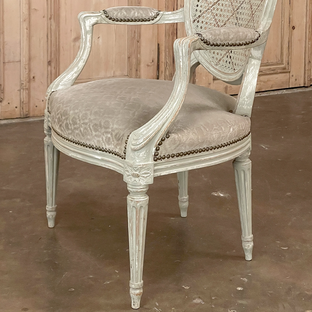 Pair Antique French Louis XVI Painted Armchairs with Cane and Fabric will make a great addition to any room. The classical styling inspired by ancient Greek and Roman architecture has never gone out of style for three millennia, and this version features ergonomic, beautifully upholstered seats coupled with contoured, oval seatbacks fitted with cane for a lightweight, breathable backing that you'll really appreciate on warmer days. The fabric is a repeating diamond damascene style, echoing the diamond tinting pattern on the cane. The padded armrests are connected to elegantly contoured and carved supports, while the entire chair rests upon a tailored apron with four tapered and fluted legs, which join to the seat frame with rounded rosette-adorned plinths in the front, and pyramidal plinths in the back, making the chairs attractive from all angles!