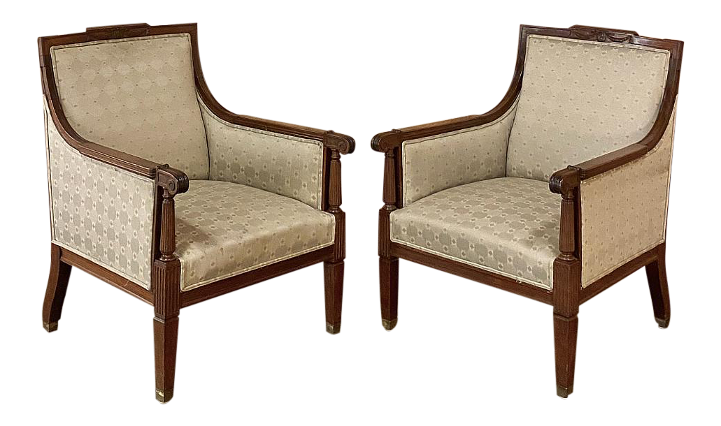 SalePair Antique French Louis XVI Walnut Armchairs ~ Bergeres was created with timeless neoclassical style! The tailored framework is accented by a subtly arched seat back centered with a wreath, ribbon and laurel swag motif in bas relief. The armrests curve away from the back gracefully and terminate in a scroll just above the tapered and fluted column support, which ties into the front leg. Feet are tipped in brass caps for stylish protection. Upholstery is serviceable but easily replaced with your coordinating fabric. Designed in a diminutive proportion perfect for cozy seating nooks.
