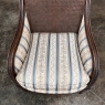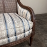 Pair Antique French Louis XVI Walnut Upholstered Bergeres ~ Armchairs is the perfect choice for comfortable seating in any room of the home or office. The frames features bold classical contours inspired by the ancient Greek and Roman civilizations that are adeptly carved in the manner of Louis XVI with motifs such as Greek coin and acanthus plumes with beading and fluting accents. The side arms are gracefully contoured and upholstered on both sides, wrapping one with comfort. The seat back is caned for a light and airy look that is also particularly comfortable in the summer months. Tapered and fluted legs provide support. Upholstery is a fine silk Damask with cornflower blue stripes and light gold patterns fastened with brass tacks for a truly timeless look.